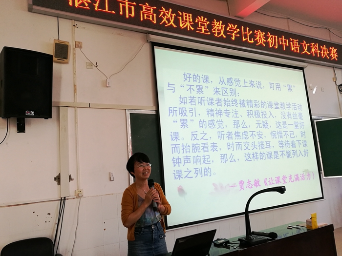 据悉,此次比赛由湛江市教育局语文教研室主办、湛江一中培才学校承办。它是我市深化教育教学改革、全面推动“高效课堂”建设关键时期的一次盛会,也成为了我市初中语文课堂教学改革成果的一次集中展示。经过层层选拔,共有来自全市各县区的13名优秀教师代表参与本次决赛角逐,岭南师范学院李斌辉教授、湛江市各县区语文教研员及湛江市一线骨干教师受邀担任评委,全市语文教师代表近500人齐聚于此观摩学习。