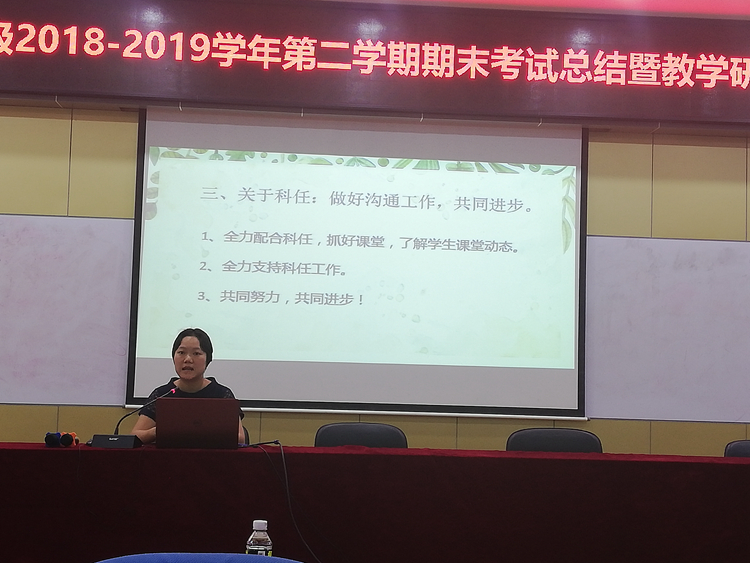 9月11日,我校初三全体教师齐聚学校图书馆一楼学术报告厅,参加2018—2019学年第二学期期末考试总结暨教学研讨会。会议由谭晓明级长主持,副校长、陈燕主任等领导出席了会议,并作了指导讲话。