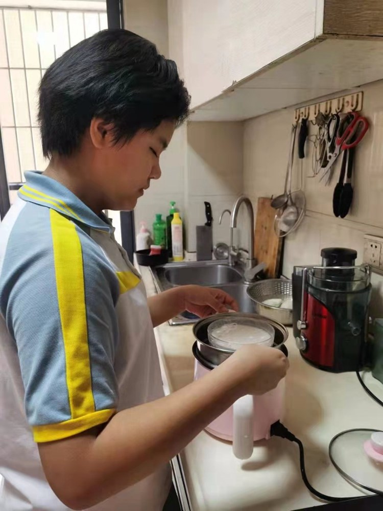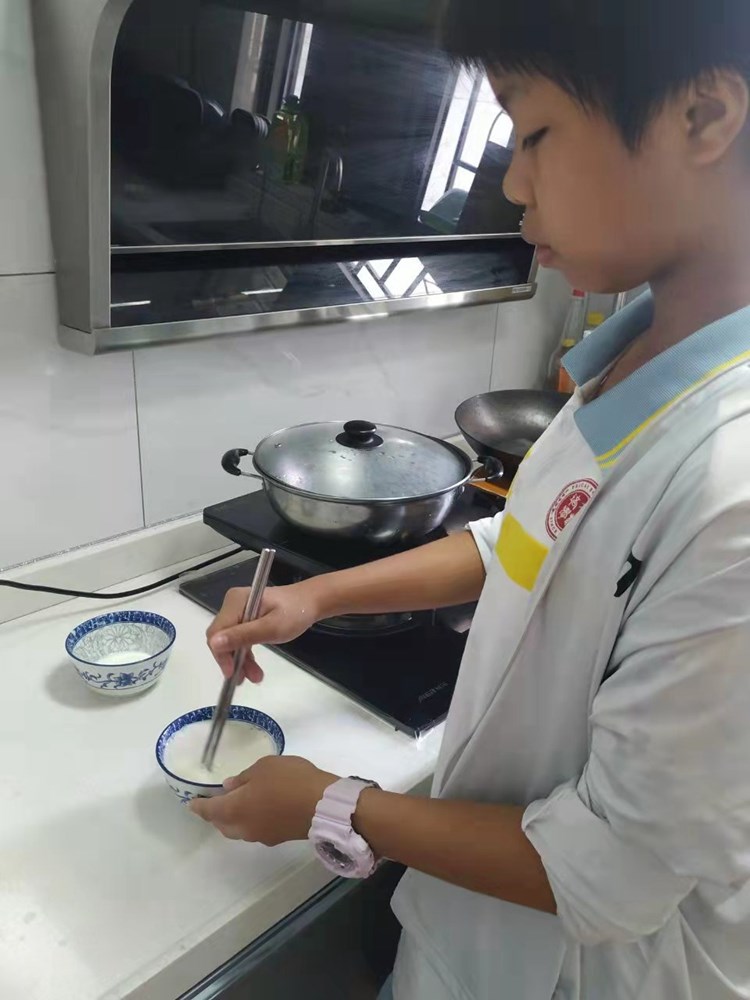 这课堂也发挥了家长在家庭教育中的主体作用,在家长的协助下,把学生操作过程和成品通过照片和视频的形式记录下来,分享到班级群、朋友圈中,一起享受劳动的喜悦。通过这节课学生不仅学会了如何制作电饭煲焖饭、双皮奶制作,重点培养学生的劳动技能,也让学生收获到了劳动的成果,激发了学生热爱劳动、辛勤劳动的热情,养成良好的生活习惯、劳动习惯,懂得劳动最光荣、劳动创造价值的道理。