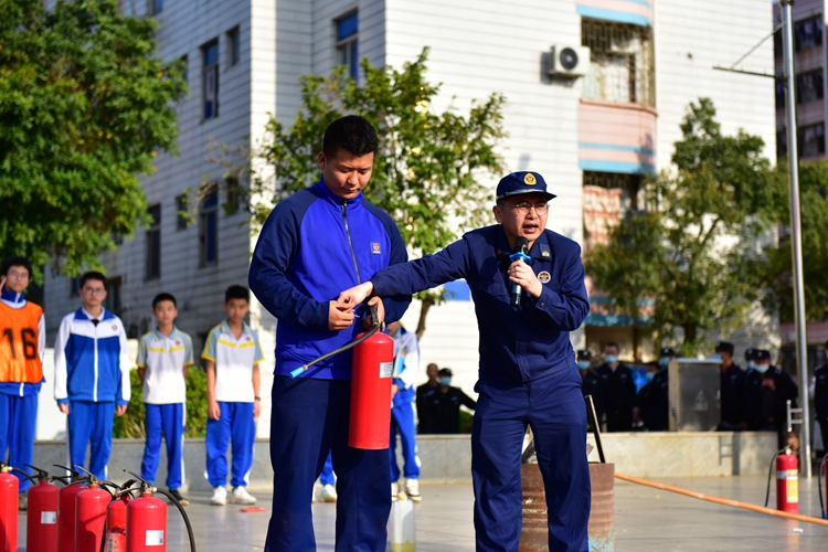 在保卫科工作人员的保护下,学生现场操作,实打实地掌握了一项真本领。为了让防灾应灾工作更加细致深入普及,门卫与生活老师皆对灭火器的使用进行了实践操作。
