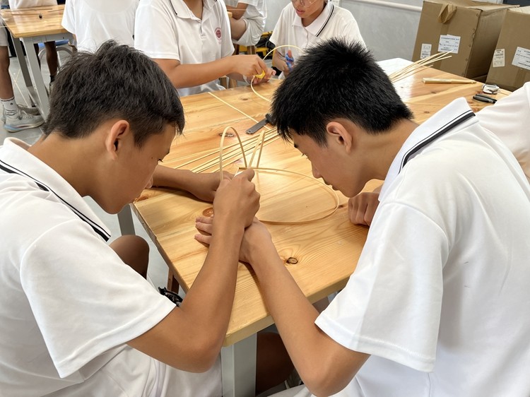 同学们还了解了遂溪狮头彩扎的制作技艺,包括选竹篾、扎骨架、扑纸、彩绘、缝布、配饰和点睛等工序。学生们以合作制作狮头的基本框架为主,亲自动手进行实践制作。在实践操作中,学生按照老师的指导,认真观察狮头尺寸比例和形状,通过反复练习,已逐渐掌握了遂溪狮头彩扎的制作技巧,并能够独立完成狮头基本框架的制作。