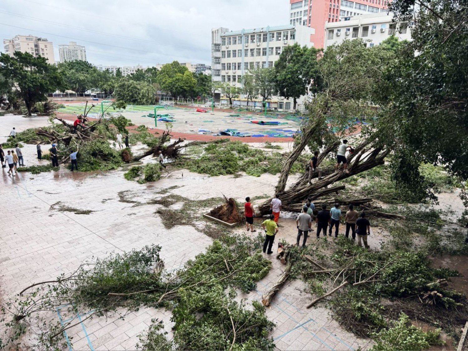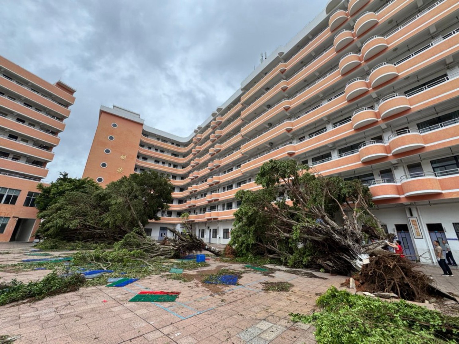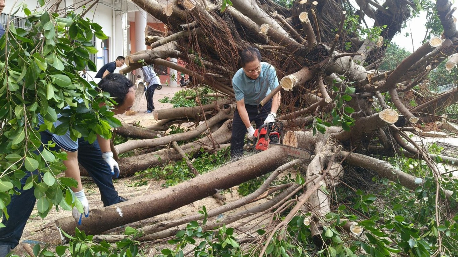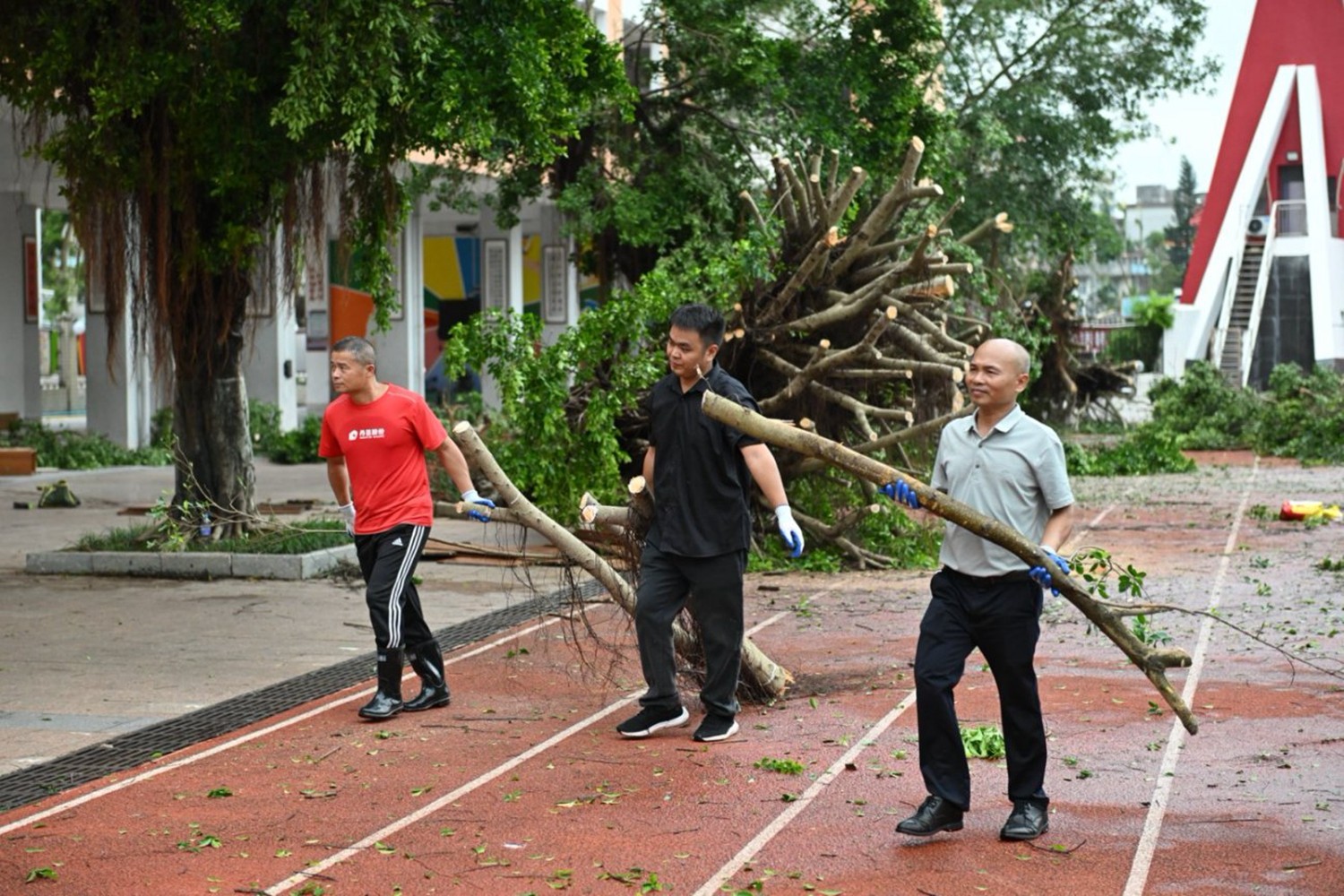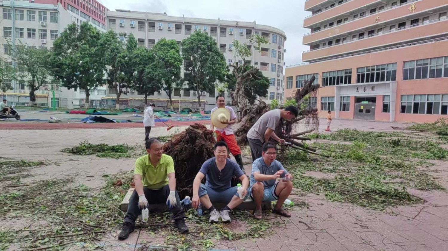 数棵大榕树被连根拔起,伏倒在地,如同大地的伤口。灾难留下的,不只是狼藉,更有挺身而出的身影。10月6日,从郑建忠总校长到后勤工作人员,近百人的队伍,从清晨到夜幕降临,砍、锯、扛、扫,用双手和汗水,为学校尽快恢复正常的教育教学秩序提供了保障。