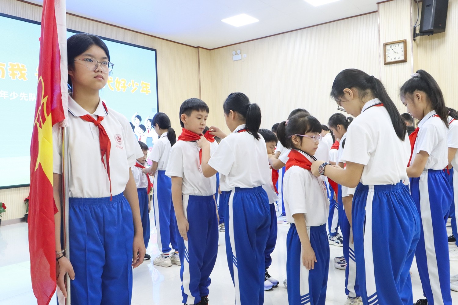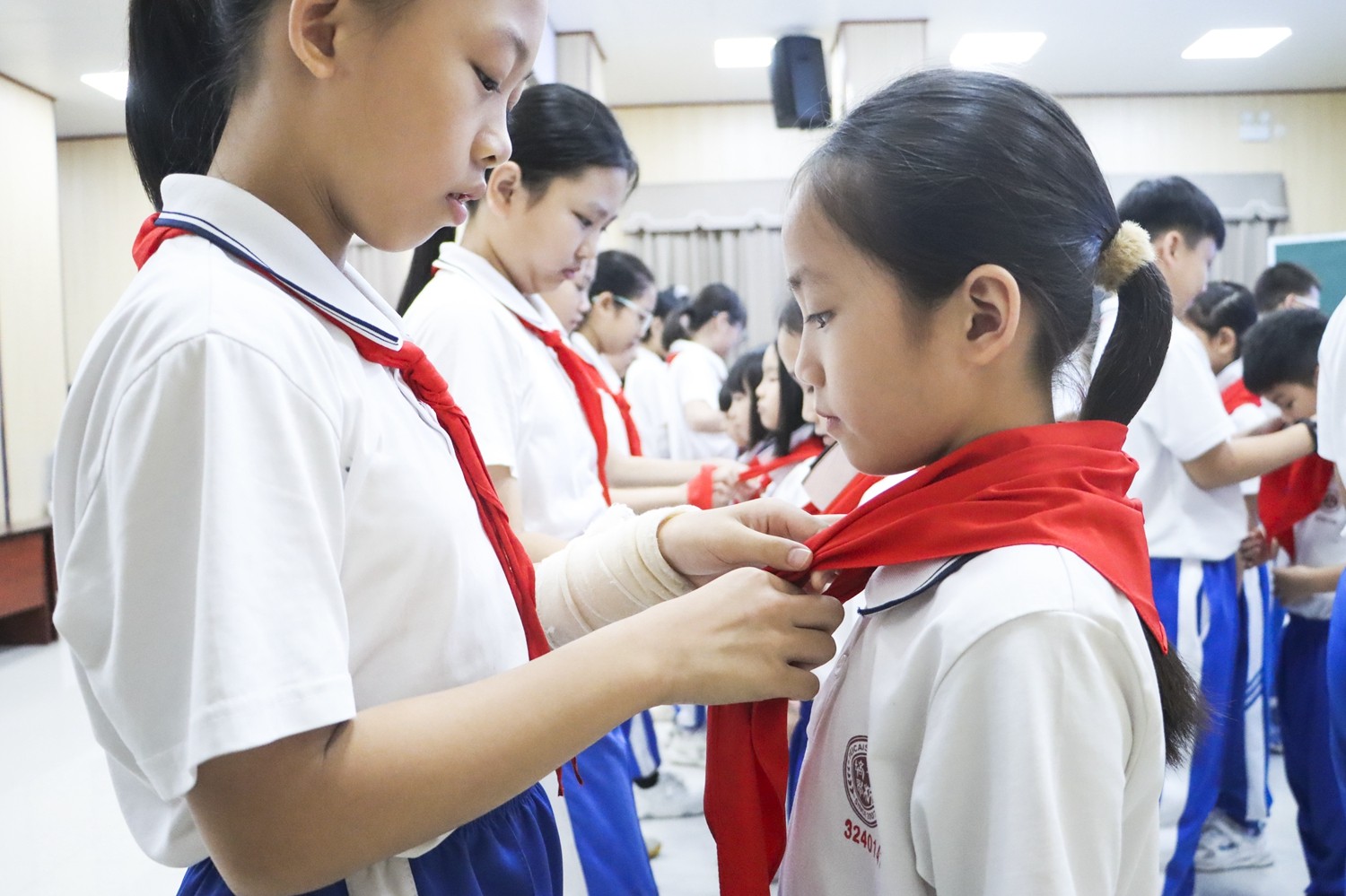 在庄重的乐曲声中,优秀少先队员代表为新队员佩戴红领巾。鲜艳的红领巾在胸前飘扬,象征着红色基因代代相传。新队员们精神抖擞,脸上洋溢着激动与自豪。