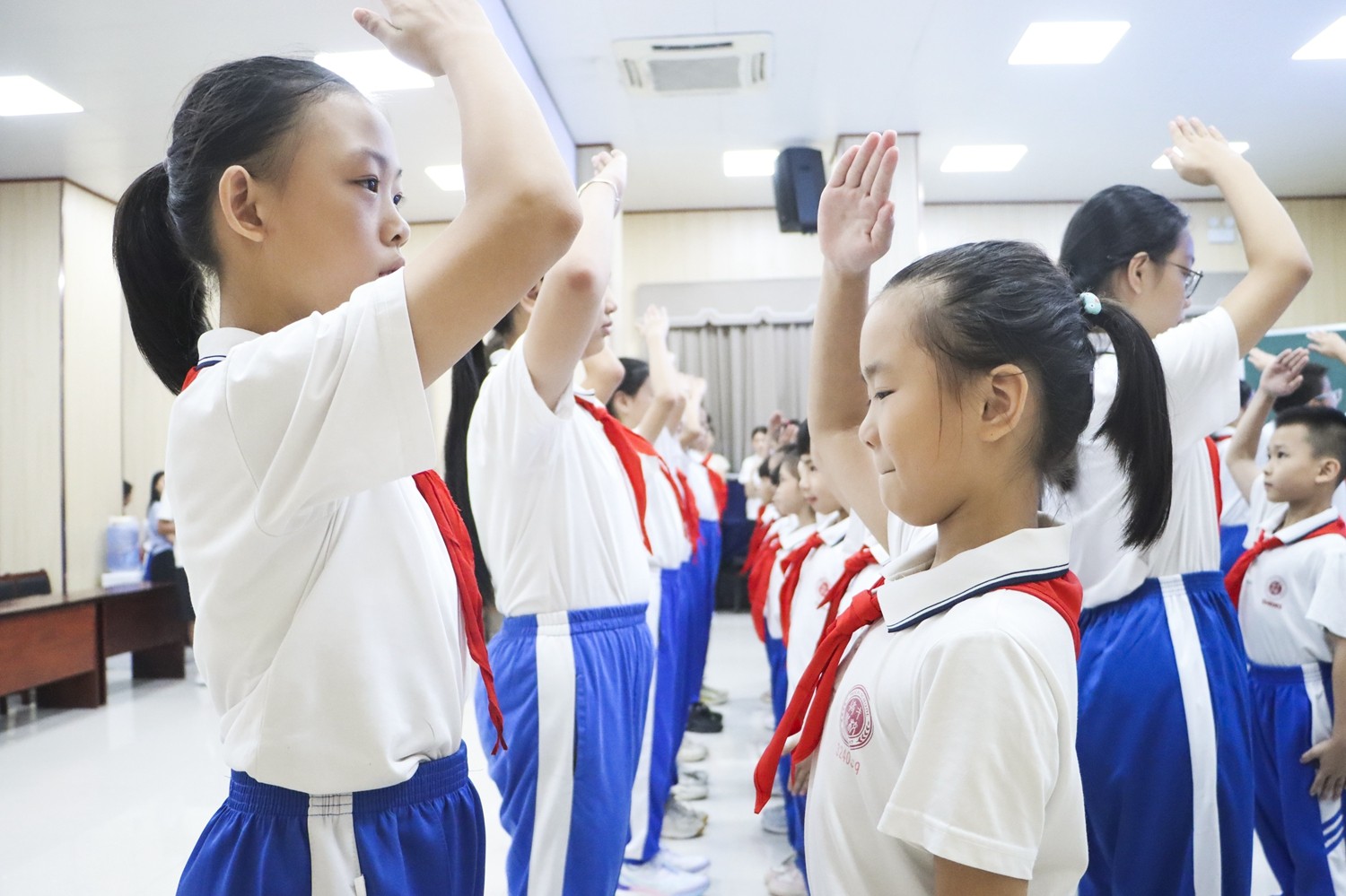 全体新队员右手握拳,在队旗下庄严宣誓:“我热爱中国共产党,热爱祖国,热爱人民,好好学习,好好锻炼。准备着:为共产主义事业贡献力量!”誓言铿锵,展现了新时代少先队员的昂扬风貌。