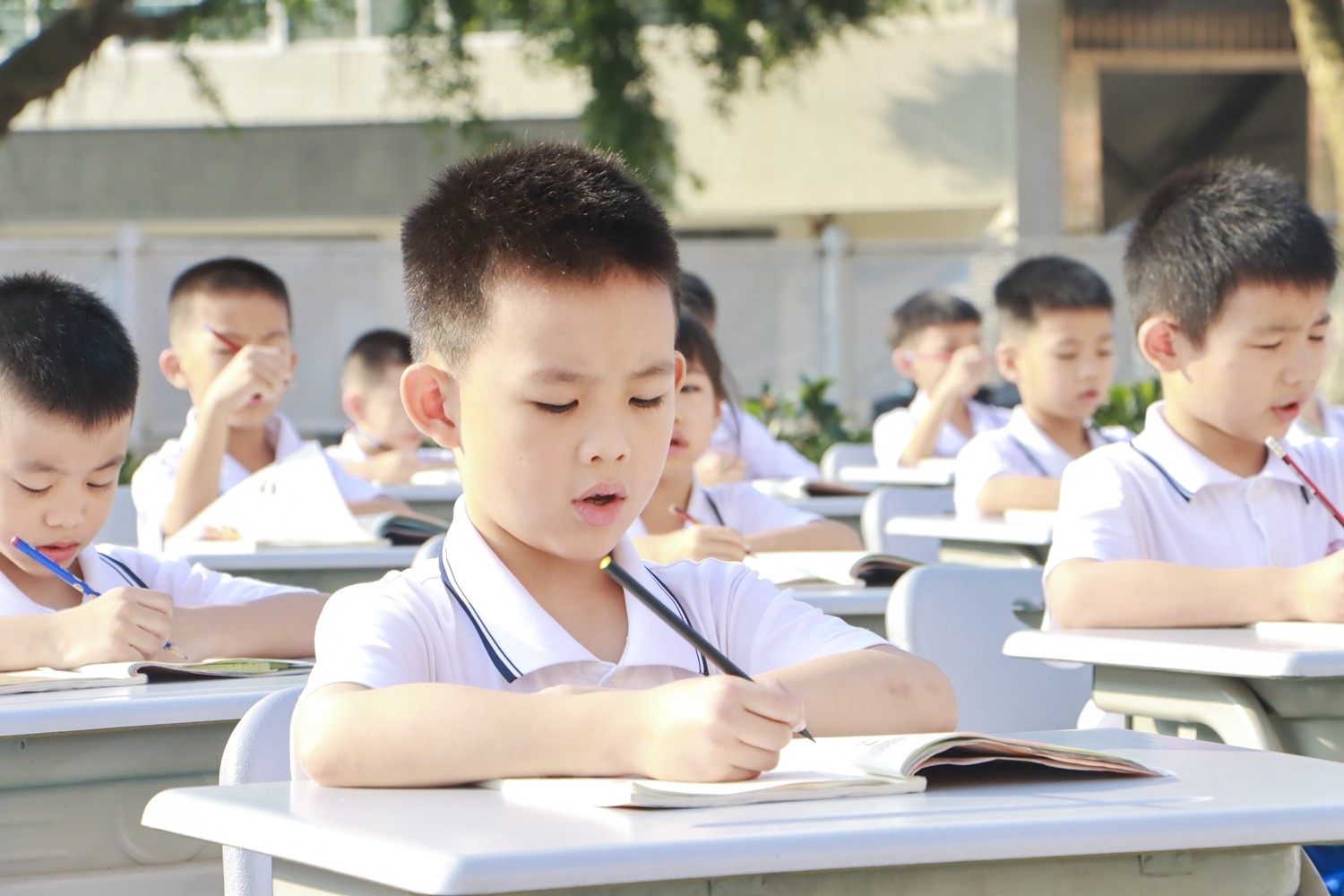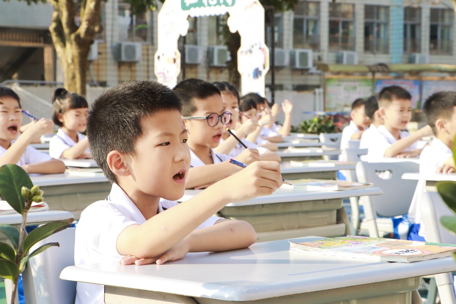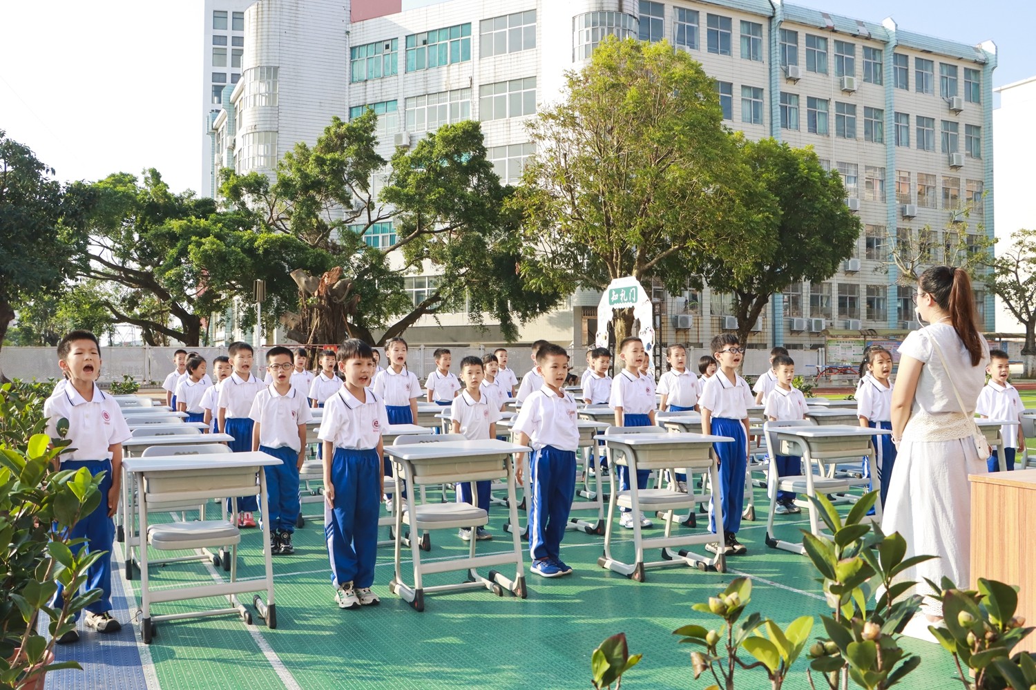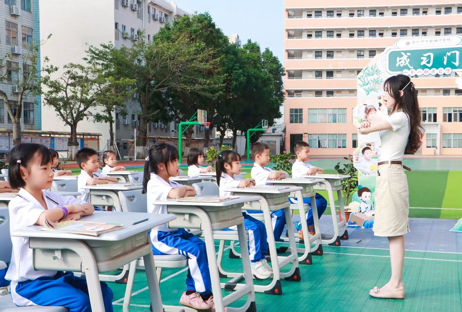 路队展示时,《运动员进行曲》奏响,小萌娃们身着整洁统一的校服入场,班级口令喊得刚劲而有力;课前准备环节,班长一声“书本摆放”,孩子们迅速将课本归位,坐姿端正如同挺拔的小树苗;读书时,整齐划一,富有情感,清脆的童声回荡在广场上空。
