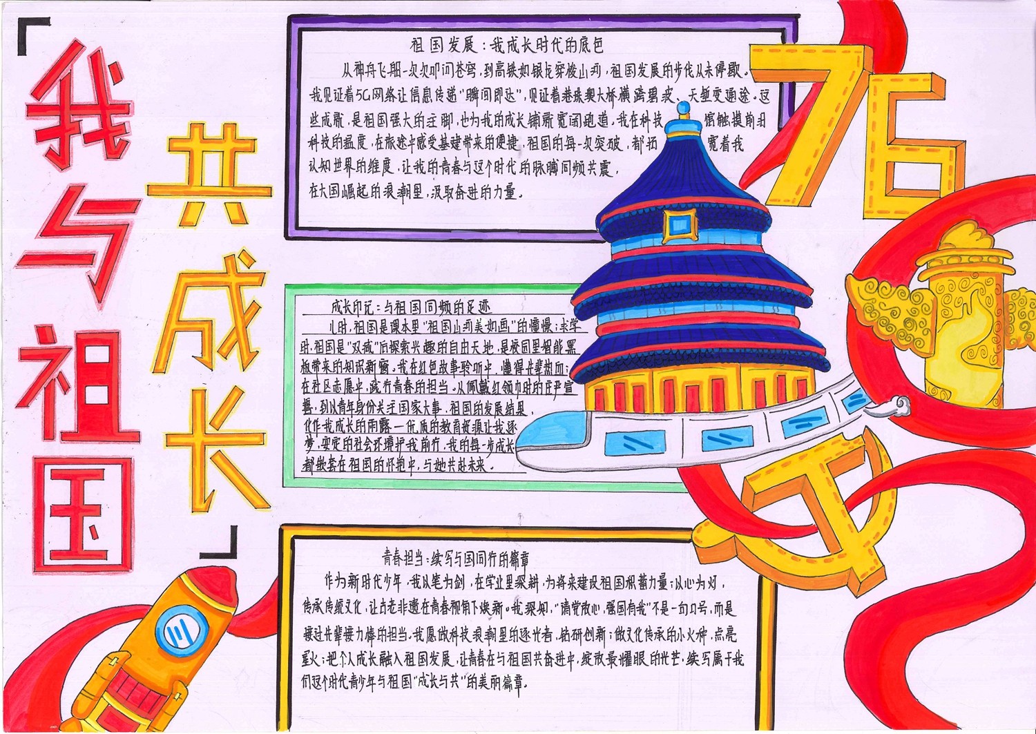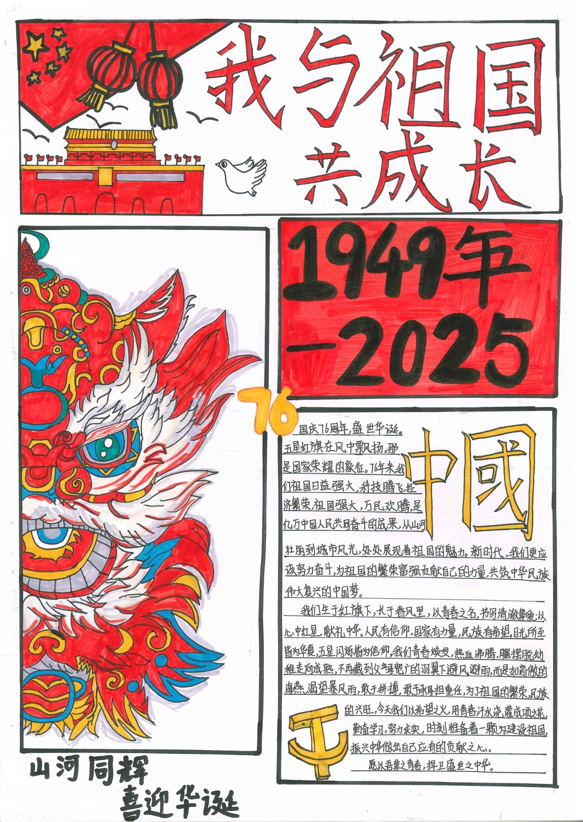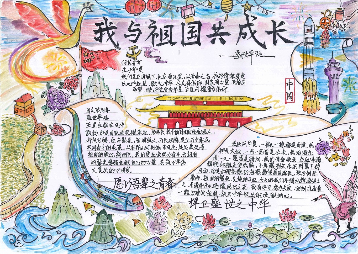 为铭记中国人民抗日战争暨世界反法西斯战争胜利80周年的伟大历史时刻,大力弘扬爱国主义精神,着力厚植青少年家国情怀,初一道德与法治科组匠心独运,精心策划并组织开展了以“我与祖国共成长”为主题的手抄报创作活动。此次活动旨在引导初一年级学生借助艺术形式,尽情抒发对祖国的热爱,深刻展现对民族复兴的使命担当。