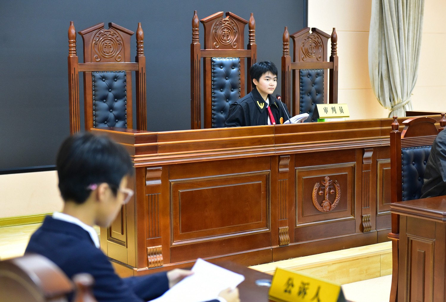 在此次活动中,初二年级的十五位同学分别扮演审判长、审判员、书记员、公诉人、被告人、辩护人、法警、被害人等角色,生动再现了一起寻衅滋事案件的庭审现场。