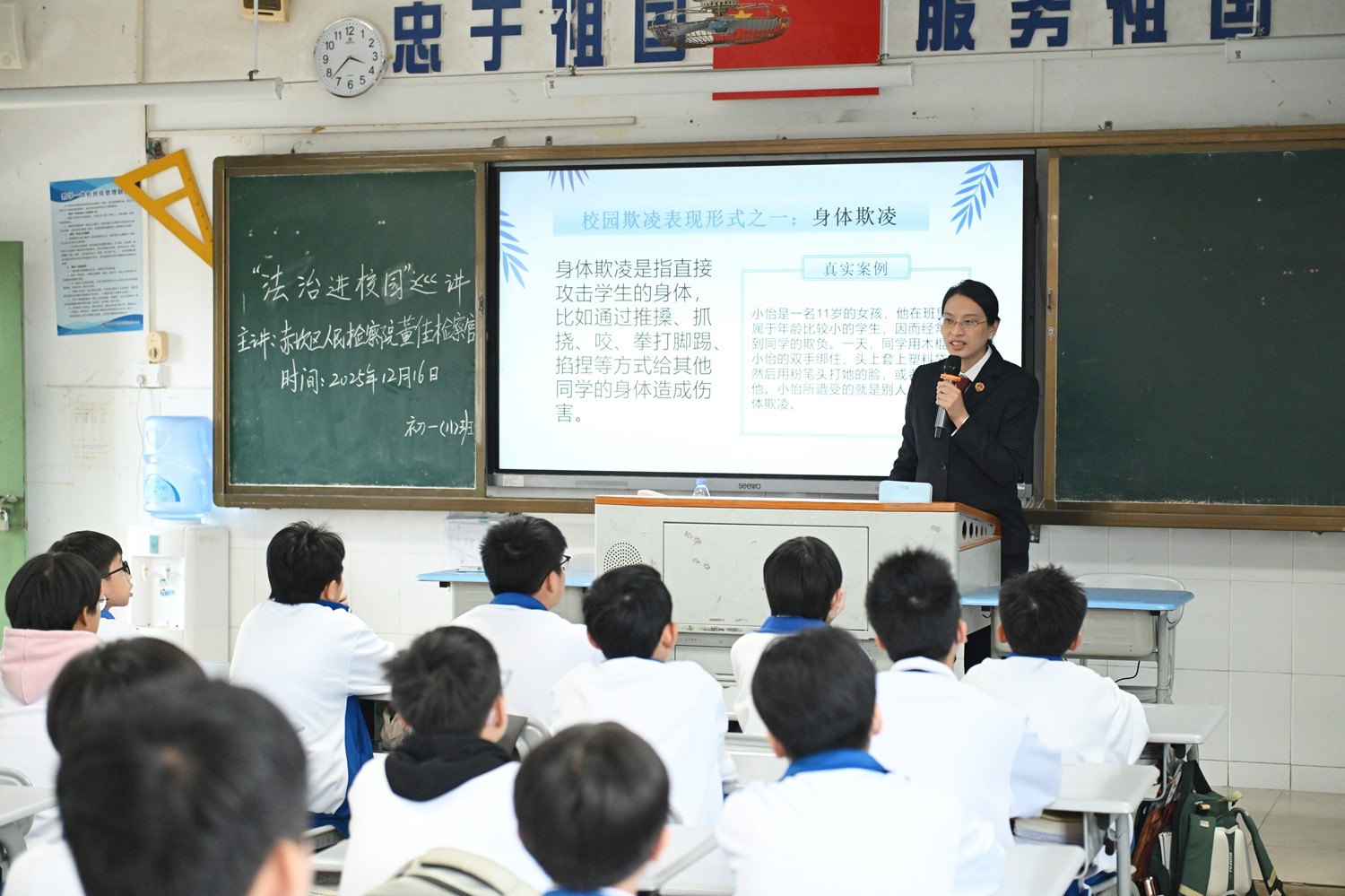 12月16日下午,我校联合湛江市赤坎区人民检察院共同开展了“法治进校园”活动,我校初一年级全体学生参加了活动。赤坎区人民检察院党组成员江丽兵、我校常务副校长洪小湖、德育处主任林振群、德育处副主任贾莉敏、初一年级级长何九林等领导共同出席了活动见面会。
