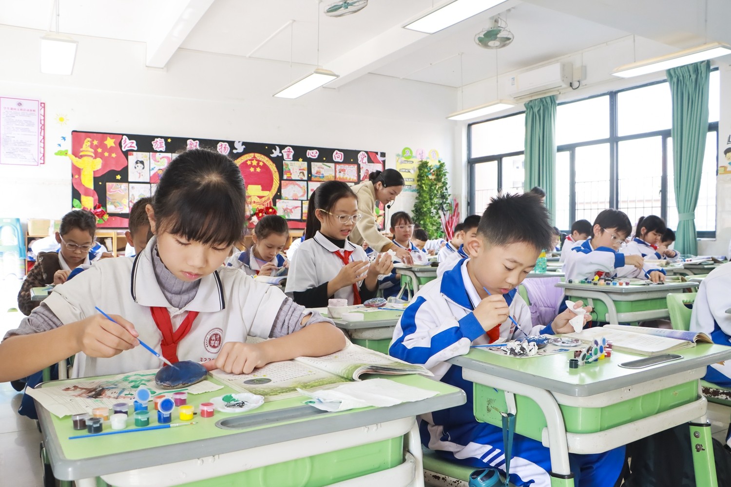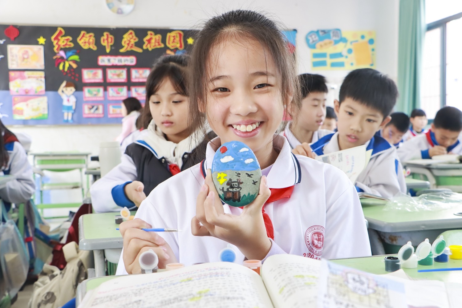 活动伊始,教室便化作静谧而热烈的创作天地。孩子们围坐桌前,手捧形状各异的石头,眼中闪烁着跃跃欲试的光芒。选定本学期最心仪的课文后,调色、勾勒、点染……一方方石头上,课文的灵魂被色彩悄然唤醒。