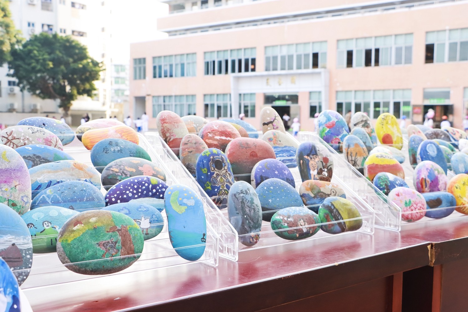 看,《暮江吟》中“一道残阳铺水中,半江瑟瑟半江红”的绚烂霞光,在石面上晕染开来;《花牛歌》里那只俏皮的花牛,正悠然自得地卧在草地里;《繁星》点点,仿佛在深蓝的石面上静静闪烁;《走月亮》时那片洒满月光的小路,透着静谧与温柔。更有《精卫填海》的执着身影、《陀螺》飞旋的动感瞬间、《牛和鹅》里童趣盎然的乡村场景……每一笔色彩,都是对文字的独特解读;每一块石头,都承载着一个完整的童心世界。