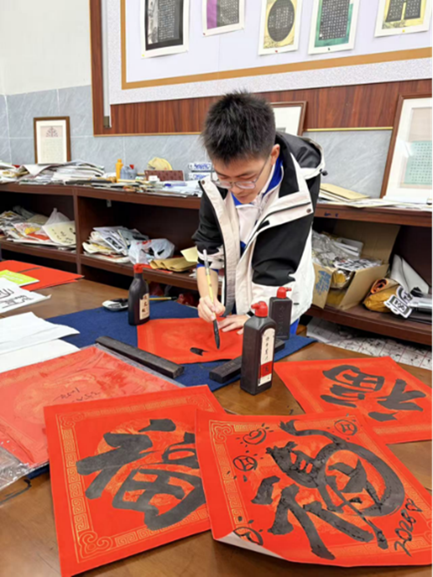 这天下午,教室里洋溢着节日的喜庆气氛。初一年级学生拿出已经提前写好的春联和福字。