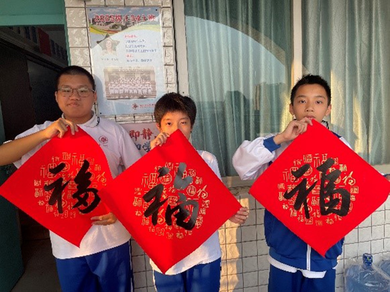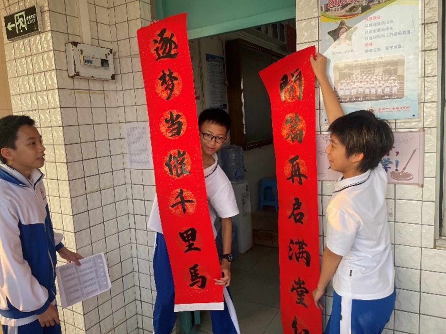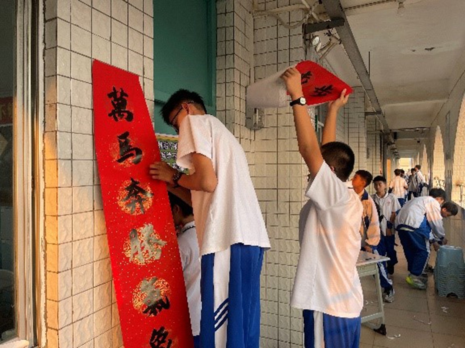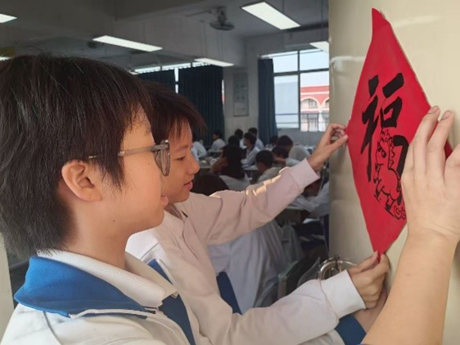 在级长的广播指令下,同学们开始分组与老师协作,共同将春联和福字张贴在教室门口、走廊窗户等位置。同学们分工明确,有撕胶布的,有负责帖春联的,有负责帖福字的,还有帮忙看福字贴得正不正,一时间,校园处处红火,年味扑面而来。火红的春联与青春的笑脸交相辉映,传统的韵味与现代的校园完美融合。