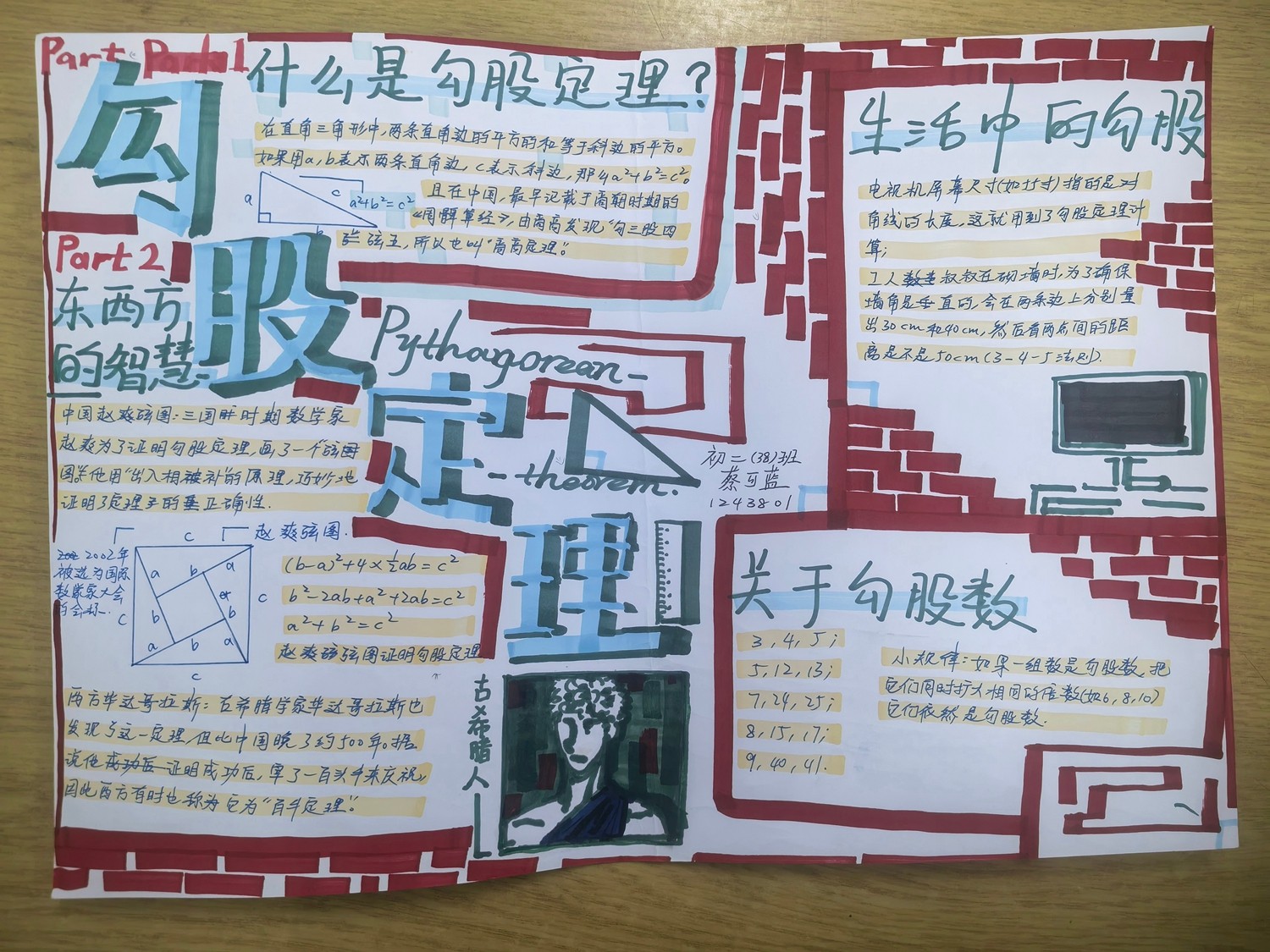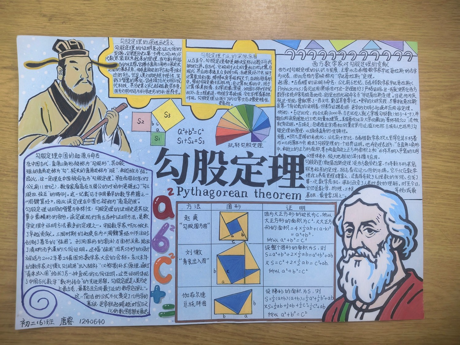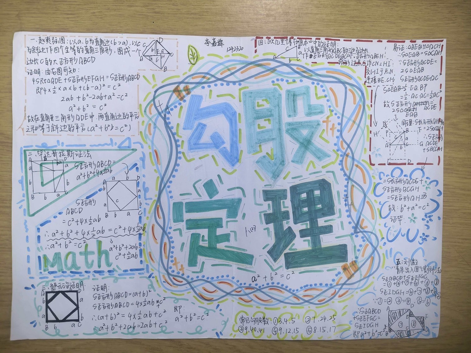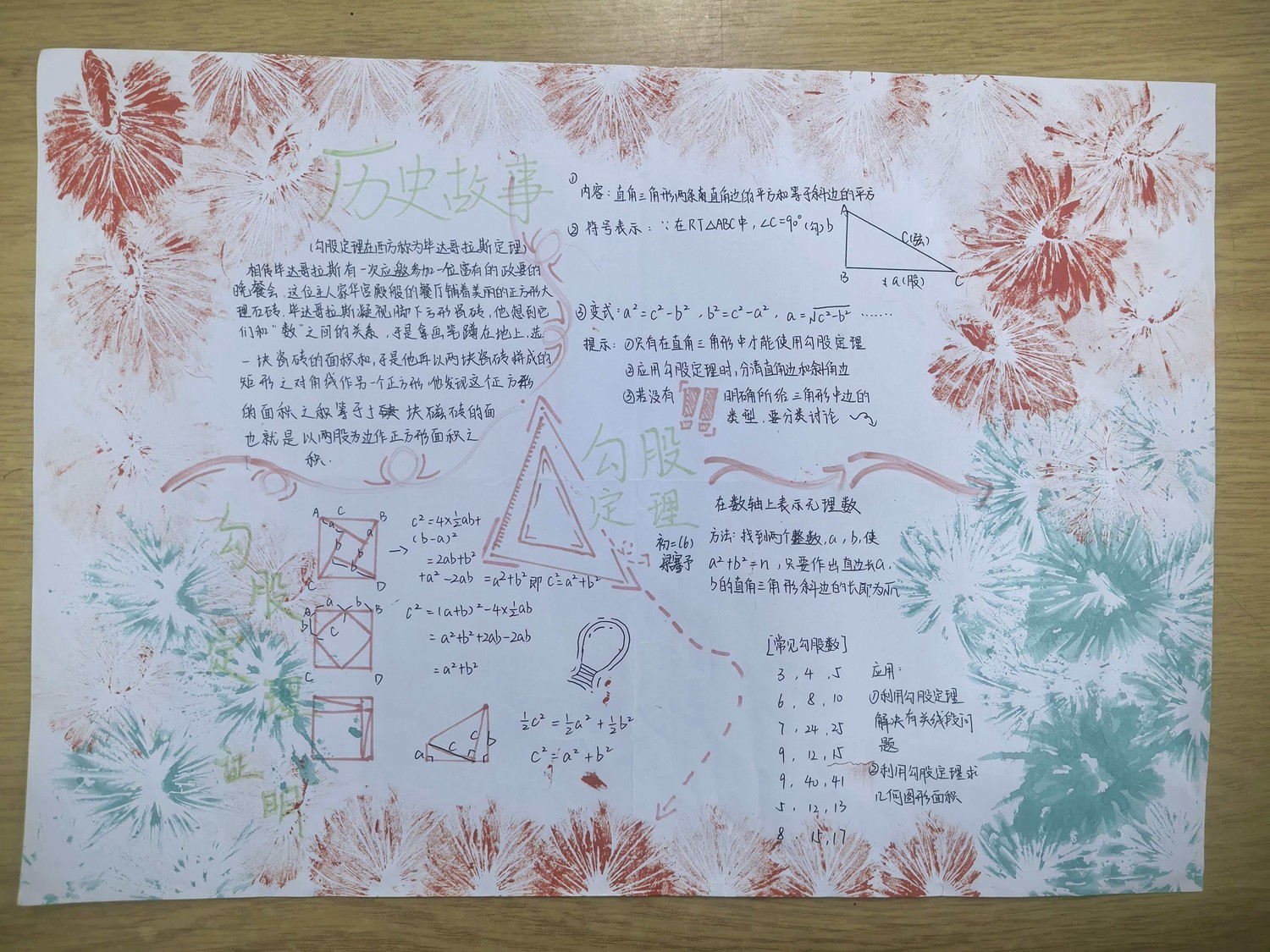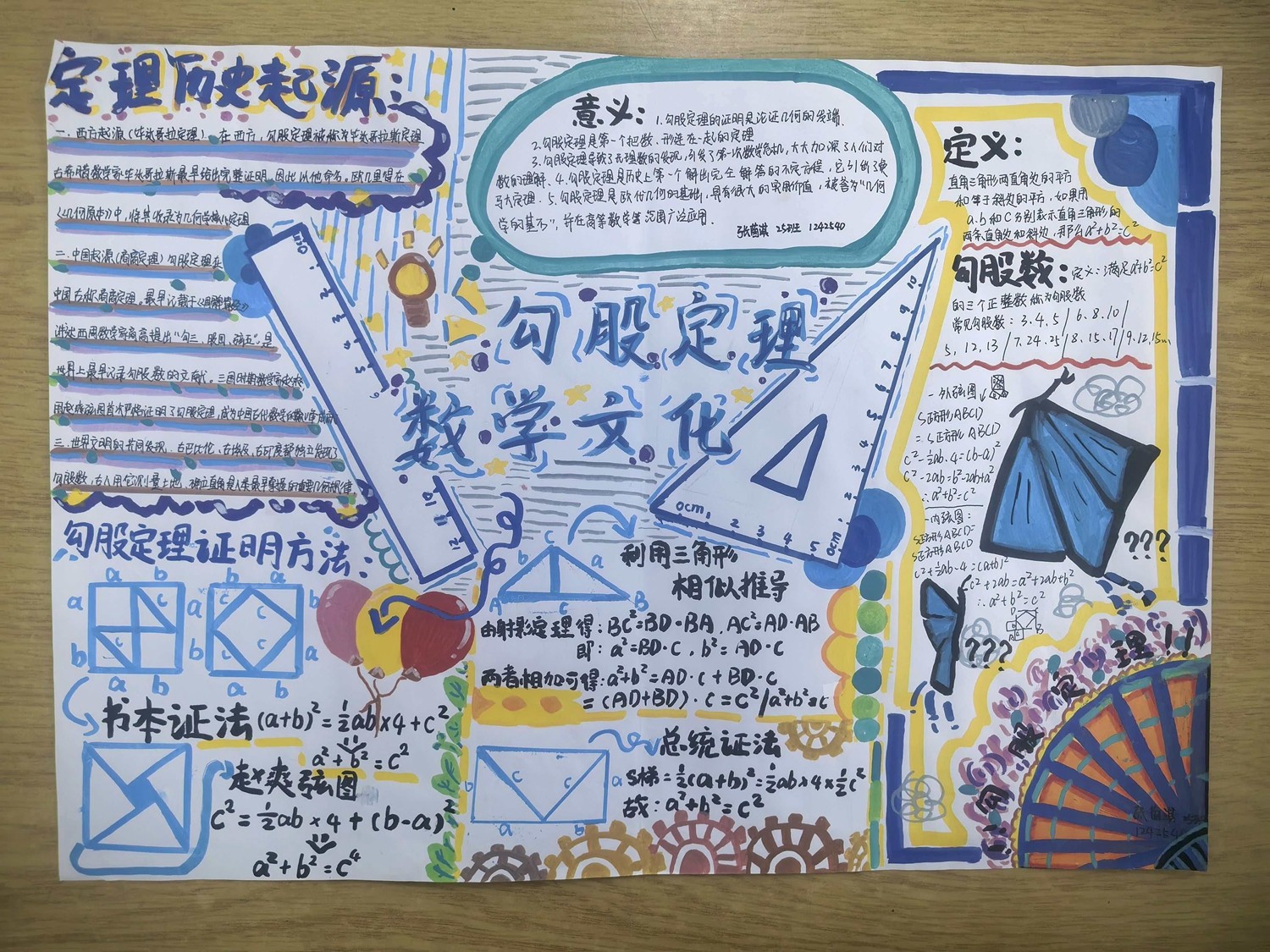 勾股定理,作为几何学的璀璨明珠,蕴含着深厚的数学文化底蕴。本次作业要求学生不仅要在手抄报中准确呈现勾股定理的证明方法、历史渊源,更要通过创意排版与美术设计,展现数学的对称美与逻辑美。活动中,同学们化身“数学设计师”,交出了一份份令人惊喜的答卷。有的同学用“赵爽弦图”与“毕达哥拉斯证法”进行古今对话;有的同学将勾股定理与生活中的建筑、测量问题相结合,体现了数学来源于生活又服务于生活的理念;还有的同学利用色彩与几何图形的拼接,将严谨的数理逻辑转化为极具视觉冲击力的艺术作品。