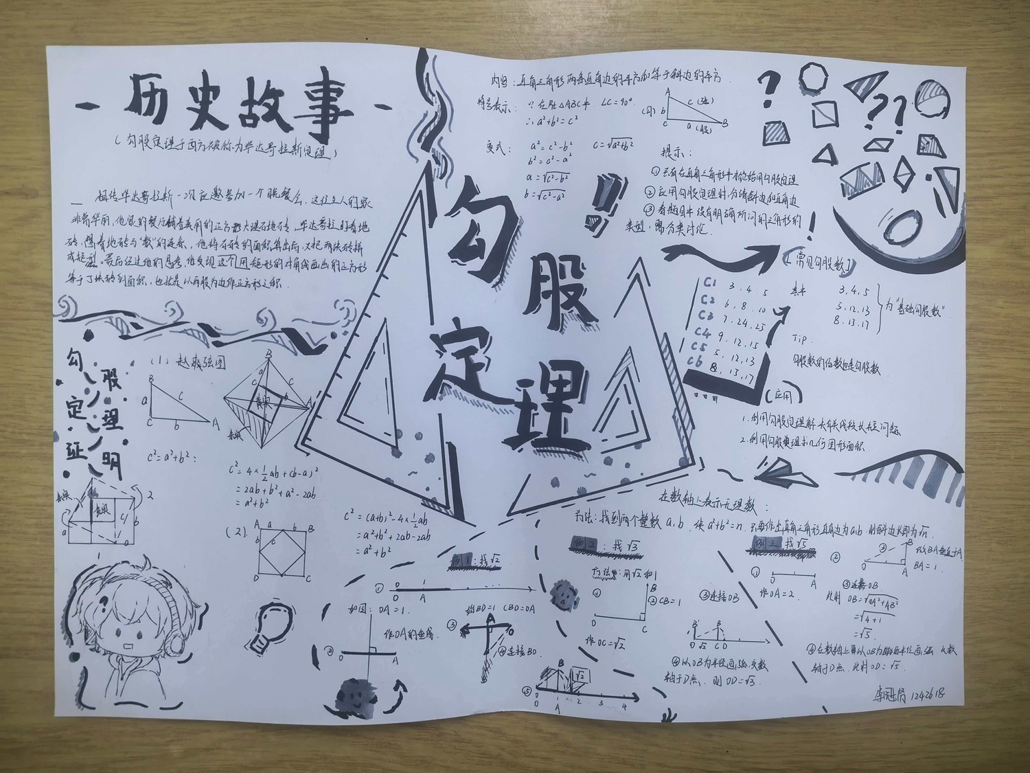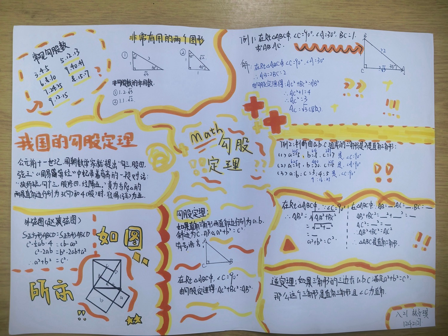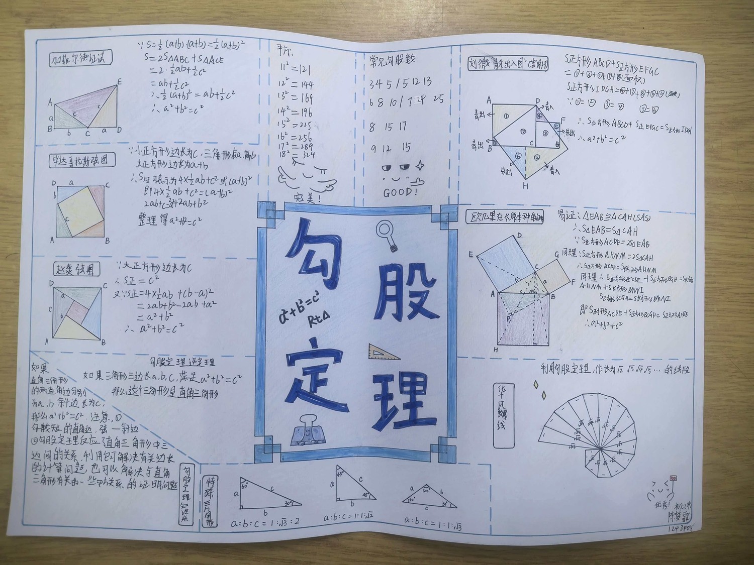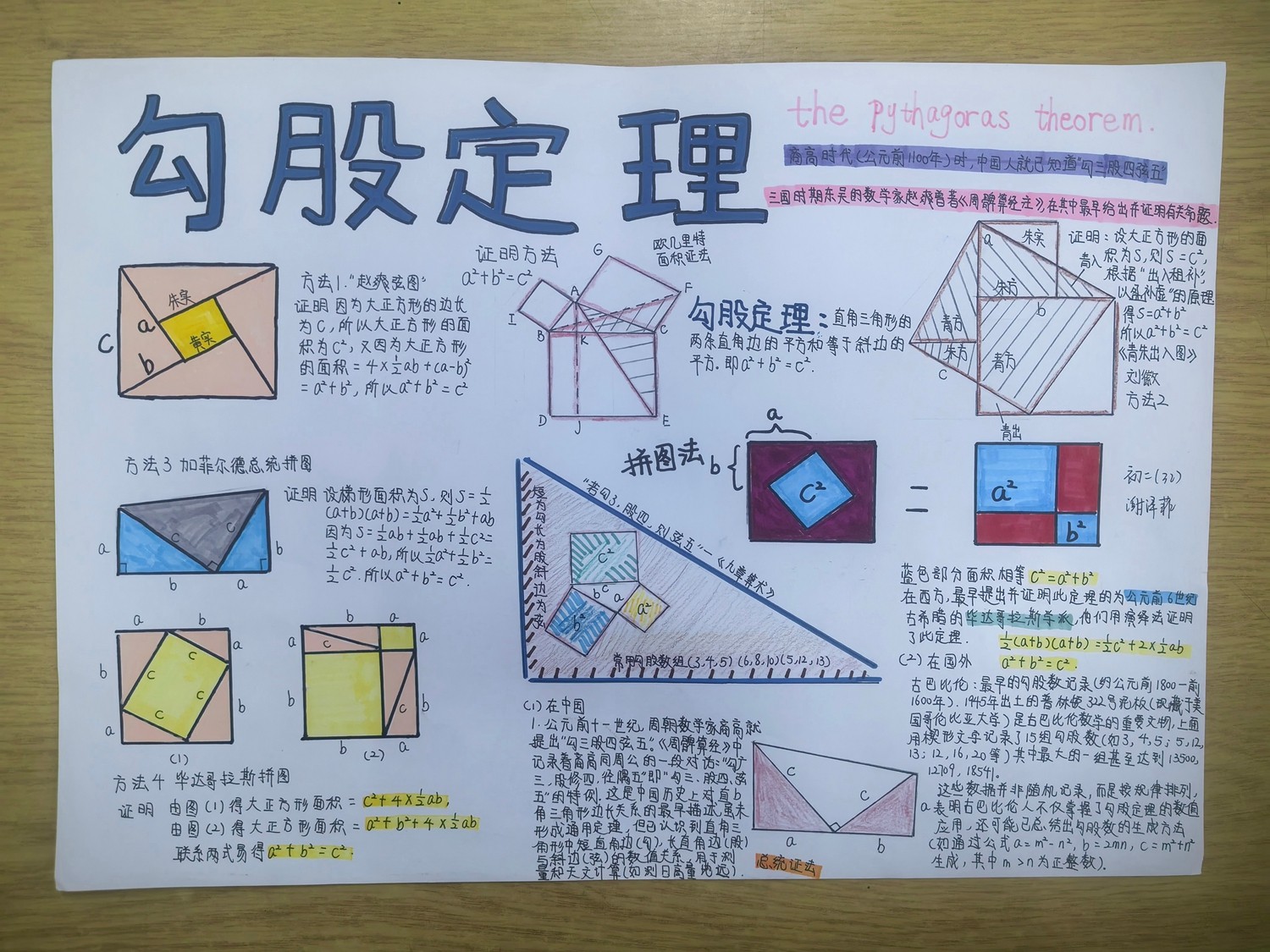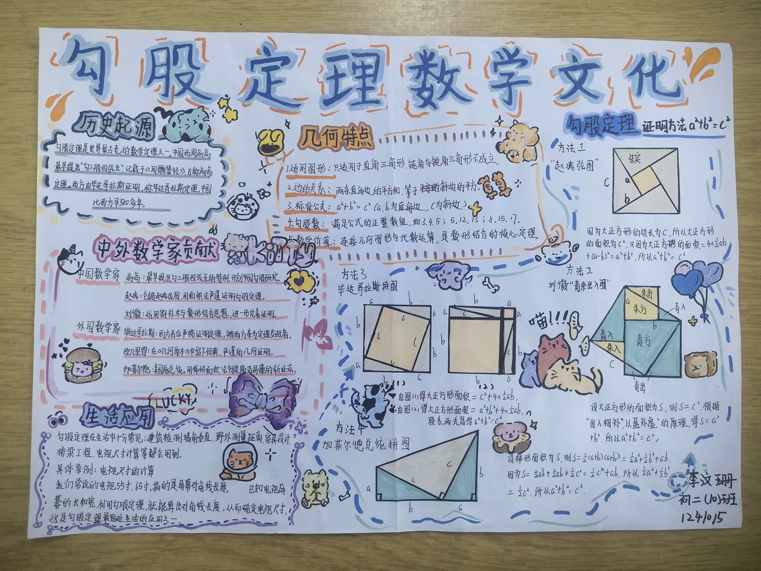 勾股定理,作为几何学的璀璨明珠,蕴含着深厚的数学文化底蕴。本次作业要求学生不仅要在手抄报中准确呈现勾股定理的证明方法、历史渊源,更要通过创意排版与美术设计,展现数学的对称美与逻辑美。活动中,同学们化身“数学设计师”,交出了一份份令人惊喜的答卷。有的同学用“赵爽弦图”与“毕达哥拉斯证法”进行古今对话;有的同学将勾股定理与生活中的建筑、测量问题相结合,体现了数学来源于生活又服务于生活的理念;还有的同学利用色彩与几何图形的拼接,将严谨的数理逻辑转化为极具视觉冲击力的艺术作品。