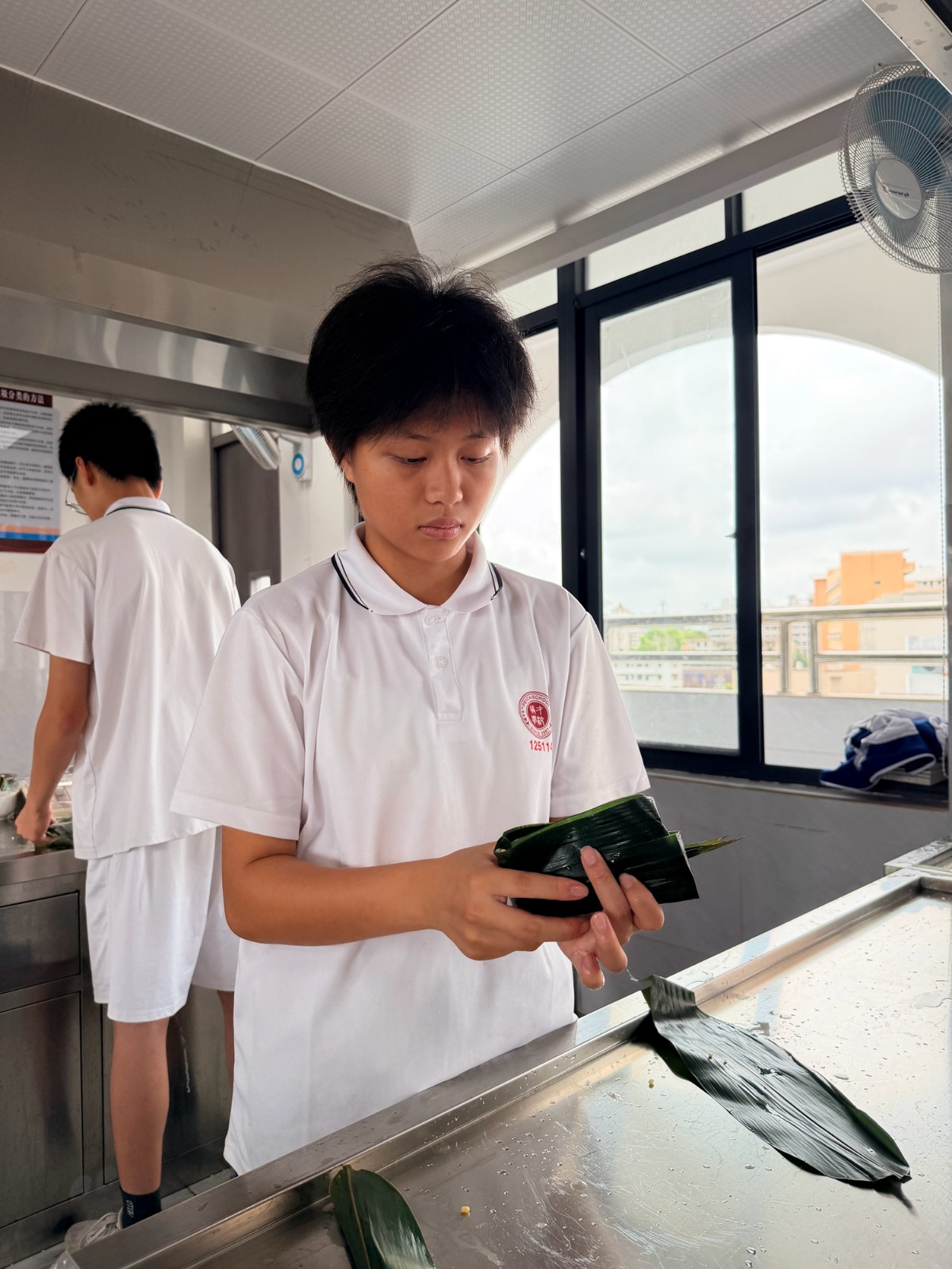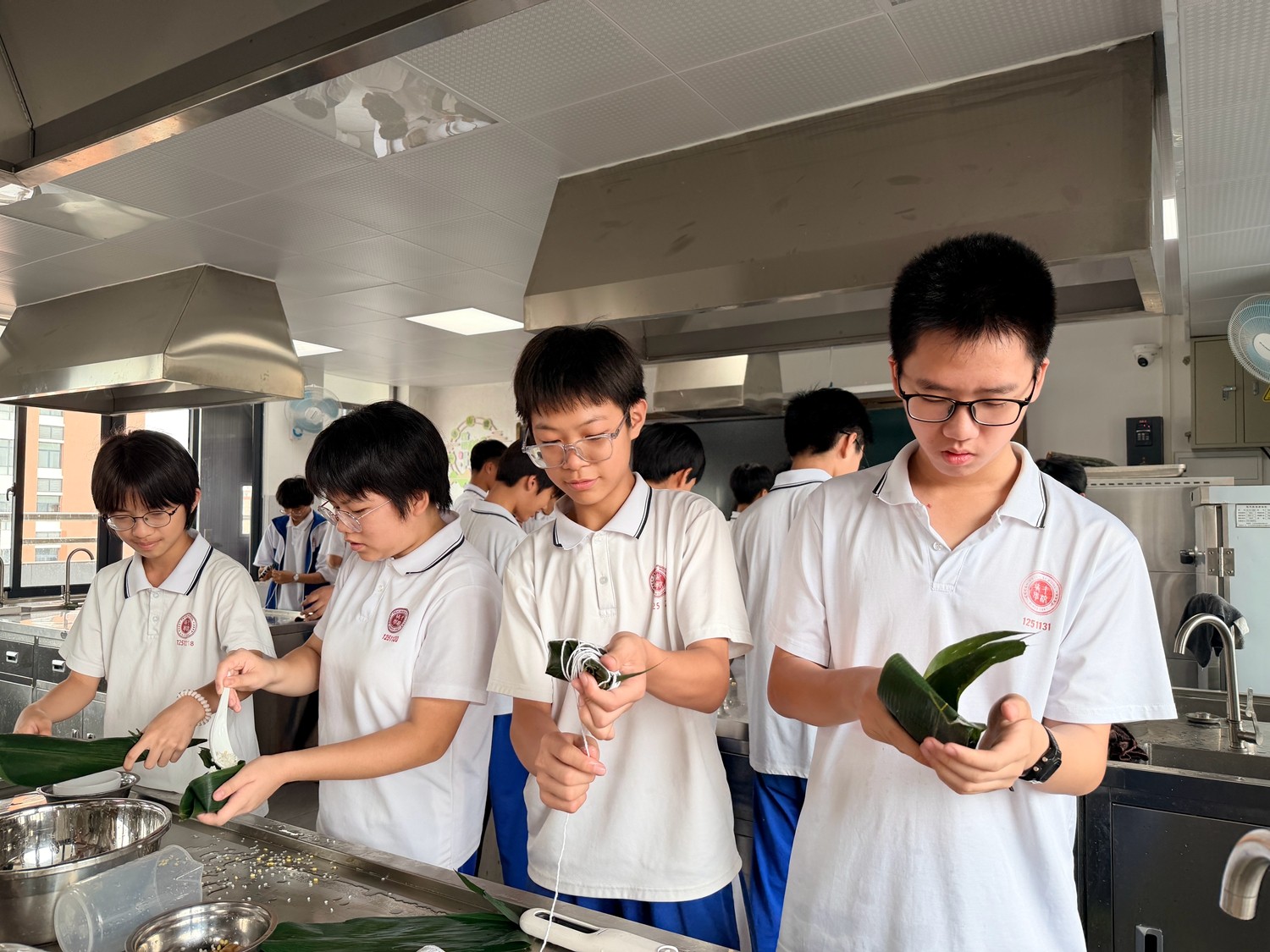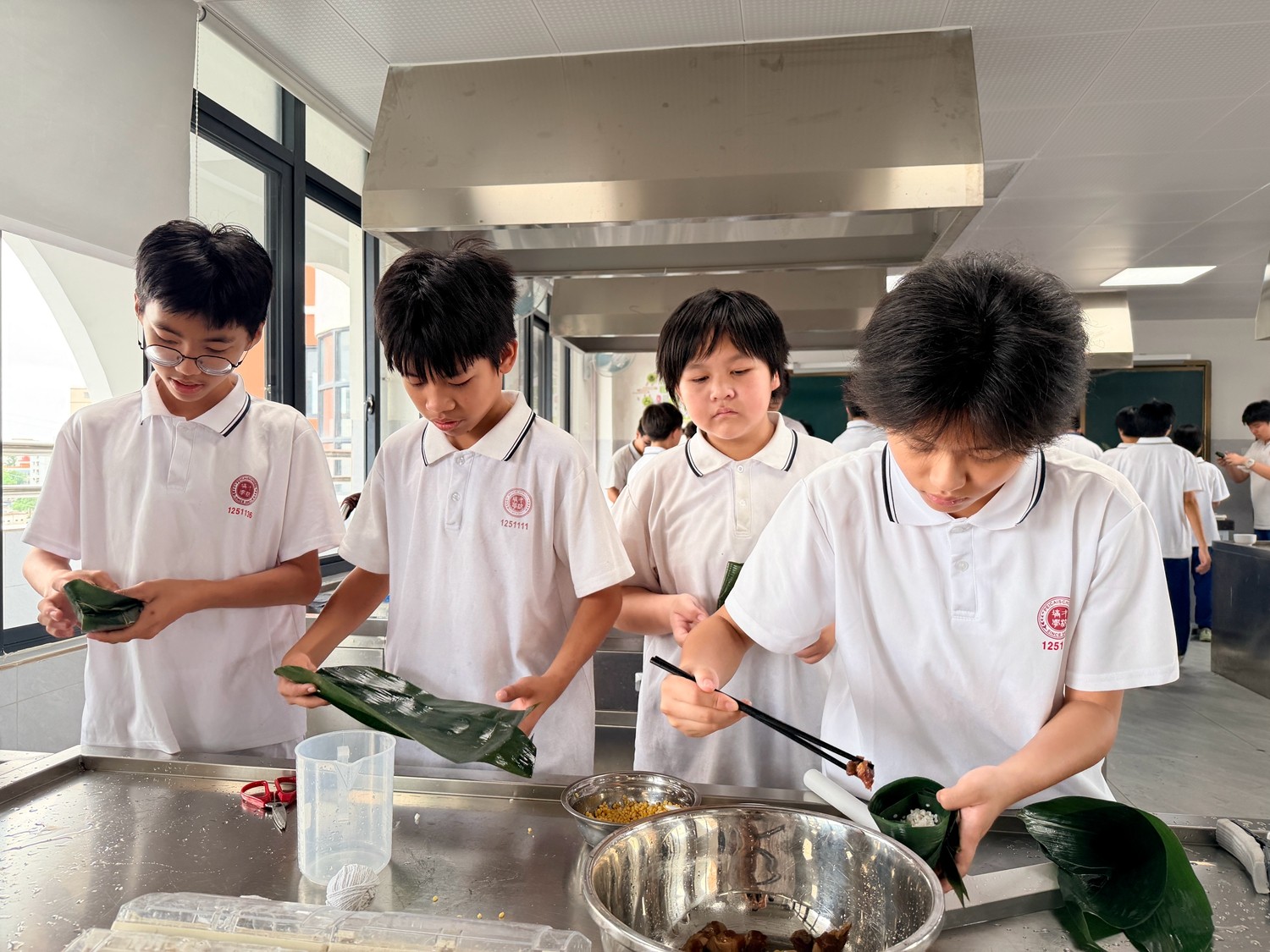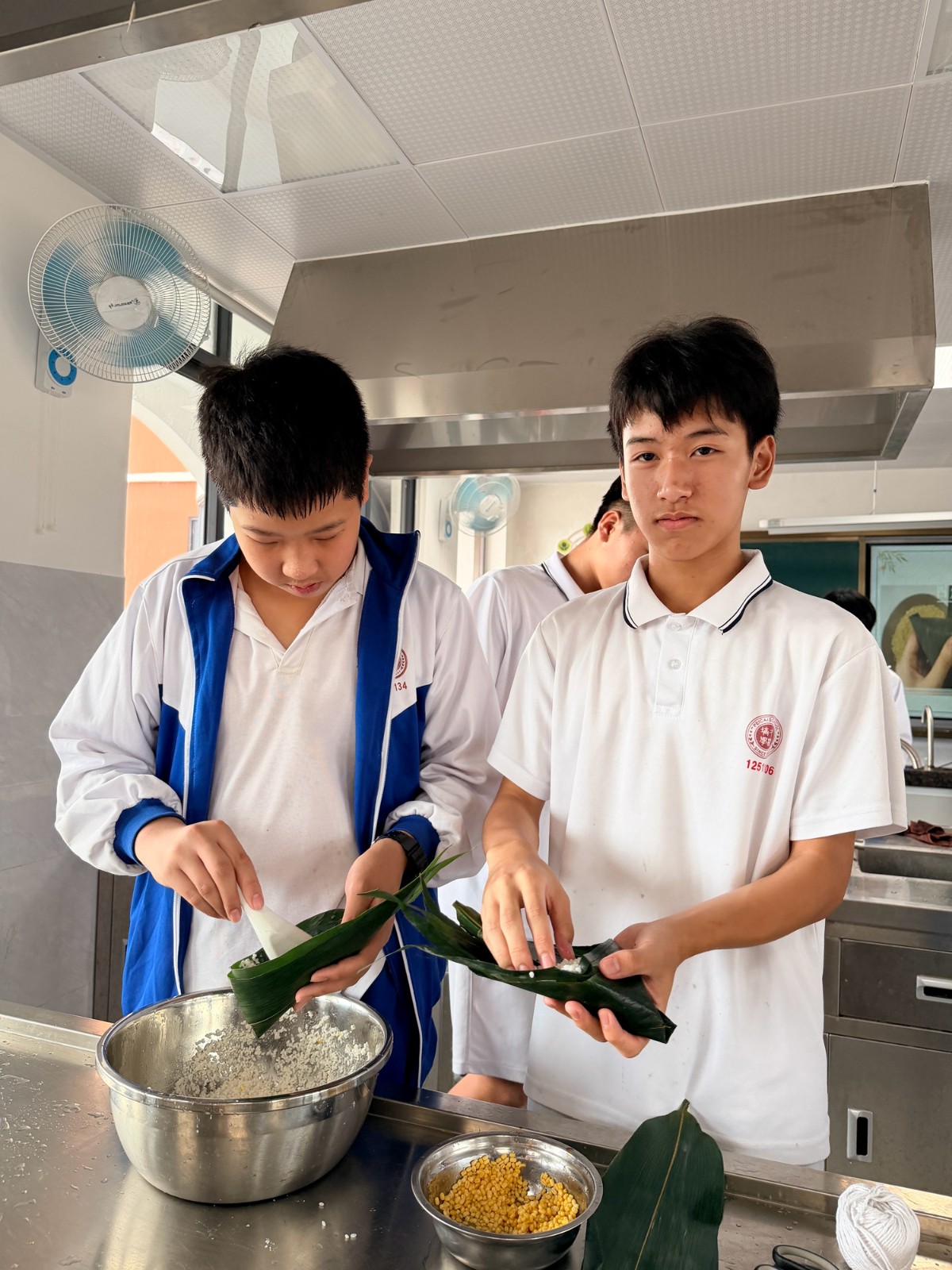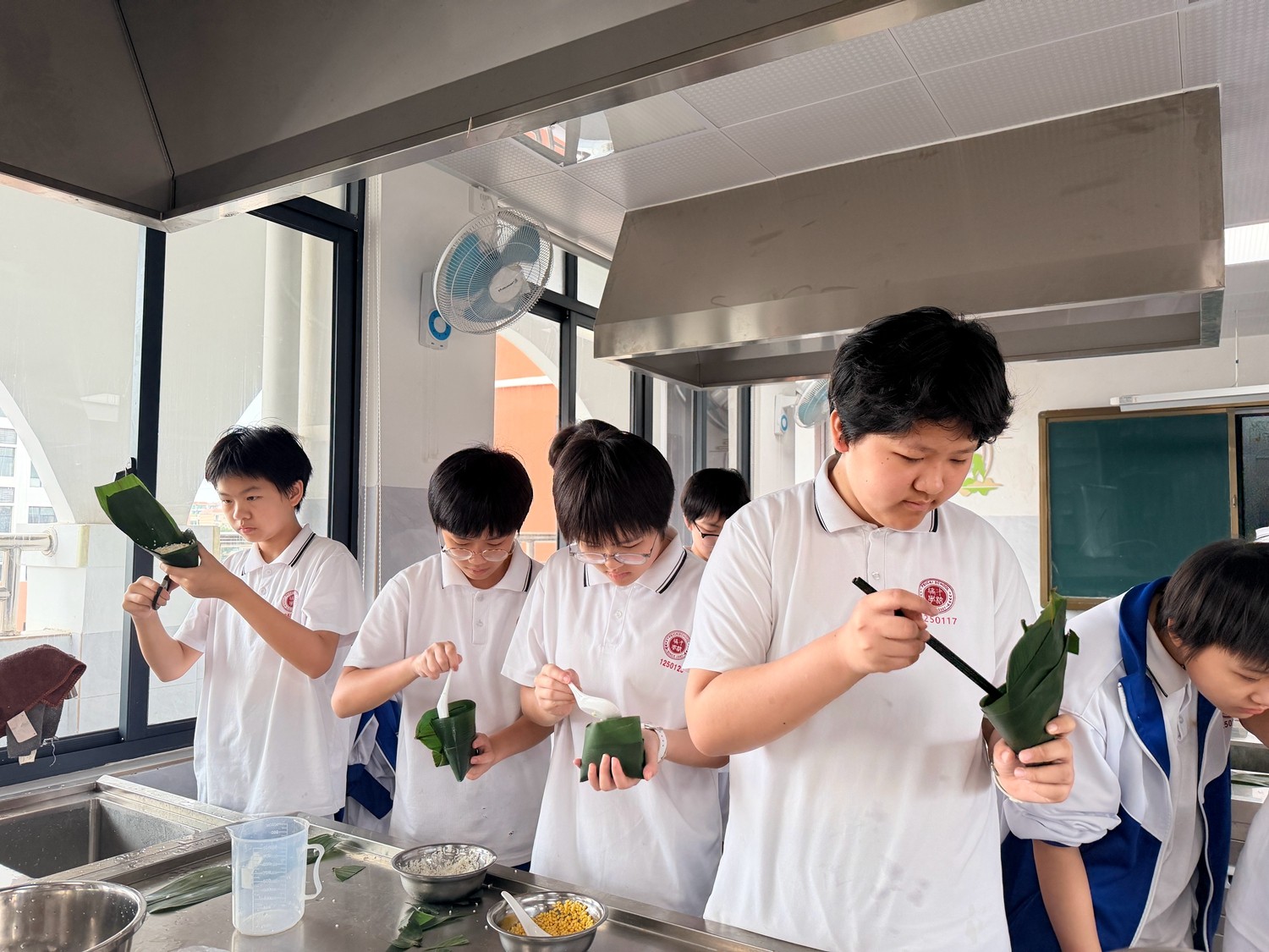 第二阶段,热闹的实践环节正式开启。烹饪教室里,粽叶、糯米、五花肉、绿豆等食材整齐摆放,同学们分组协作、分工明确,在老师的指导下,有条不紊地投入到粽子制作中。铺粽叶、填糯米、放馅料、折粽叶、捆棉线,一系列动作从生疏笨拙到熟练流畅,大家互帮互助、相互请教,有的同学认真调整粽叶的角度,有的同学仔细把控馅料的用量,有的同学耐心学习捆扎技巧,生怕一个疏忽影响了粽子的造型。