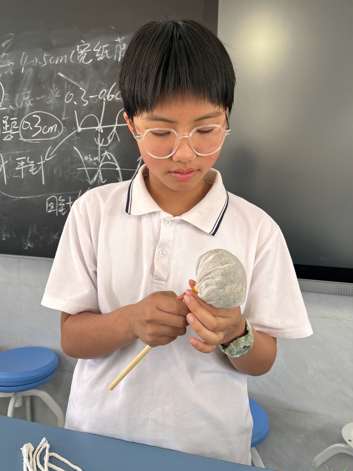 青艾寄俗,邂逅传统文化。时值暮春,艾草青绿,结合清明时节民俗底蕴,课堂特别增设艾草锤制作环节。老师结合时令,为同学们讲解清明采艾、用艾的传统习俗,科普艾草天然养生、舒缓身心的实用价值,解读民俗文化背后的人文内涵。淡淡艾香萦绕课堂,同学们有序动手整理干艾草,填充塑形、包裹固定、细心收口,有条不紊地完成艾草锤制作。一把亲手制作的艾草锤,兼具观赏性与实用性,既能舒缓肩颈疲惫,又承载着春日韵味与传统智慧。同学们在亲手制作的过程中,近距离感受传统民俗魅力,感受中华传统文化的独特韵味。