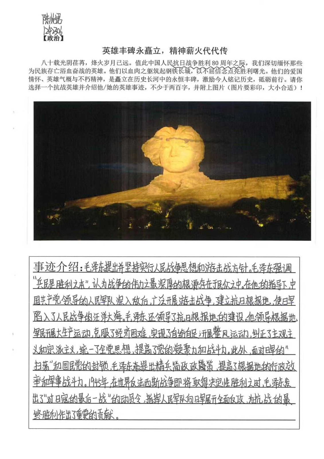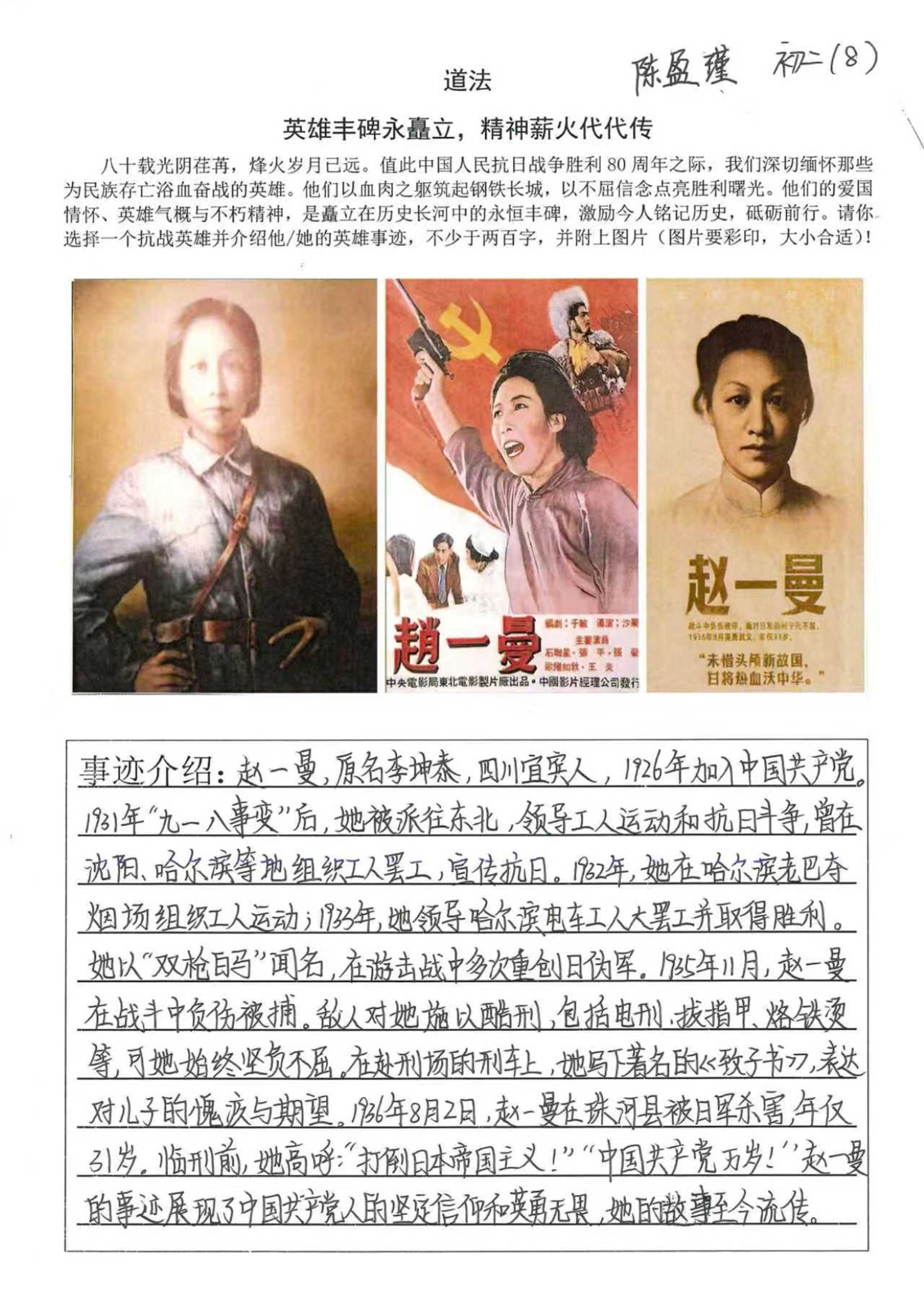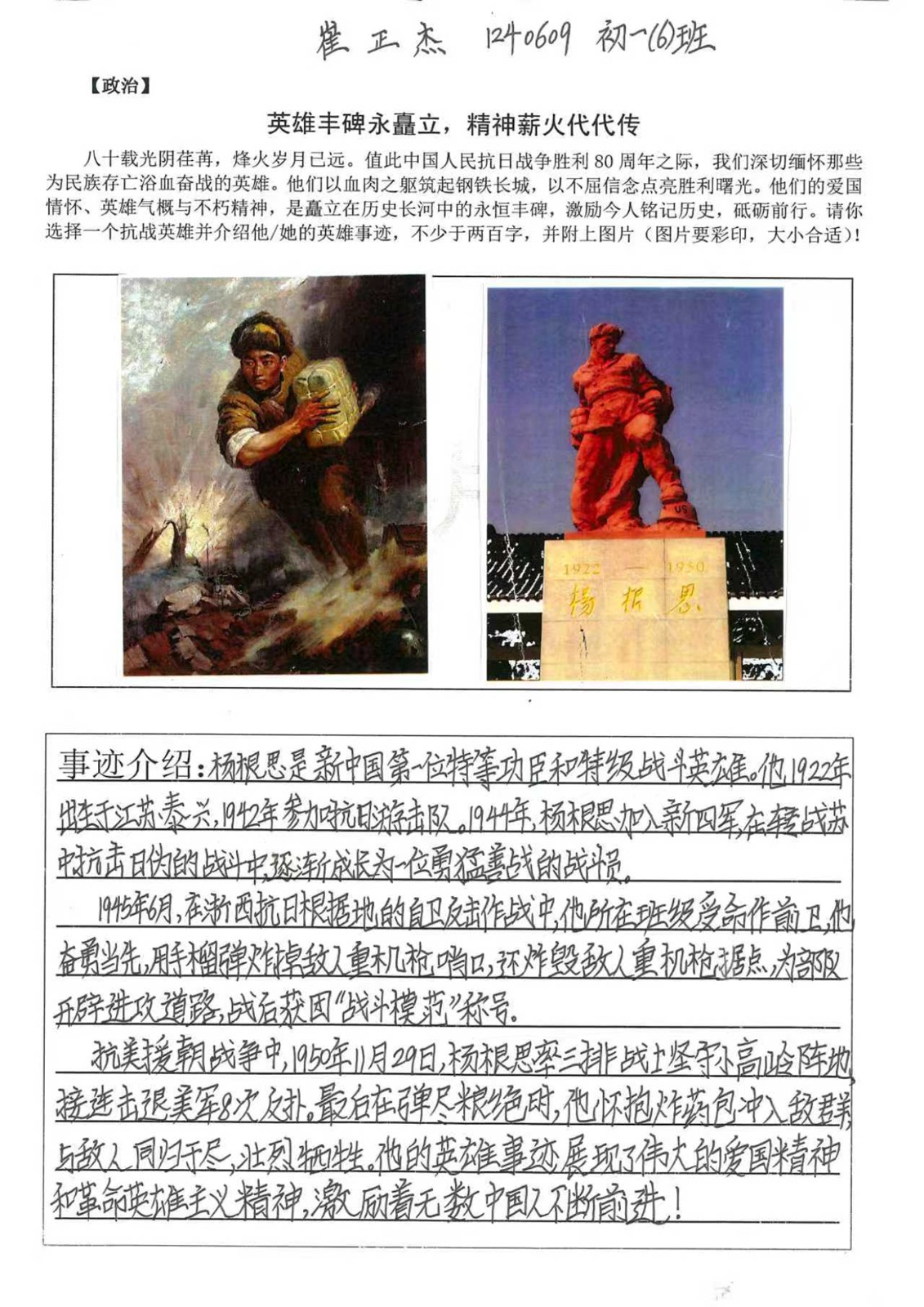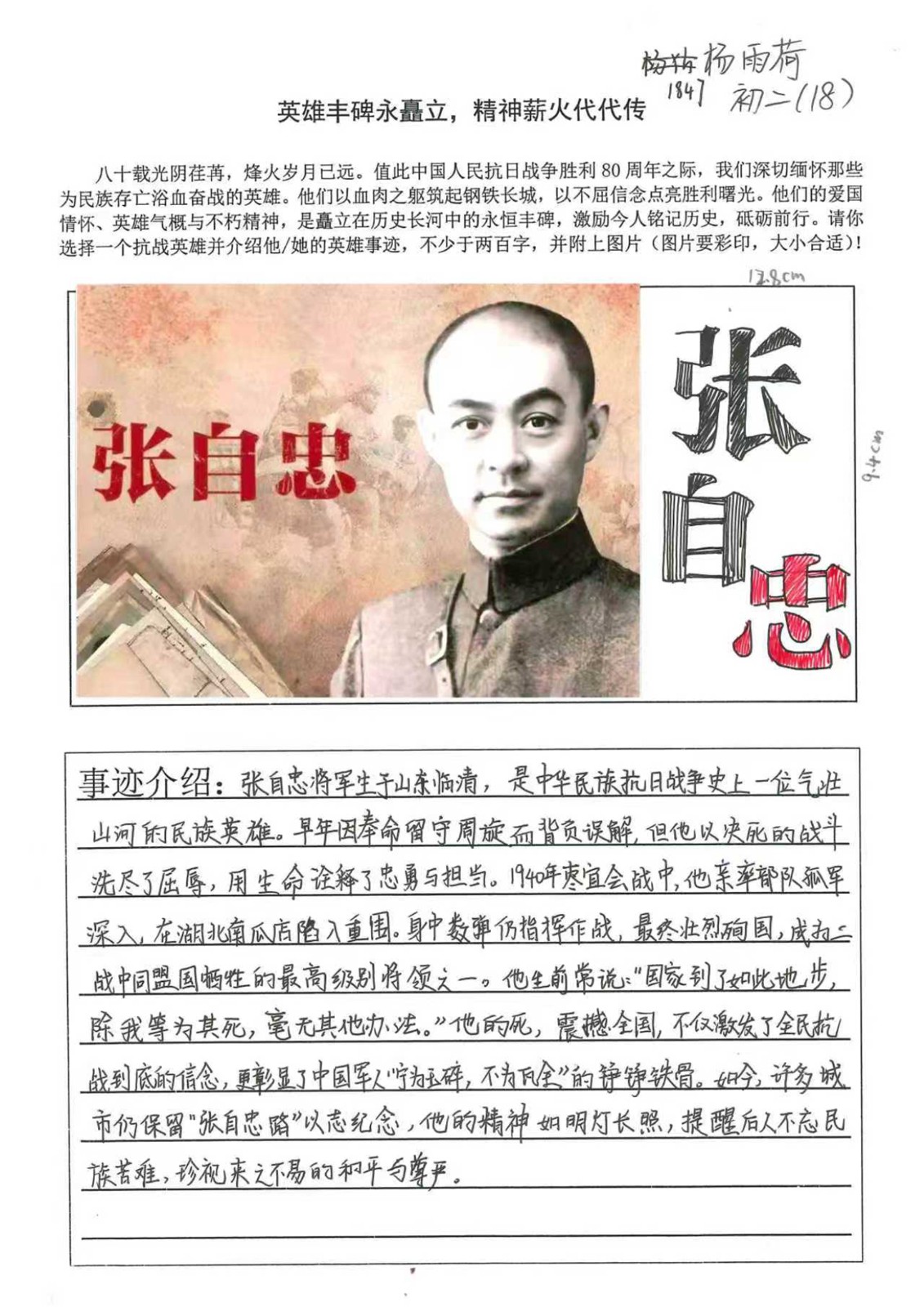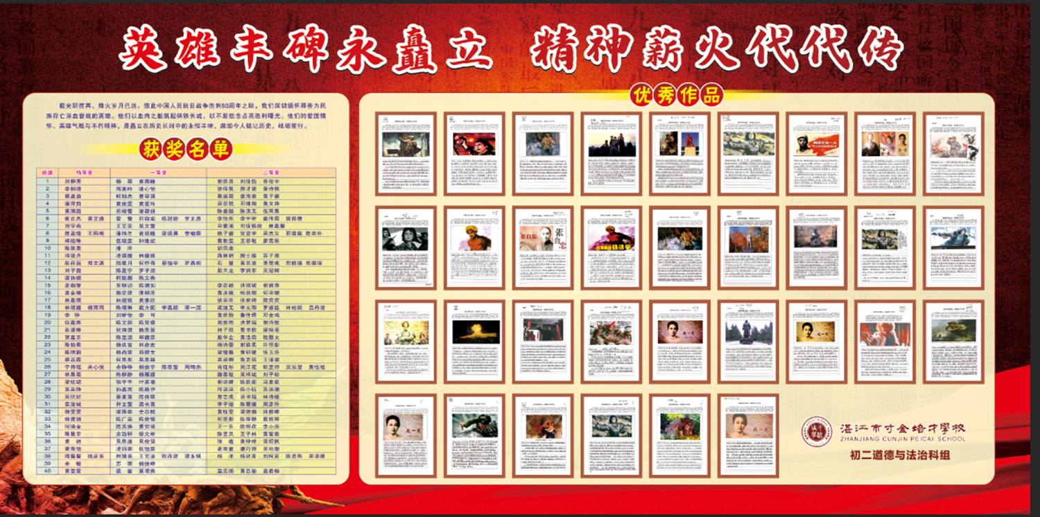 八十载时光流转,山河无恙;八十年精神传承,初心如磐。在中国人民抗日战争胜利80周年的特殊时刻,我校初二年级道德与法治科组开展了“英雄丰碑永矗立,精神薪火代代传”为主题的手抄报活动,向为民族独立献身的英雄儿女致敬。