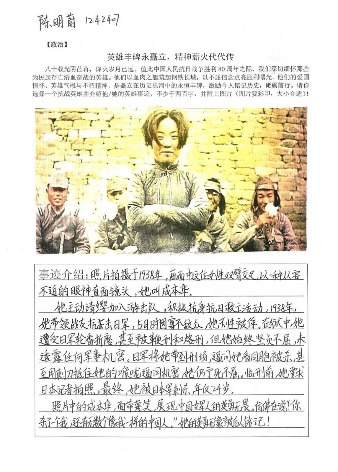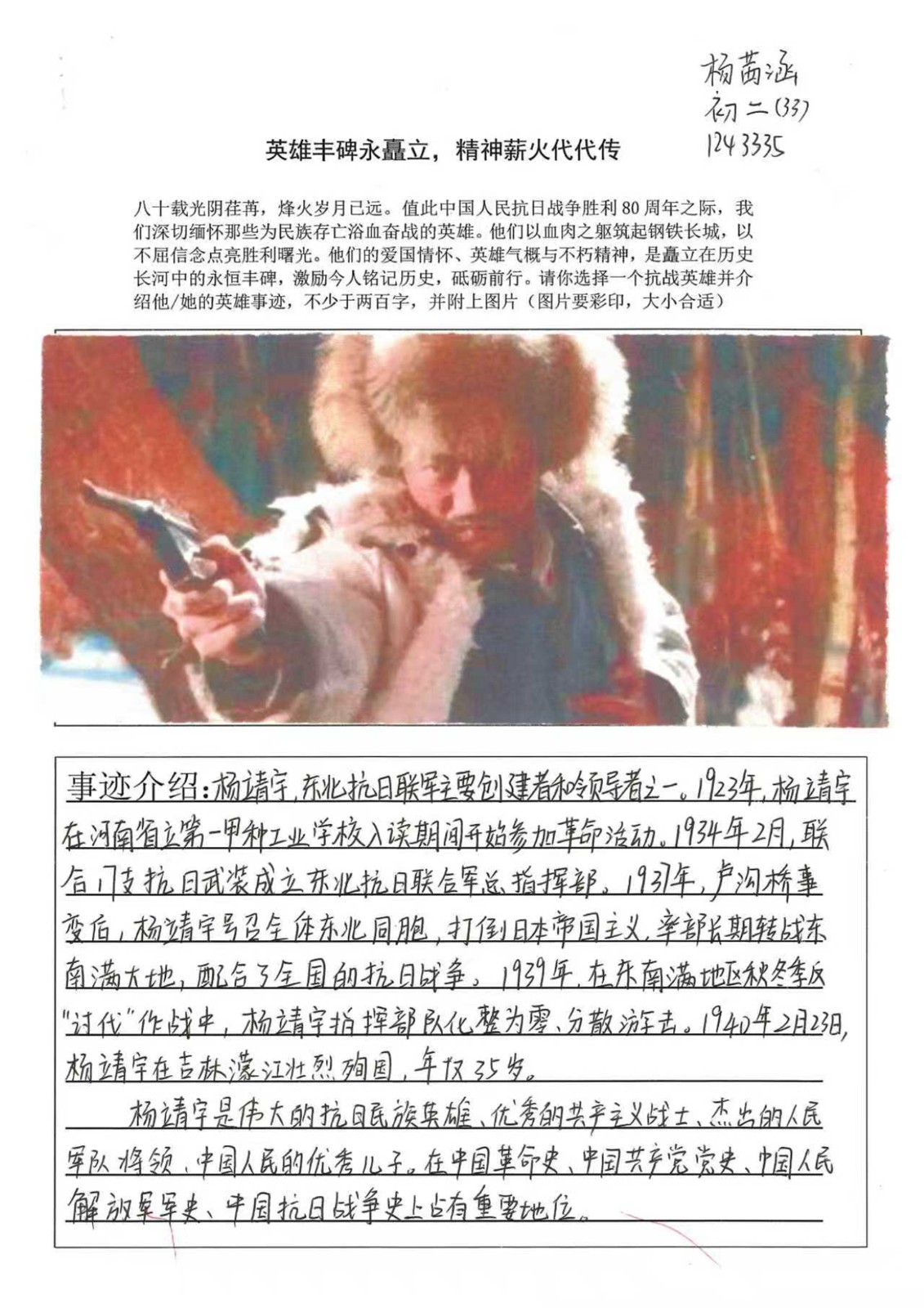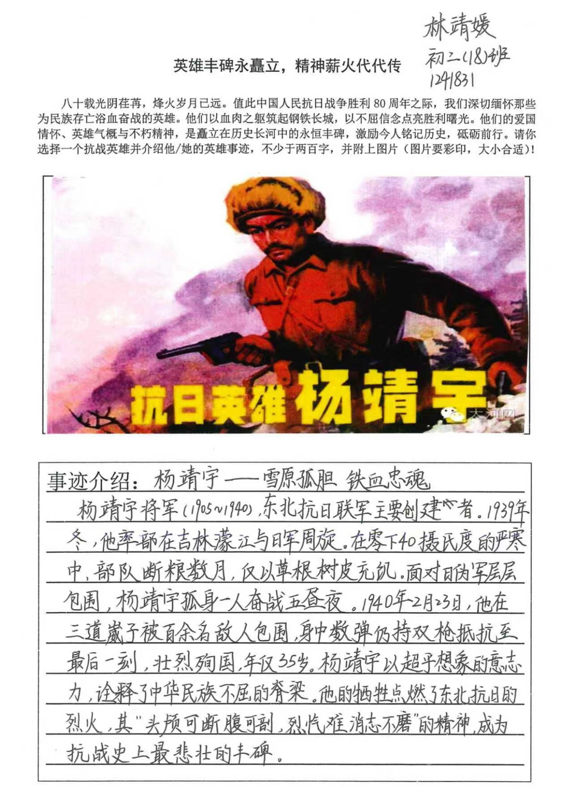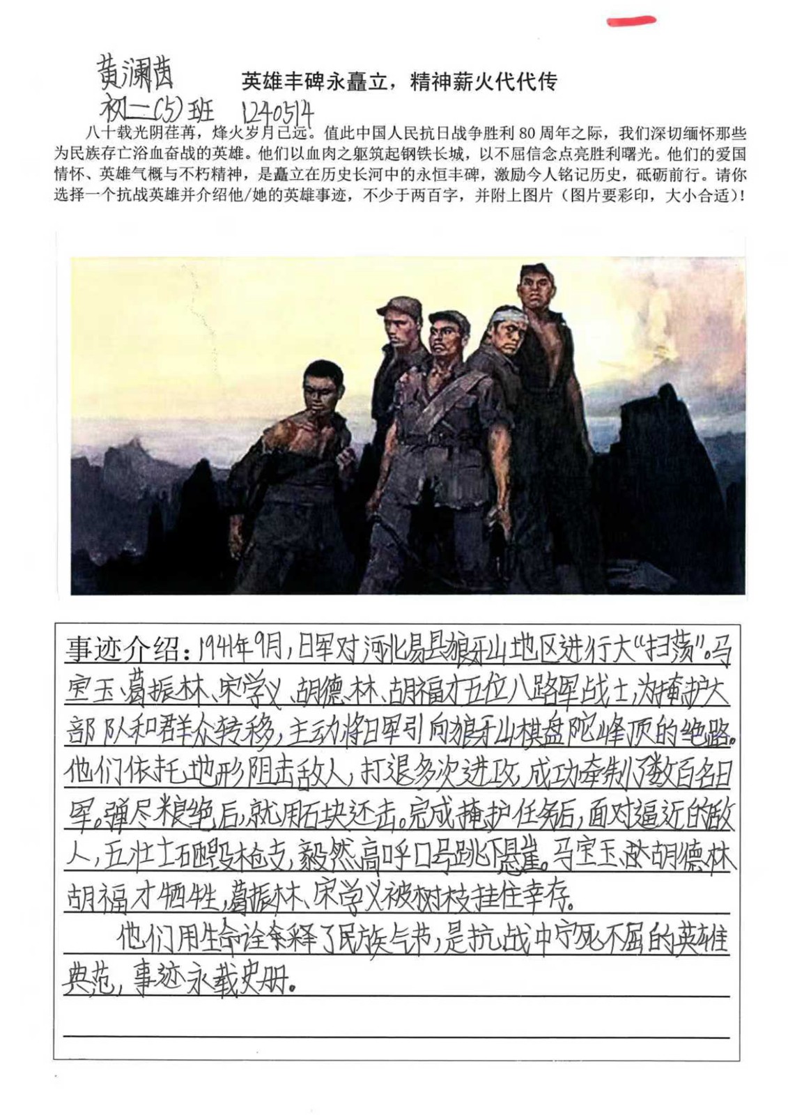 八十余年前,无数中华儿女用血肉之躯筑起抵御外侮的长城。他们是将军亦是士兵,是书生亦是农夫,在生与死的考验中,书写了一曲曲气壮山河的英雄壮歌。同学们以笔为媒,深入挖掘杨靖宇、赵一曼等抗战英雄的感人事迹,在字里行间抒发对英雄的崇敬与对历史的思考:杨靖宇在冰天雪地的长白山麓,以草根树皮甚至棉絮充饥,孤身与日寇周旋数日,直至生命最后一刻仍怒斥敌人的劝降;赵一曼在狱中遭受酷刑百般折磨,却始终坚贞不屈,留给儿子的遗书里那句 “母亲不用千言万语来教育你,就用行动来教育你;还有狼牙山五壮士,为掩护大部队转移,将敌人引上绝路,弹尽粮绝后毅然跳崖,那纵身一跃的身影,定格成中华民族永不弯折的脊梁... ...