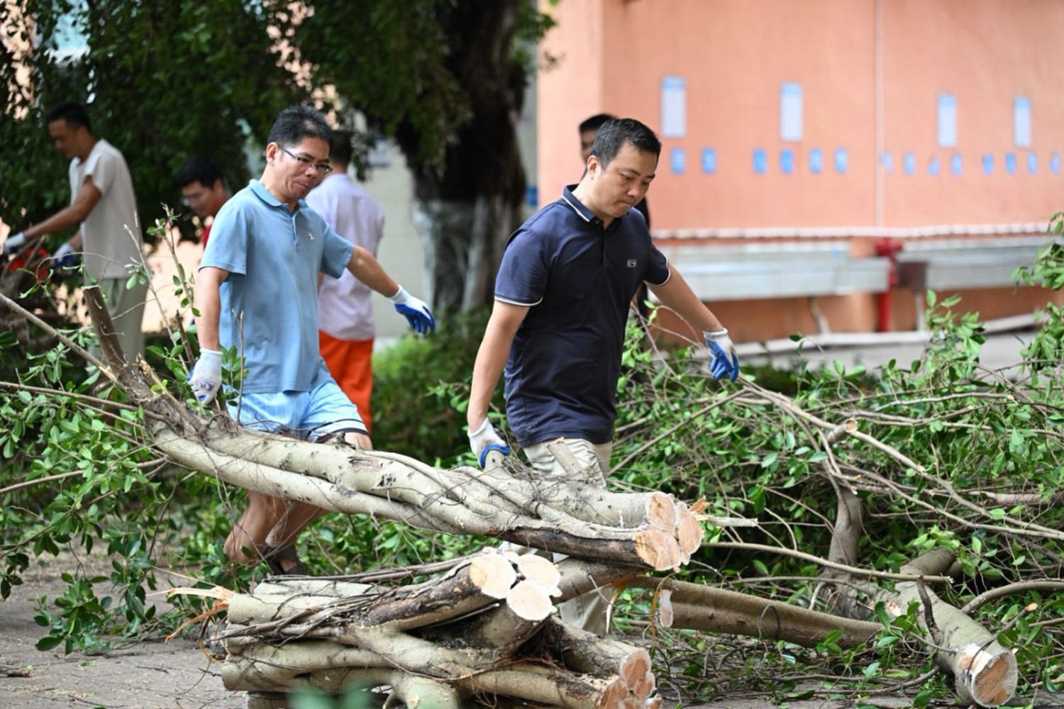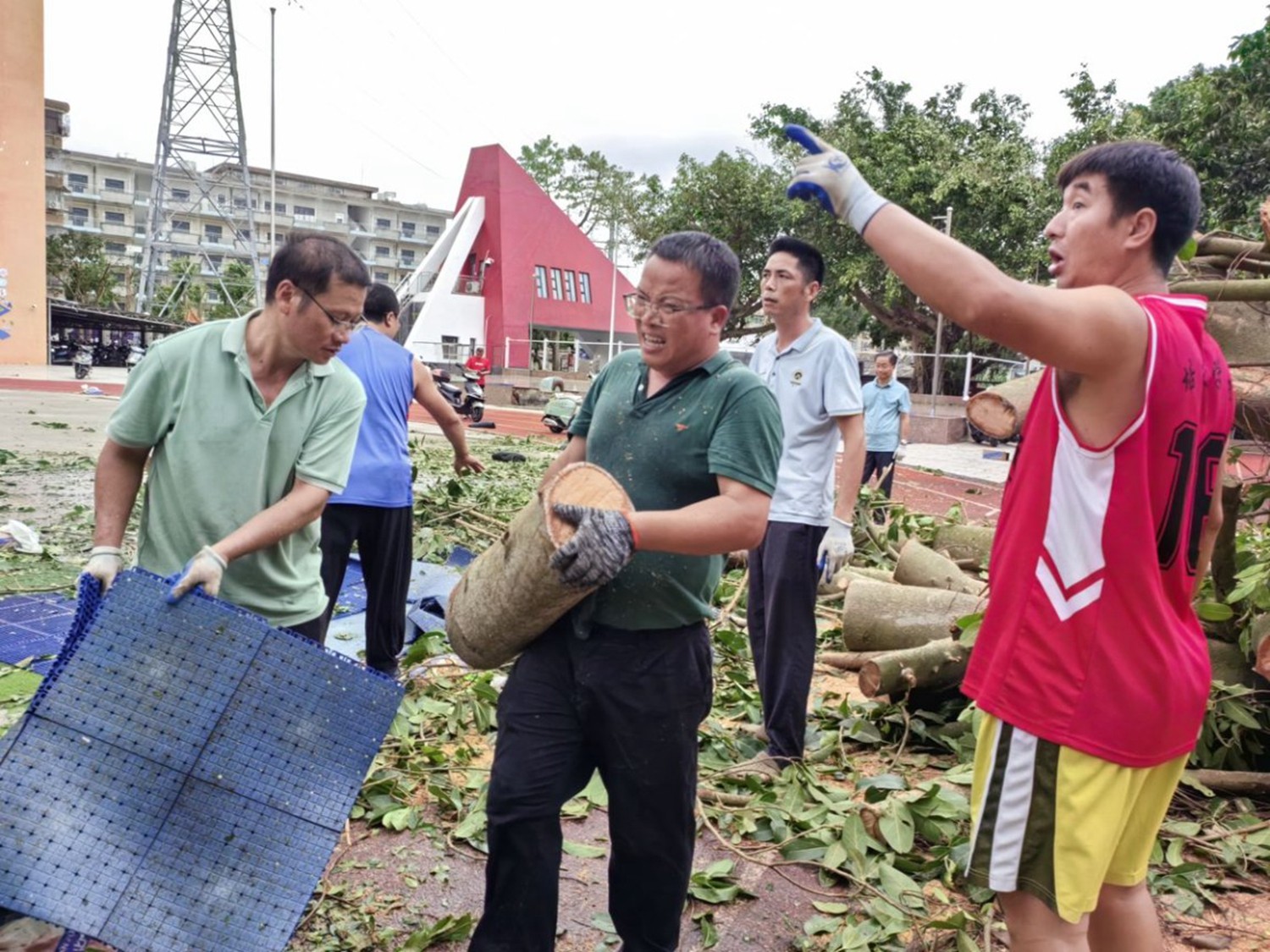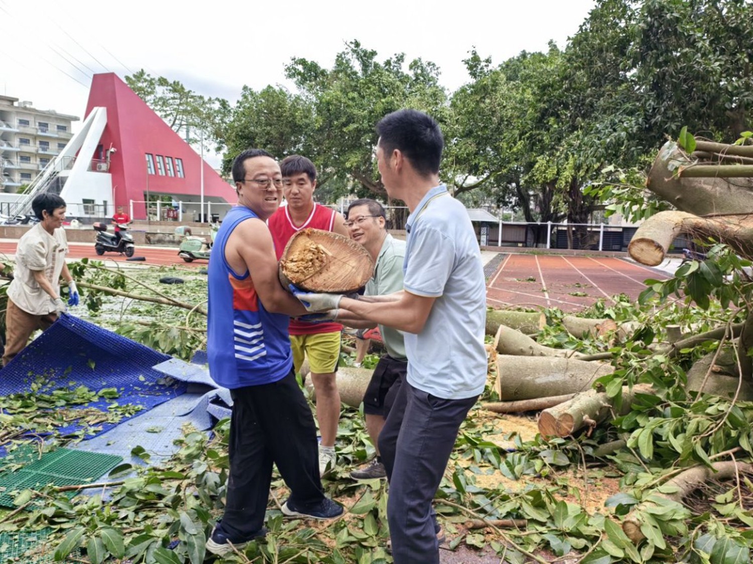 数棵大榕树被连根拔起,伏倒在地,如同大地的伤口。灾难留下的,不只是狼藉,更有挺身而出的身影。10月6日,从郑建忠总校长到后勤工作人员,近百人的队伍,从清晨到夜幕降临,砍、锯、扛、扫,用双手和汗水,为学校尽快恢复正常的教育教学秩序提供了保障。