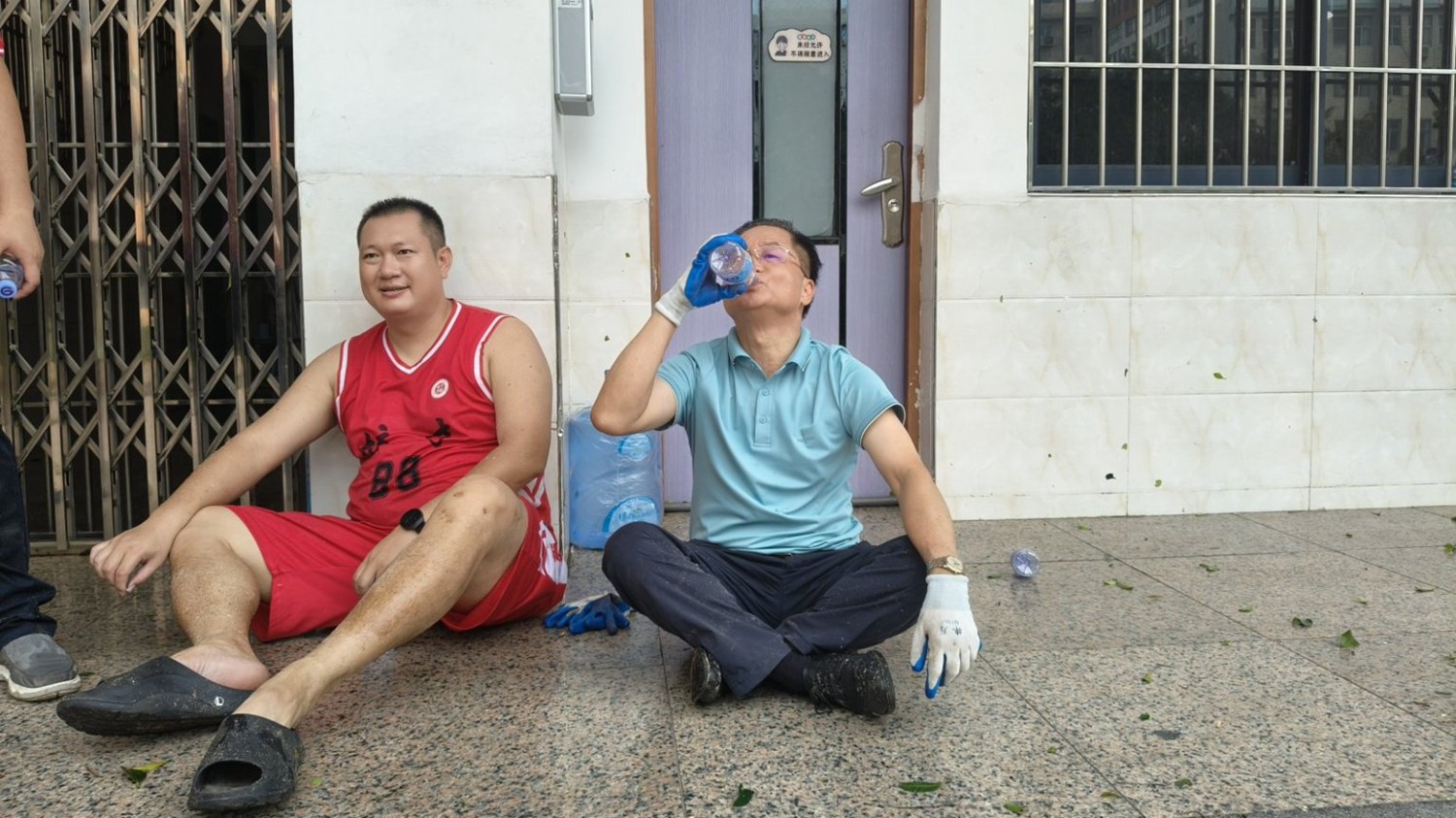 风雨中的每一份力量,都化作校园复苏的希望。郑校长爬上倾倒的、湿滑的树干,为了找到一个更好的发力点,半跪着,一下、一下地锯着比腰还粗的树干。在短暂的休息瞬间,郑校长席地而坐,接过水就仰头畅饮。此时此刻,他不再是那个在主席台上睿智儒雅的校长,他变成了一位竭尽全力的劳动者,用最本真的行动,诠释着何为“并肩作战”。老师们挥刀砍枝,打扫落叶,大汗淋漓。很多老师的家属,也自发加入清障的队伍,成为最坚实的“编外队员”。