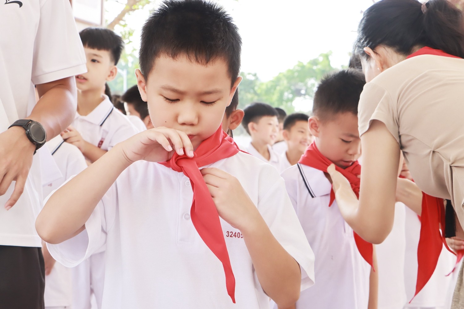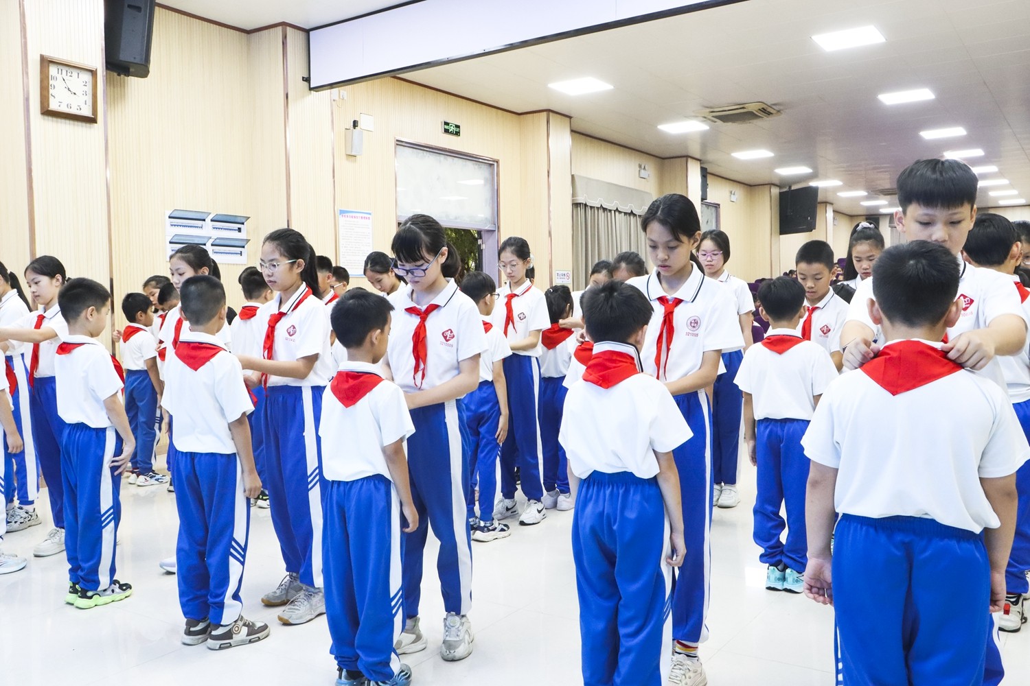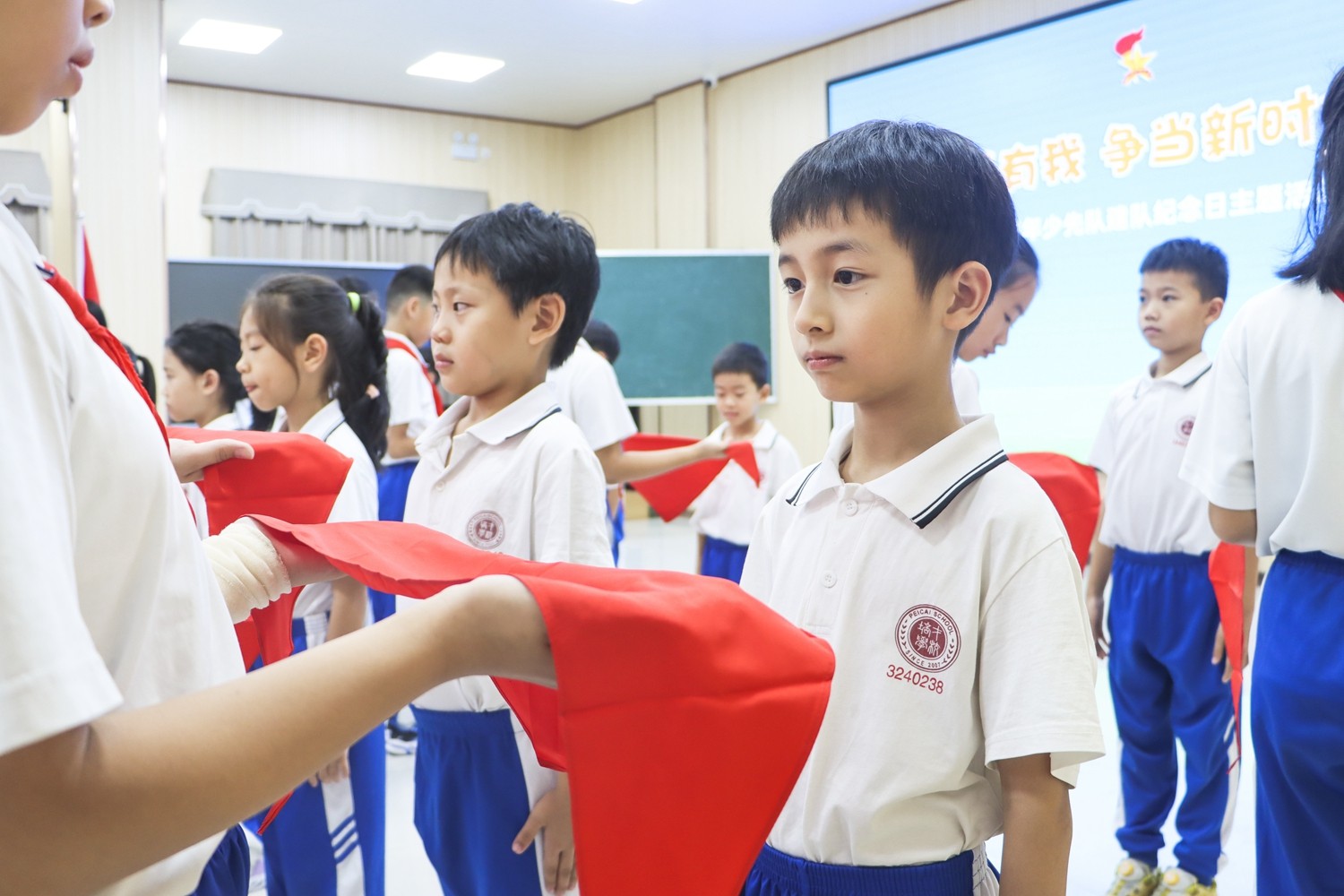 在庄重的乐曲声中,优秀少先队员代表为新队员佩戴红领巾。鲜艳的红领巾在胸前飘扬,象征着红色基因代代相传。新队员们精神抖擞,脸上洋溢着激动与自豪。