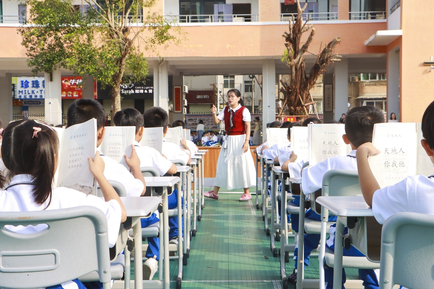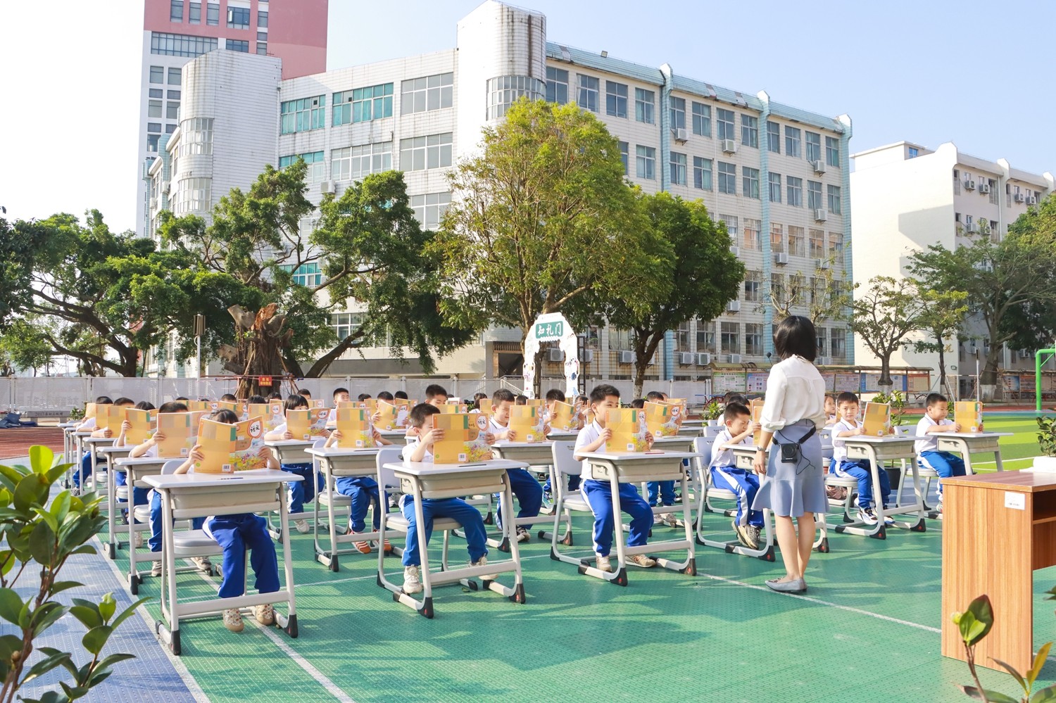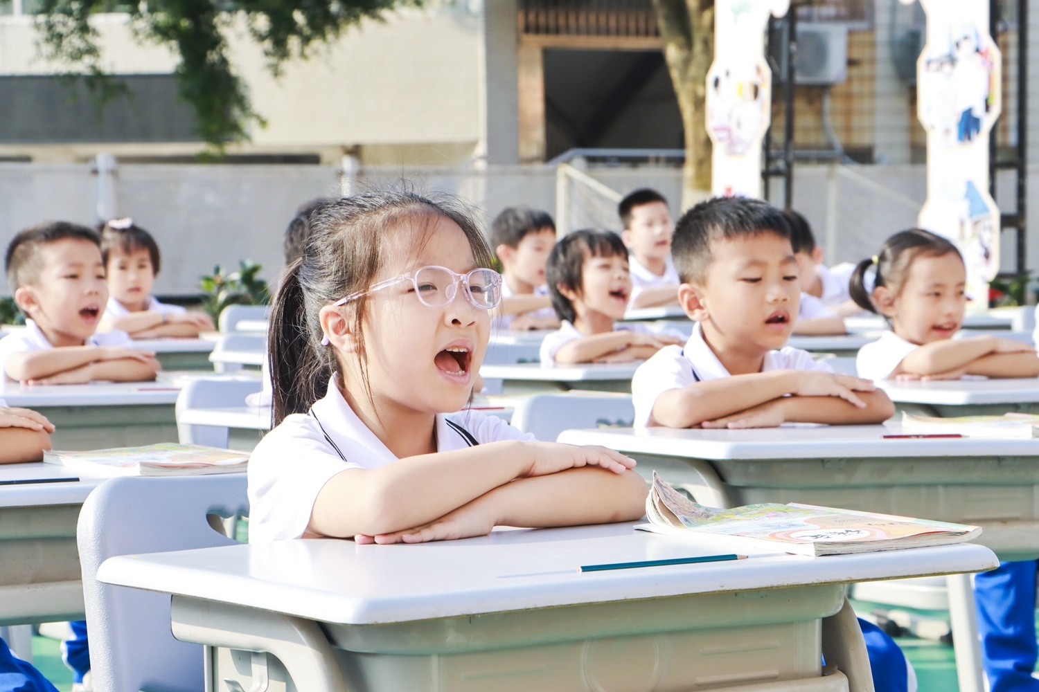 路队展示时,《运动员进行曲》奏响,小萌娃们身着整洁统一的校服入场,班级口令喊得刚劲而有力;课前准备环节,班长一声“书本摆放”,孩子们迅速将课本归位,坐姿端正如同挺拔的小树苗;读书时,整齐划一,富有情感,清脆的童声回荡在广场上空。