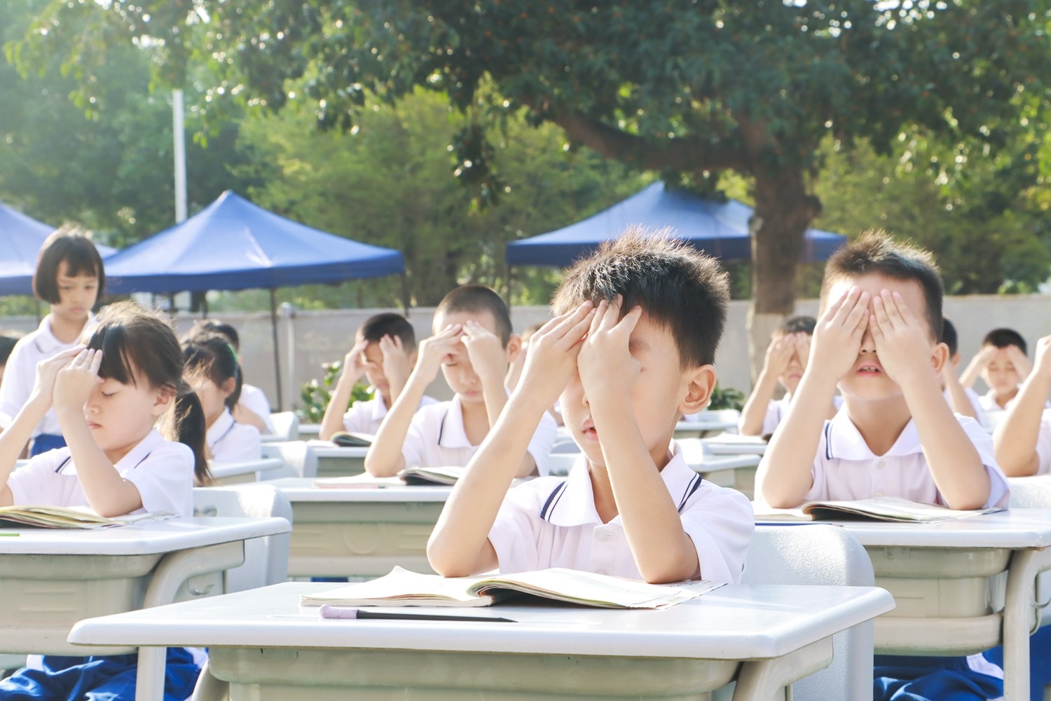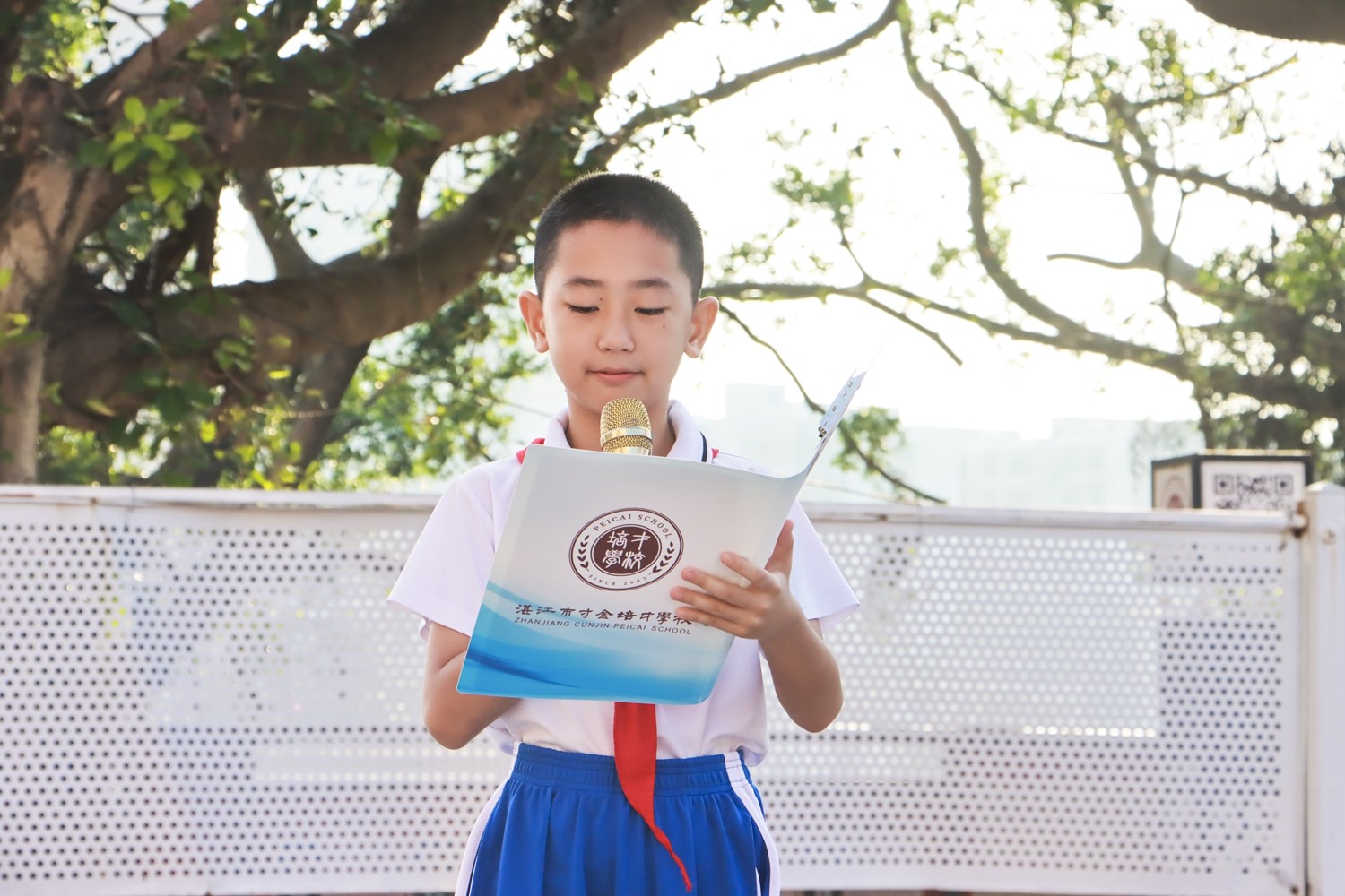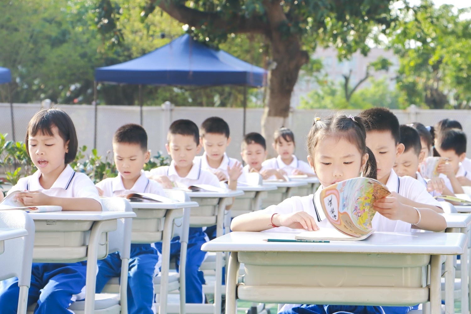 路队展示时,《运动员进行曲》奏响,小萌娃们身着整洁统一的校服入场,班级口令喊得刚劲而有力;课前准备环节,班长一声“书本摆放”,孩子们迅速将课本归位,坐姿端正如同挺拔的小树苗;读书时,整齐划一,富有情感,清脆的童声回荡在广场上空。