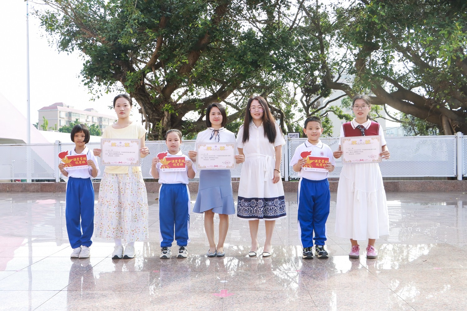 比赛尾声,关彩英副校长对各班表现进行点评,肯定了孩子们的努力与进步;李雪迎副校长宣读成绩,最终评选出 3 个“课堂常规示范班”和 3 个“课堂常规优秀班”,黄杰翔校长现场颁发奖状,获奖班级的孩子们欢呼雀跃,脸上绽放出灿烂的笑容。
