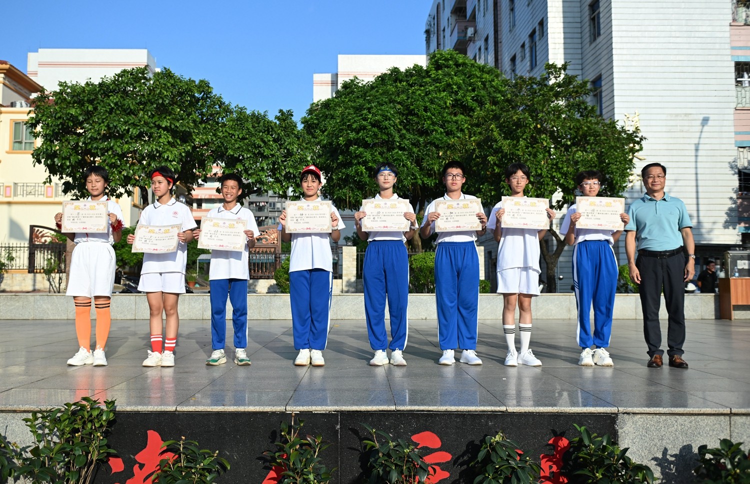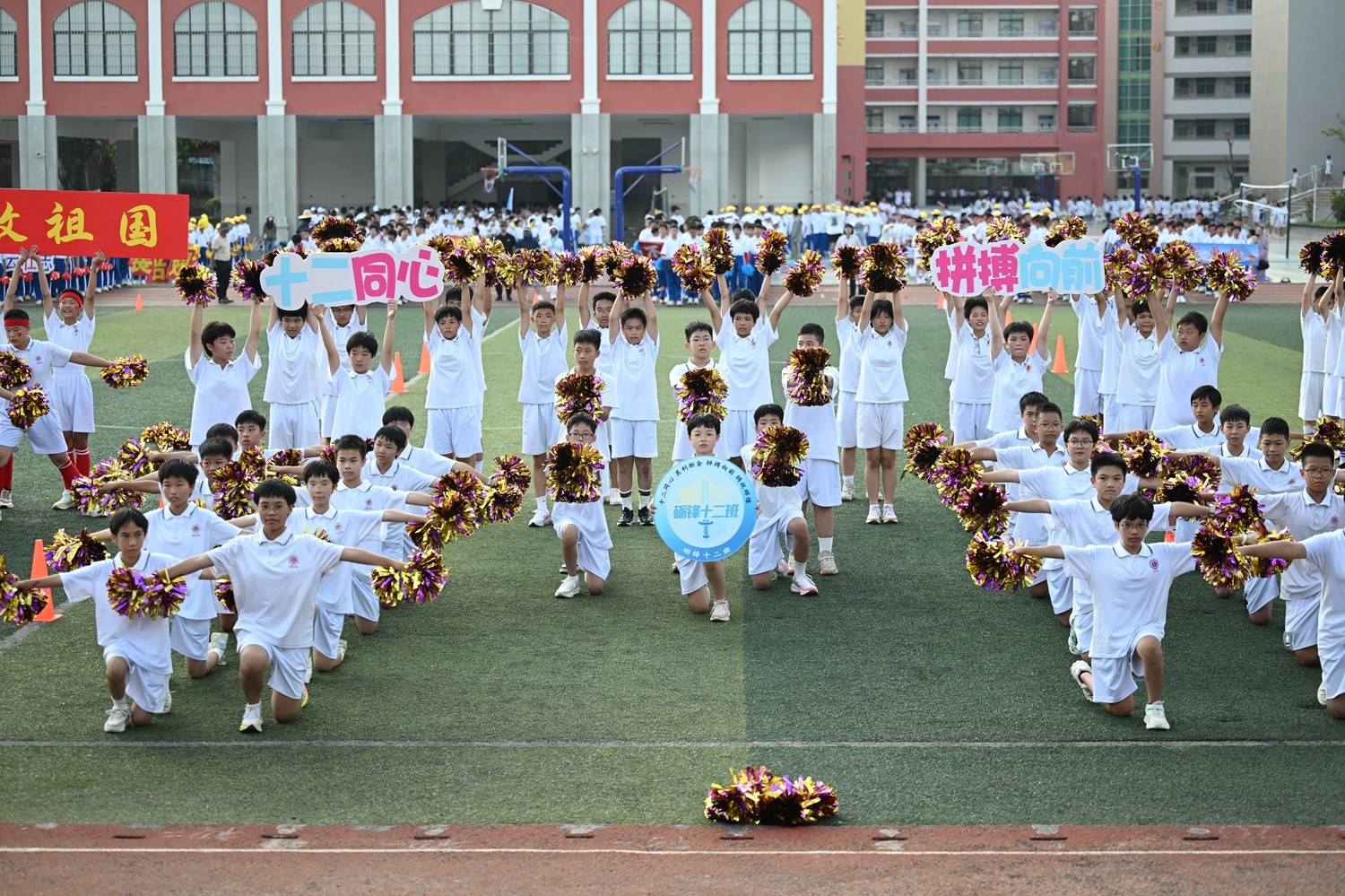 随后,体卫艺处陈超荣主任宣布了比赛结果。本次比赛共评出特等奖8名、一等奖14名、二等奖12名。颁奖时刻,全场沸腾,掌声与欢呼声交织成一片欢乐的海洋。郑校长为获奖班级代表颁发奖状并合影留念。特等奖获奖班级进行了洋溢青春活力的风采展示。
