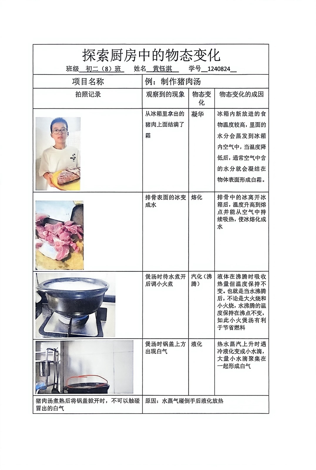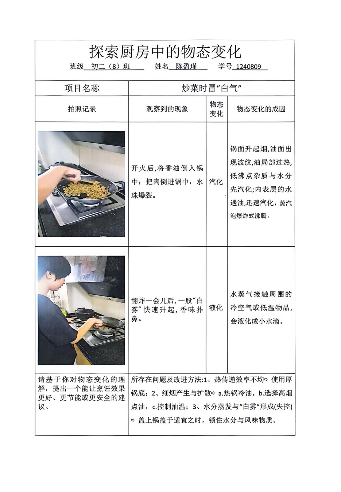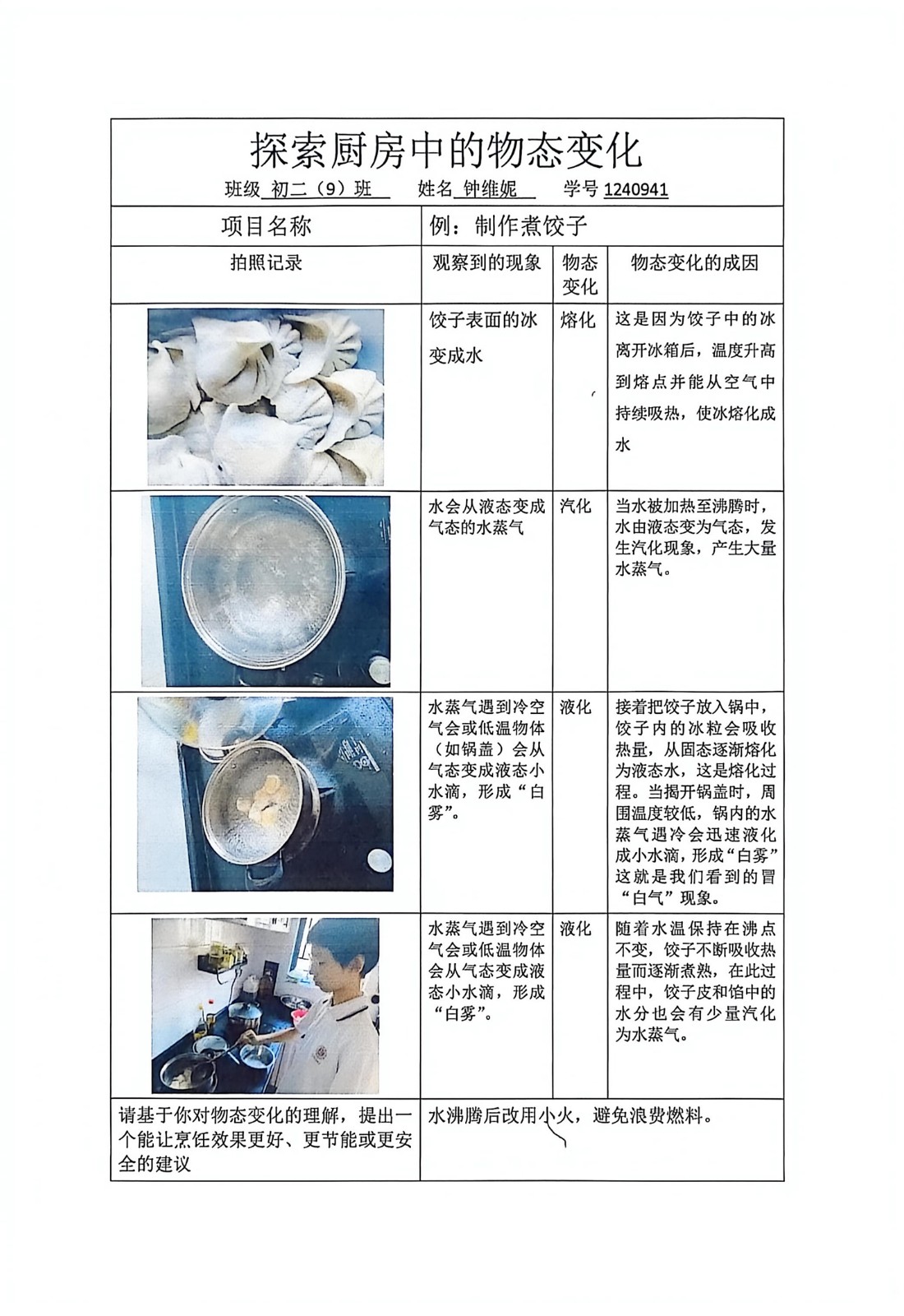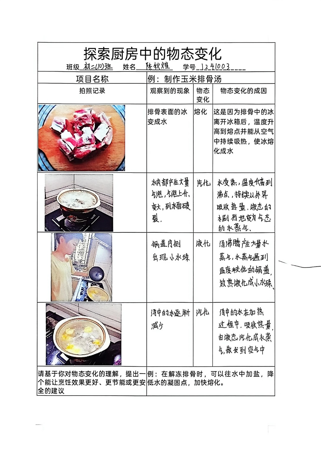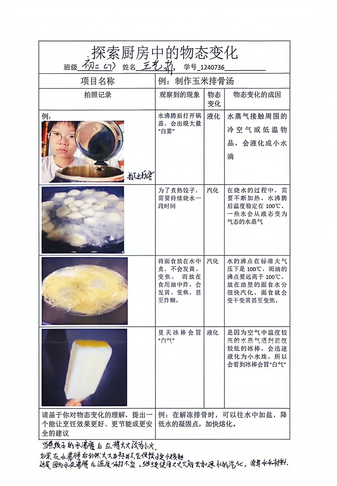 近日,我校初二物理科组举办的一场以“跨学科实践:探索厨房中的物态变化”为主题的跨学科实践活动比赛圆满落幕。活动以家庭厨房为实践阵地,引导学生在烹饪的烟火气中观察物理现象,用镜头记录物态变化瞬间,以实践报告梳理知识脉络,让抽象的物理概念在生活场景中落地生根。