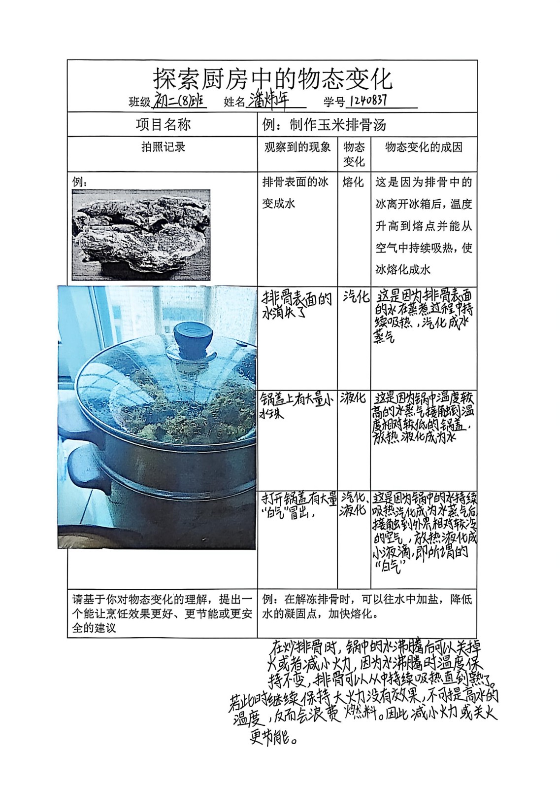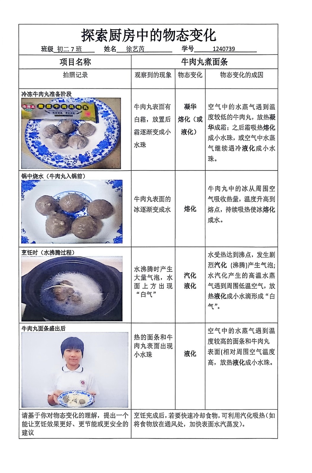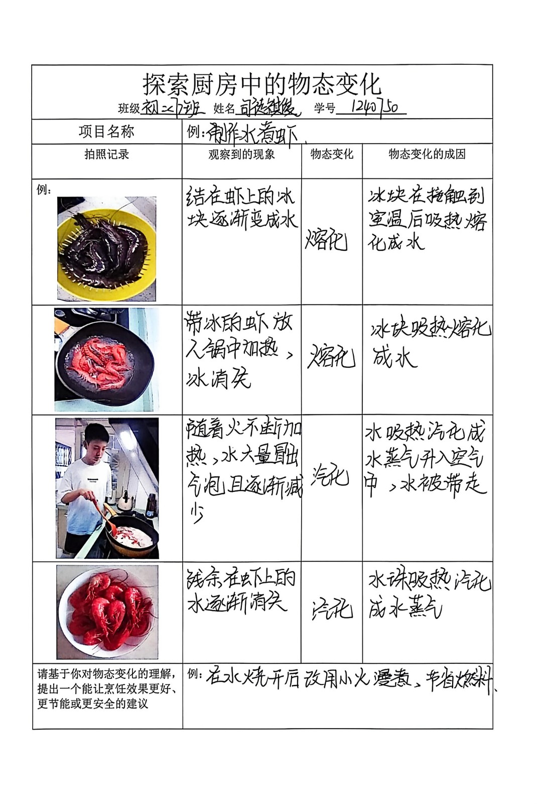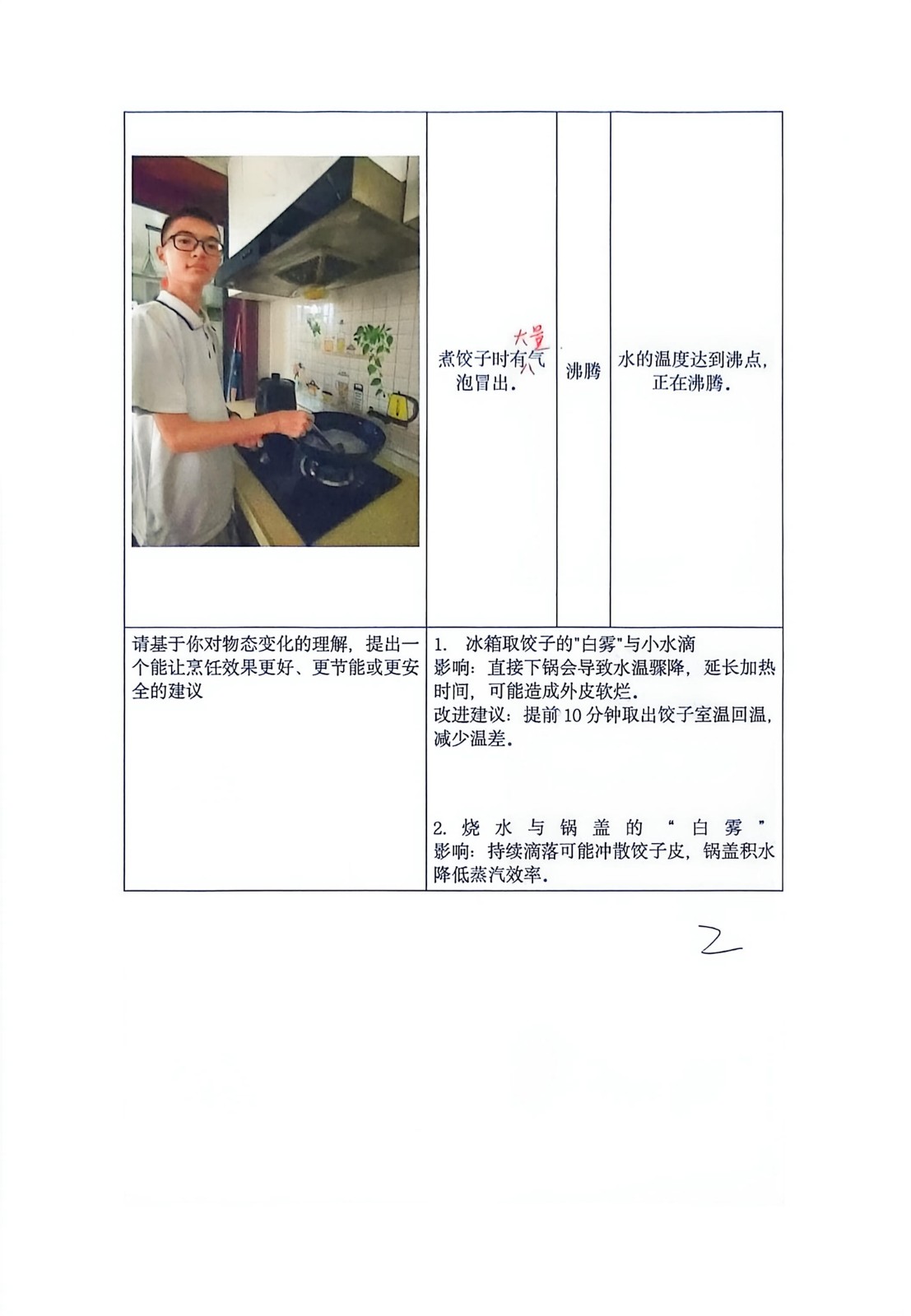 近日,我校初二物理科组举办的一场以“跨学科实践:探索厨房中的物态变化”为主题的跨学科实践活动比赛圆满落幕。活动以家庭厨房为实践阵地,引导学生在烹饪的烟火气中观察物理现象,用镜头记录物态变化瞬间,以实践报告梳理知识脉络,让抽象的物理概念在生活场景中落地生根。
