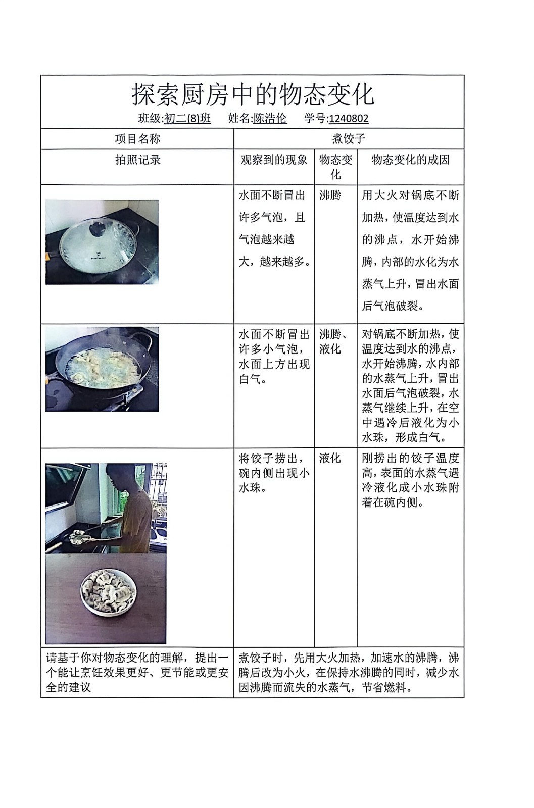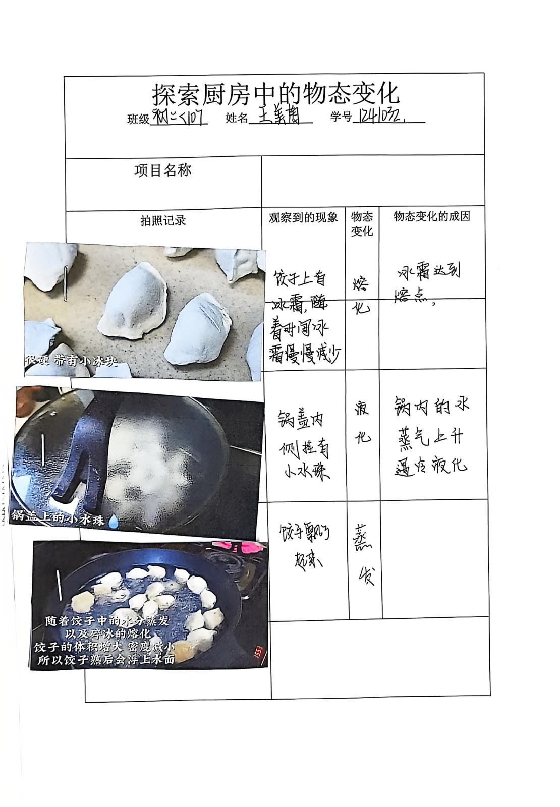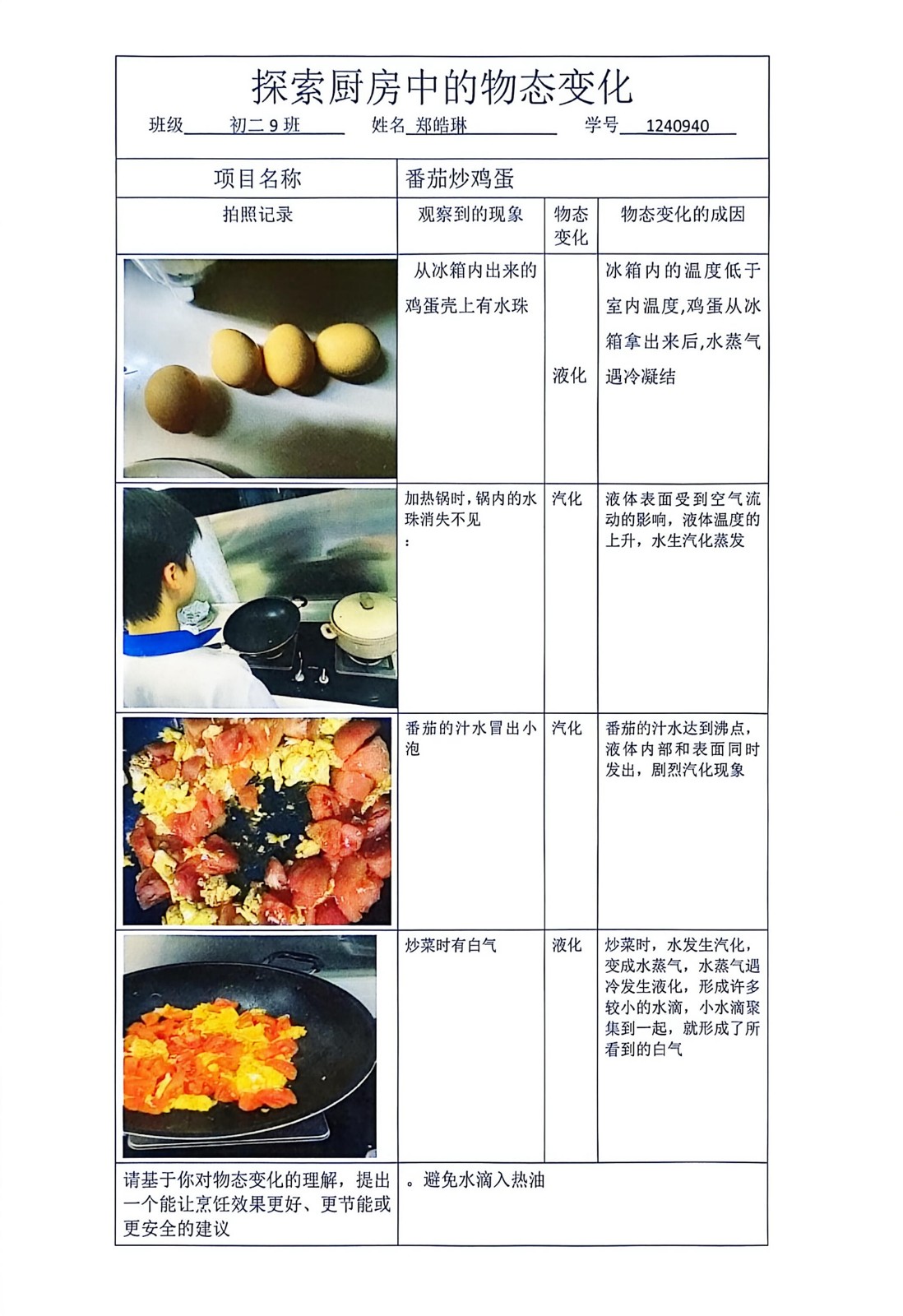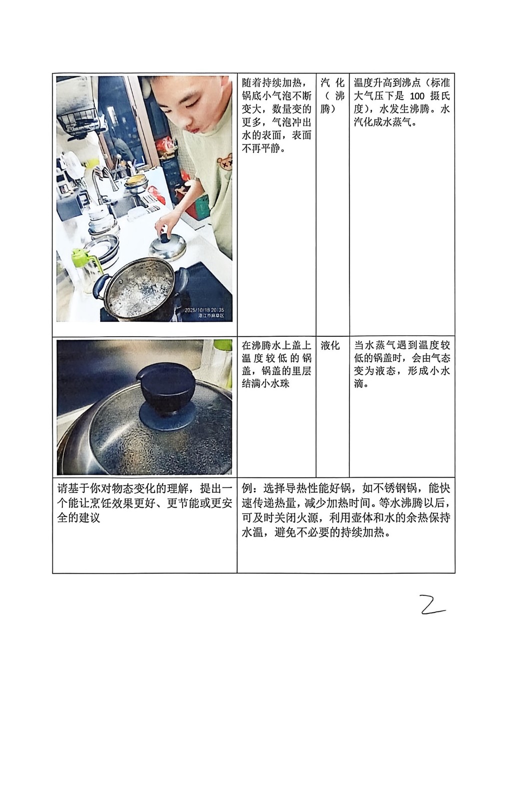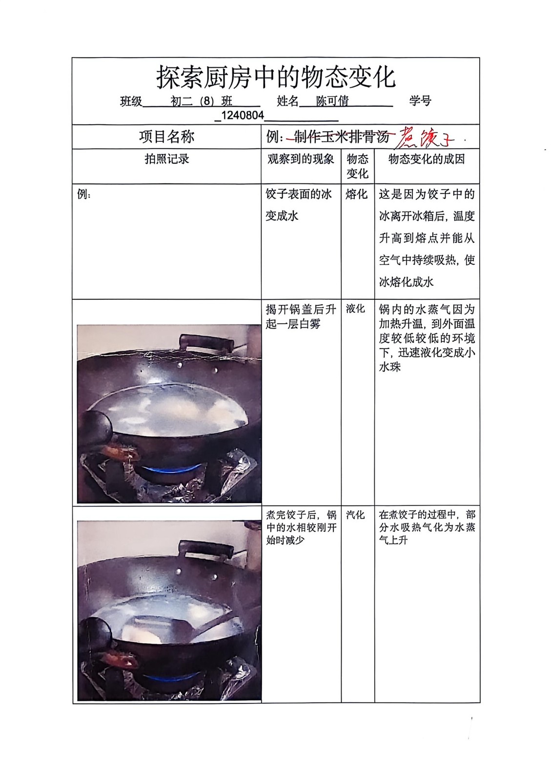 近日,我校初二物理科组举办的一场以“跨学科实践:探索厨房中的物态变化”为主题的跨学科实践活动比赛圆满落幕。活动以家庭厨房为实践阵地,引导学生在烹饪的烟火气中观察物理现象,用镜头记录物态变化瞬间,以实践报告梳理知识脉络,让抽象的物理概念在生活场景中落地生根。