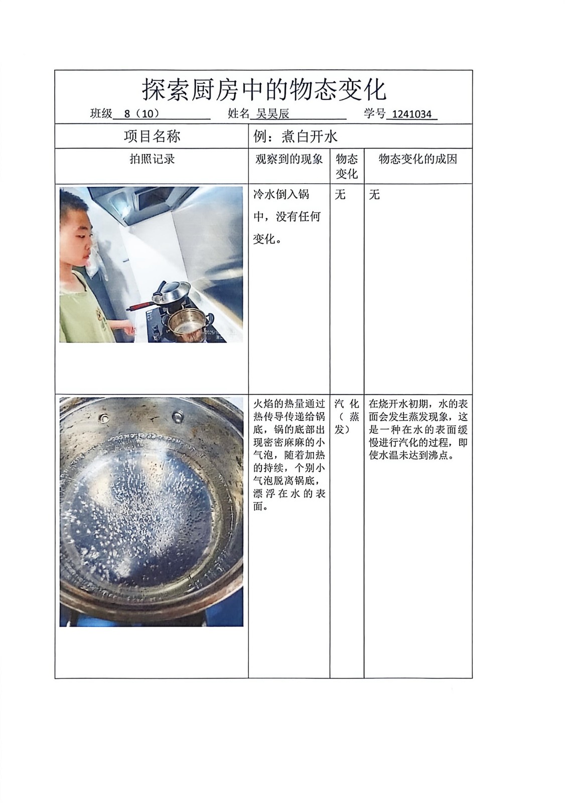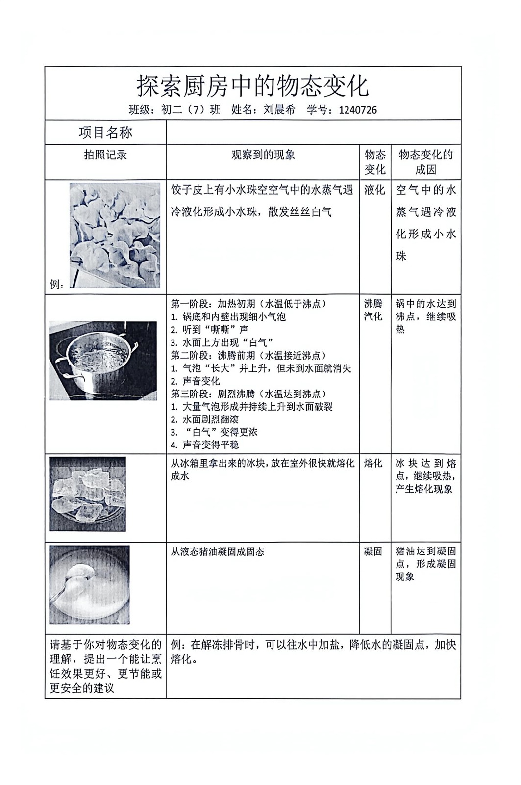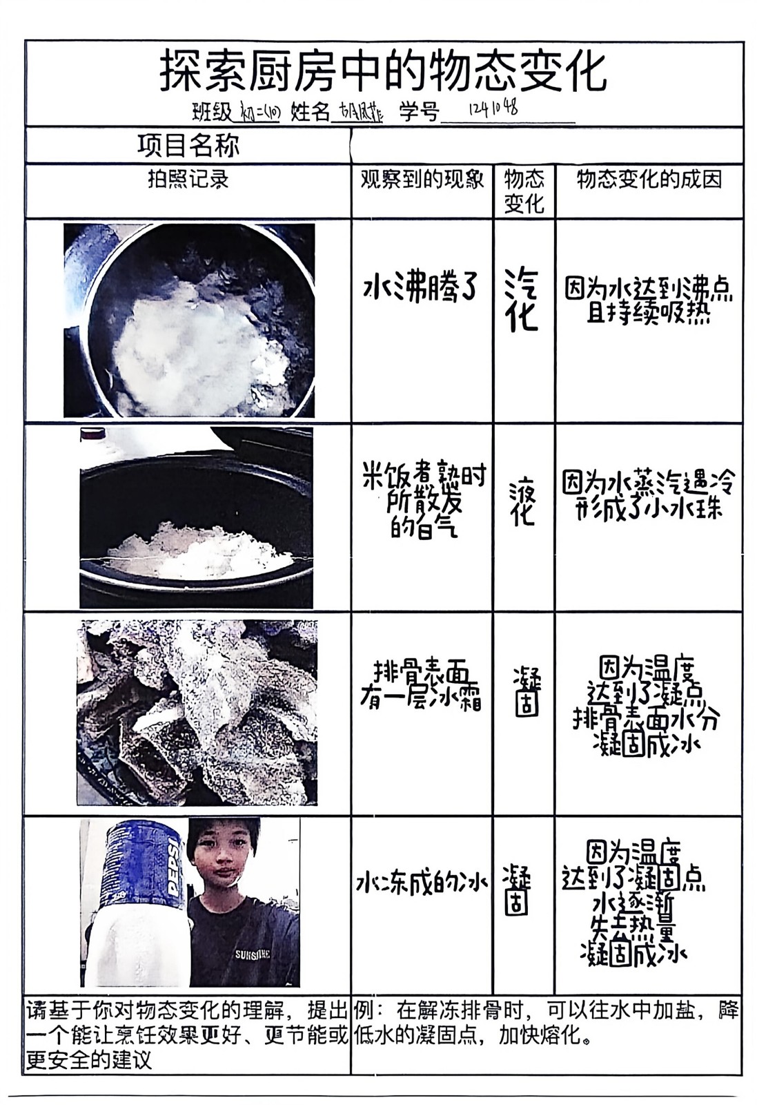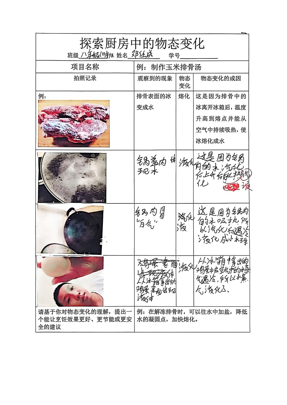 本次居家实践活动紧扣物理学科核心知识点,聚焦“让抽象知识具象化、让课堂知识生活化”的核心目标:引导学生主动观察居家烹饪中的常见场景(如煮水沸腾、冻肉解冻、蒸馒头冒“白气”、炒菜时油星飞溅等),精准识别其中蕴含的熔化、凝固、汽化、液化等物态变化类型;通过“拍照记录+现象描述+原理分析”的形式,培养学生的观察能力、细节捕捉能力与逻辑梳理能力,让学生在动手操作中深化对物态变化条件、规律的理解;打破“物理学习仅局限于课堂”的认知,鼓励学生从生活中挖掘科学素材,养成“用物理视角看待日常现象”的思维习惯。