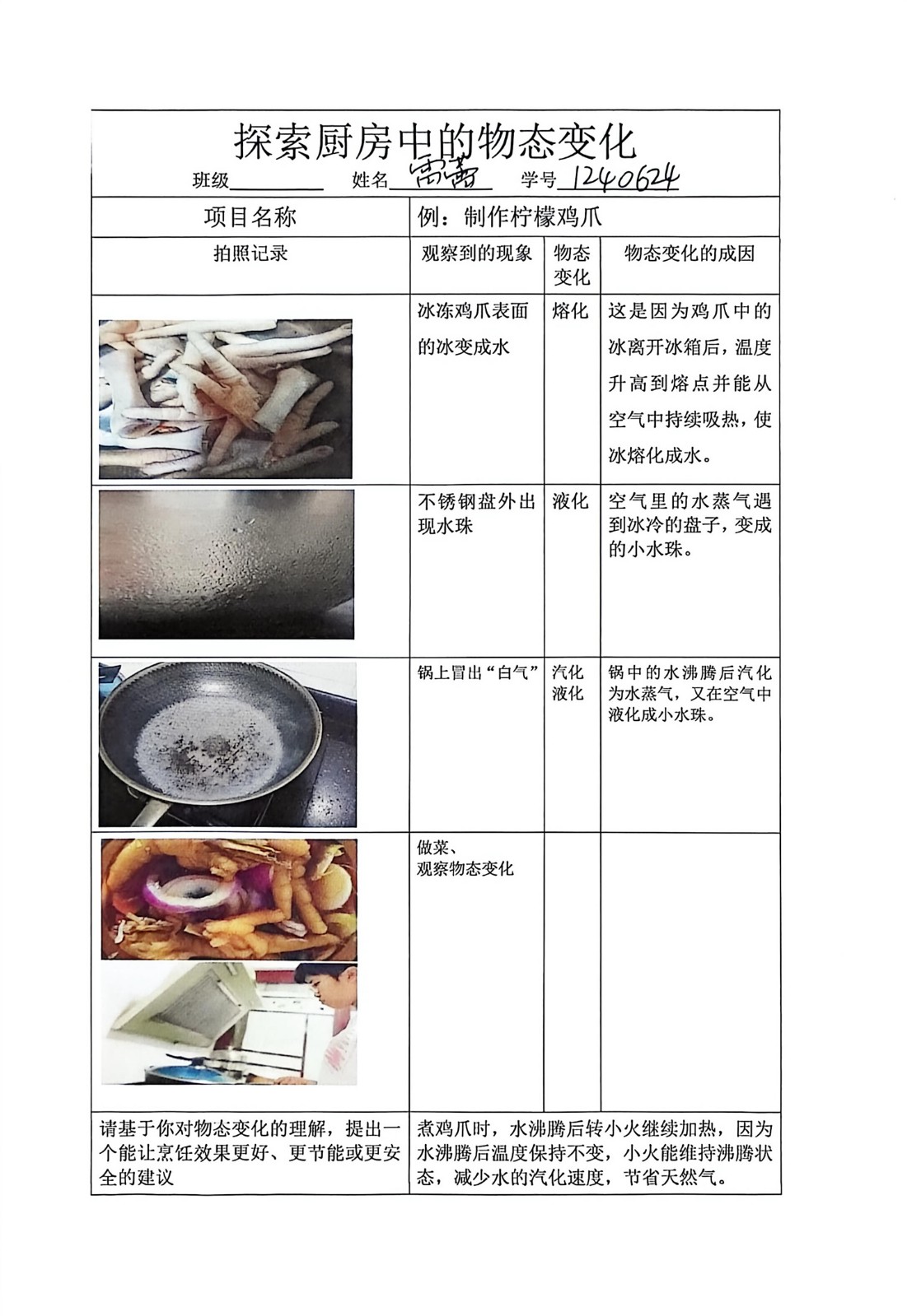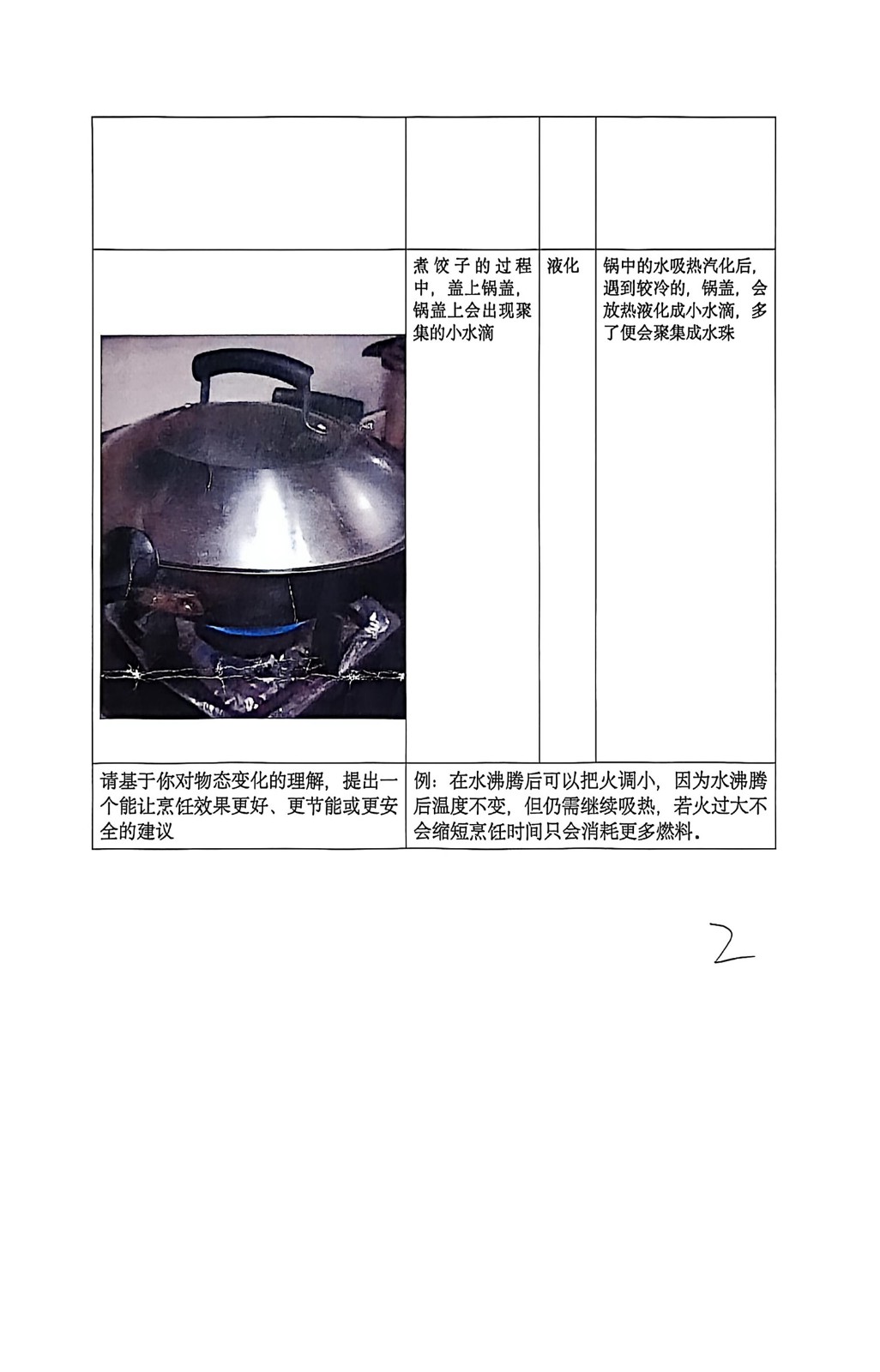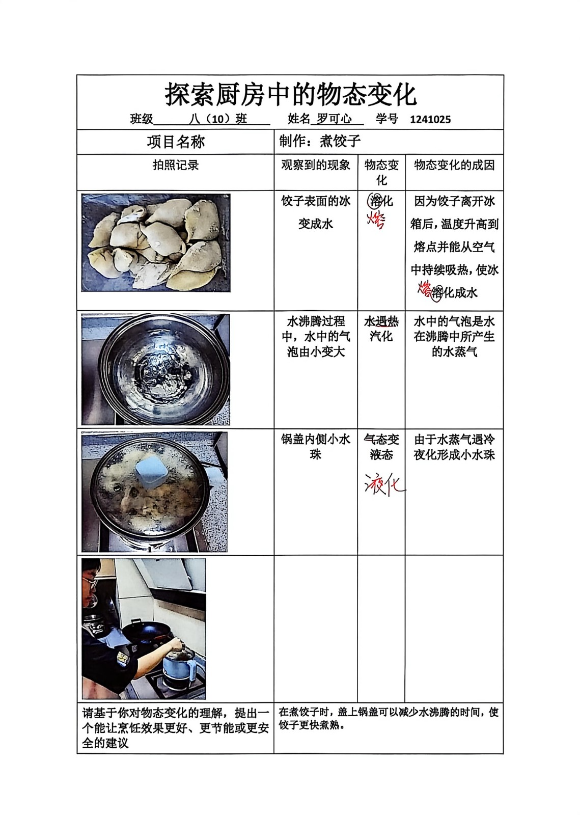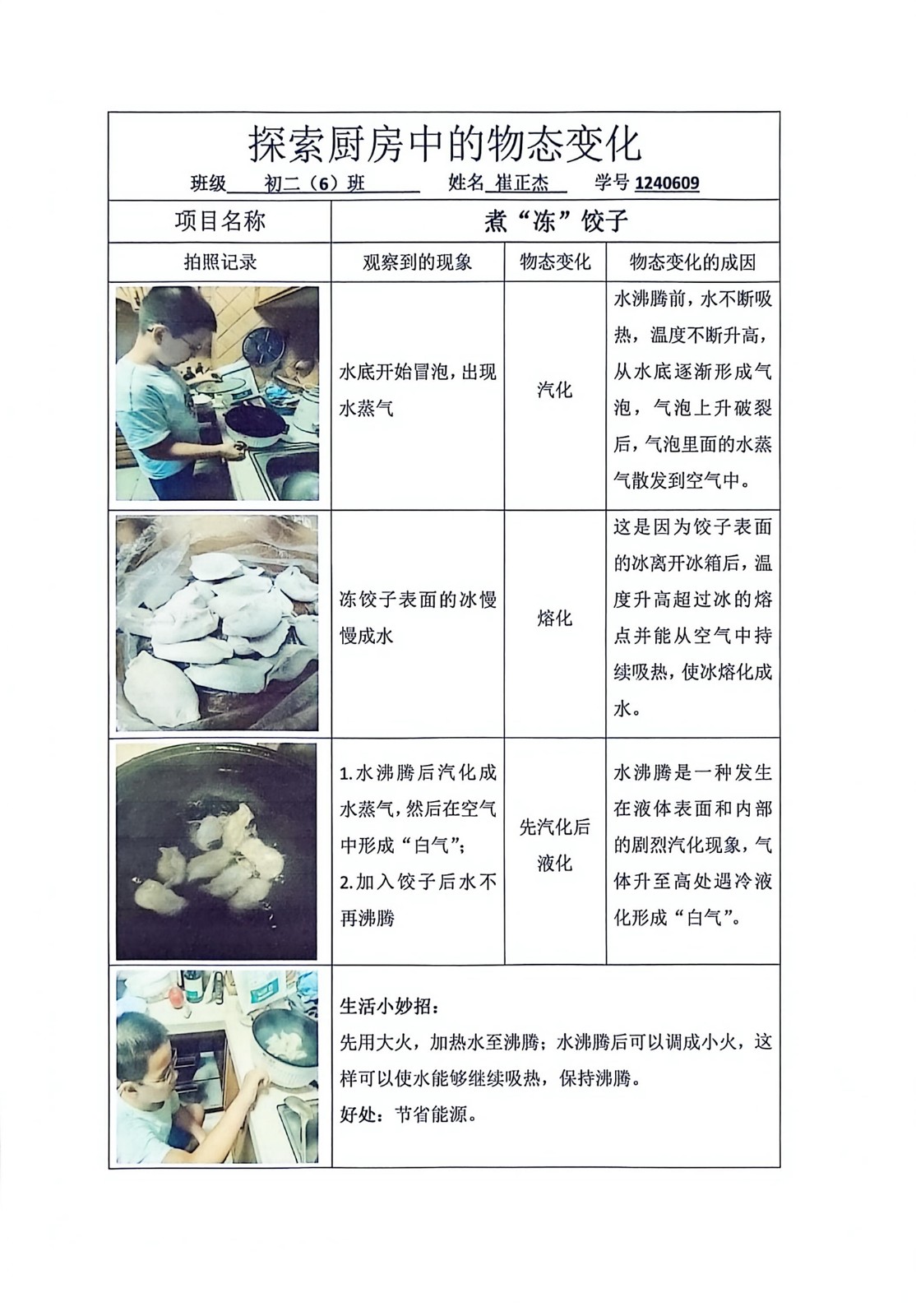 本次居家实践活动紧扣物理学科核心知识点,聚焦“让抽象知识具象化、让课堂知识生活化”的核心目标:引导学生主动观察居家烹饪中的常见场景(如煮水沸腾、冻肉解冻、蒸馒头冒“白气”、炒菜时油星飞溅等),精准识别其中蕴含的熔化、凝固、汽化、液化等物态变化类型;通过“拍照记录+现象描述+原理分析”的形式,培养学生的观察能力、细节捕捉能力与逻辑梳理能力,让学生在动手操作中深化对物态变化条件、规律的理解;打破“物理学习仅局限于课堂”的认知,鼓励学生从生活中挖掘科学素材,养成“用物理视角看待日常现象”的思维习惯。