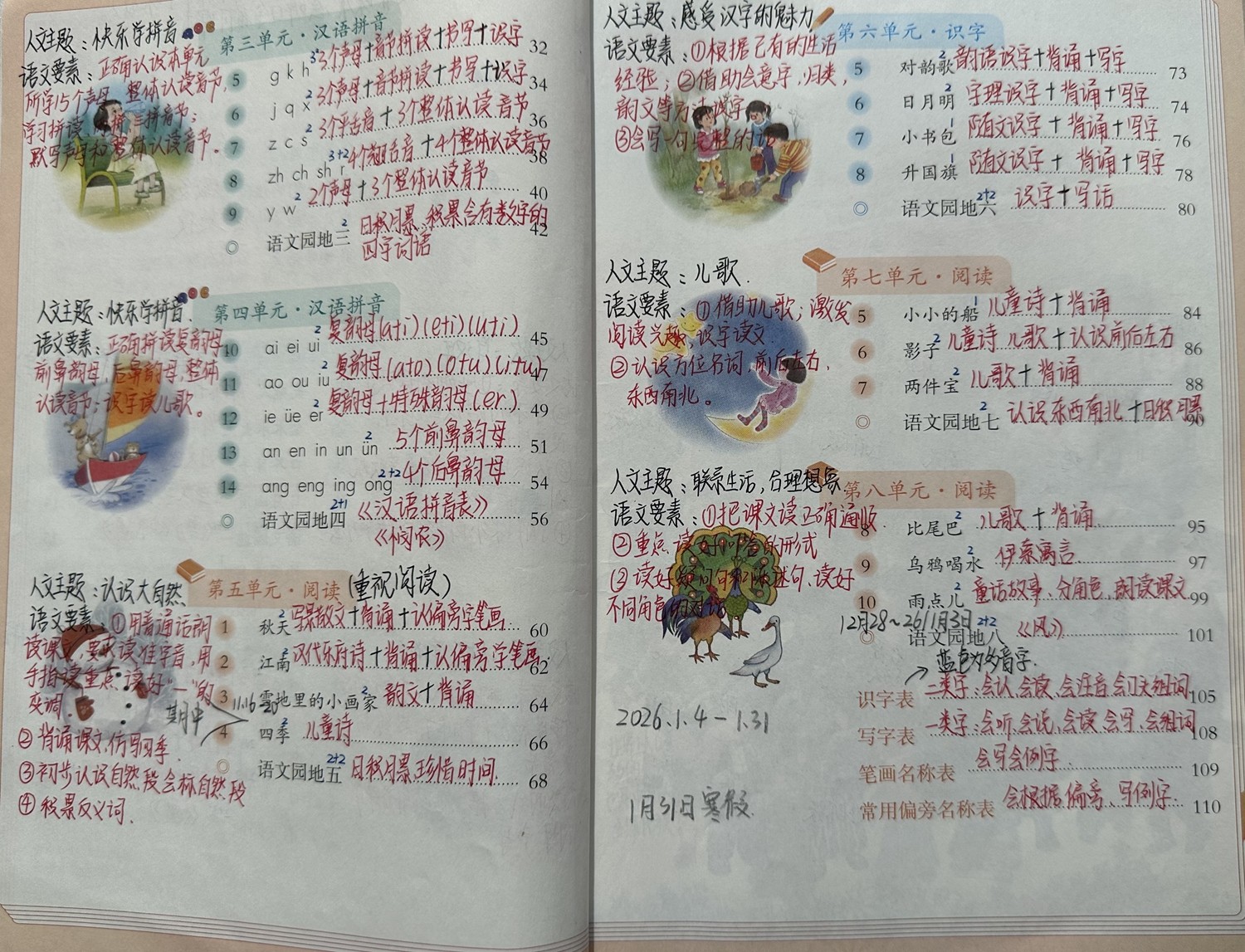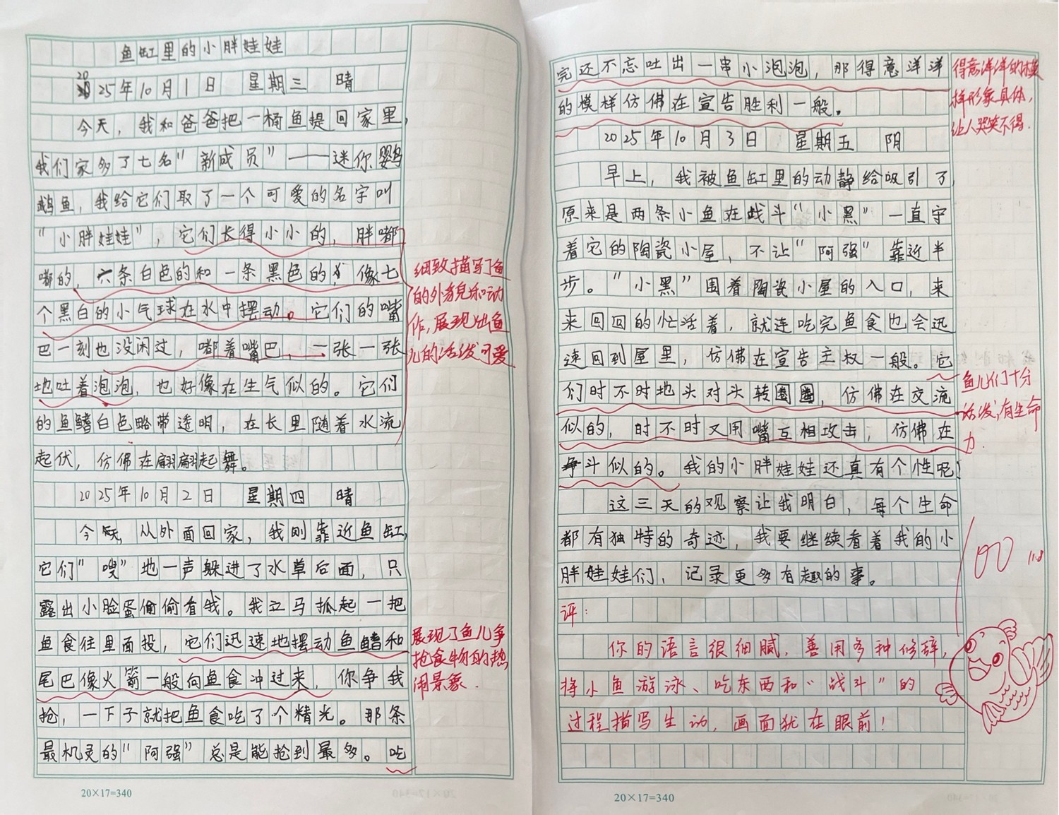语文学科的学习,是一场始于笔墨、成于思想的渐进之旅。低年级学生的拼音和汉字书写虽显稚嫩,但笔画间萌发汉字风骨;中年级学生的书写逐渐端正,能注意字句间的布局;高年级学生则逐渐于文章中驰骋思想,其读书笔记见解独到,展现了从文字积累到文化认同的深刻蜕变。
