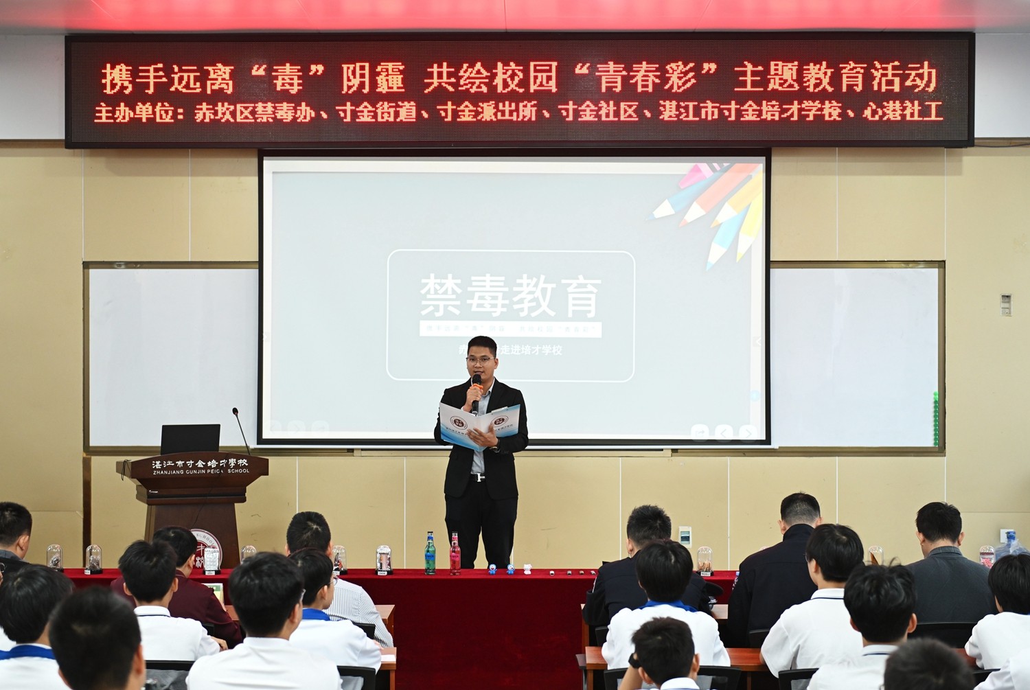 本次活动旨在通过多元化的宣传教育形式,帮助学生认清毒品危害,树立“远离毒品、健康成长”的理念。赤坎区寸金街道党工委副书记、政法委员徐泓光,赤坎区禁毒办副主任、禁毒大队副大队长李秋源,湛江市寸金培才学校常务副校长洪小湖,赤坎公安分局寸金派出所副所长何伟文,赤坎区寸金街道寸金社区书记王朝峰,赤坎区禁毒办宣讲师梁嘉敏,赤坎区心港社会工作服务中心秘书长陈斯以及学校初中部分德育领导出席活动,体现了社会各界对青少年禁毒工作的高度重视。