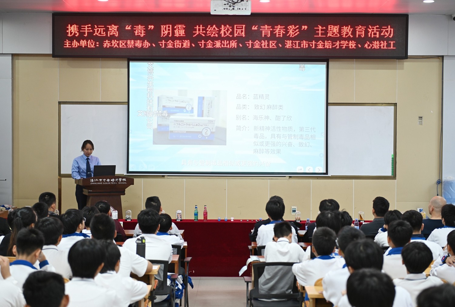 为深入推进青少年毒品预防教育,切实筑牢青少年识毒、防毒、拒毒的思想防线,营造无毒校园环境,2025年12月17日下午,我校联合赤坎区禁毒办、寸金街道、寸金派出所、寸金社区、心港社工等单位,共同举办了禁毒主题教育活动。活动在学校宁远楼201会议室举行,初一年级学生参与,现场气氛庄重而热烈。