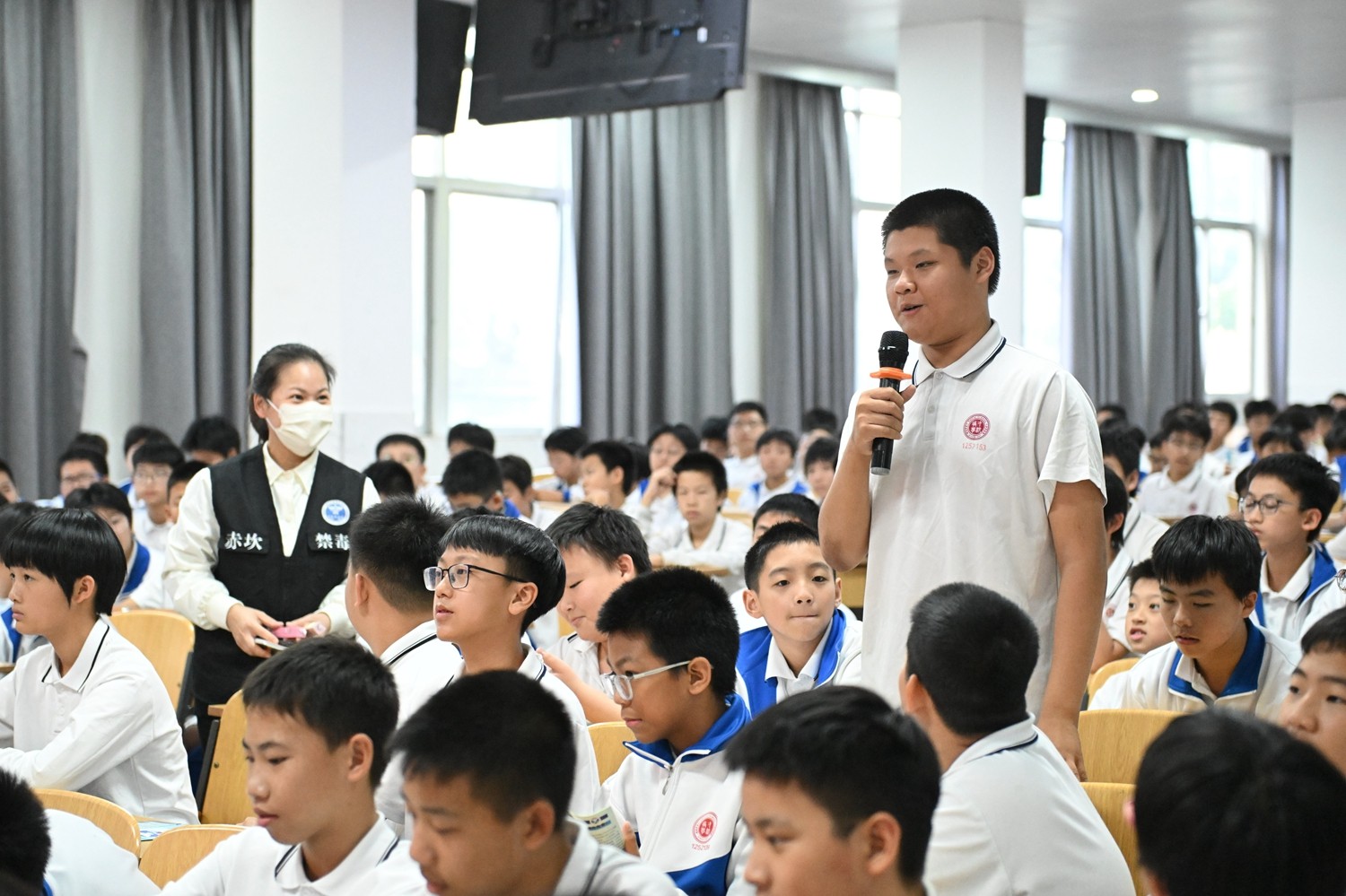 活动在初一年级副级长何亲的主持下拉开序幕。随后,赤坎区禁毒办宣讲师梁嘉敏为同学们带来了别开生面的专题讲座,她借助图片和视频等资料深入剖析毒品危害,介绍如“喵喵”“蓝精灵”“开心果”“可乐”“曲奇饼干”“开心水”等生活中易混淆的毒品模型。现场穿插彩蛋“彩虹烟”识别的互动环节,学生们踊跃参与,“零距离”辨识毒品的伪装。现场工作人员给学生们派发禁毒宣传小册,学生们在思考与交流中深化了对毒品巨大危害性的认知,也掌握了实用的自我保护方法。