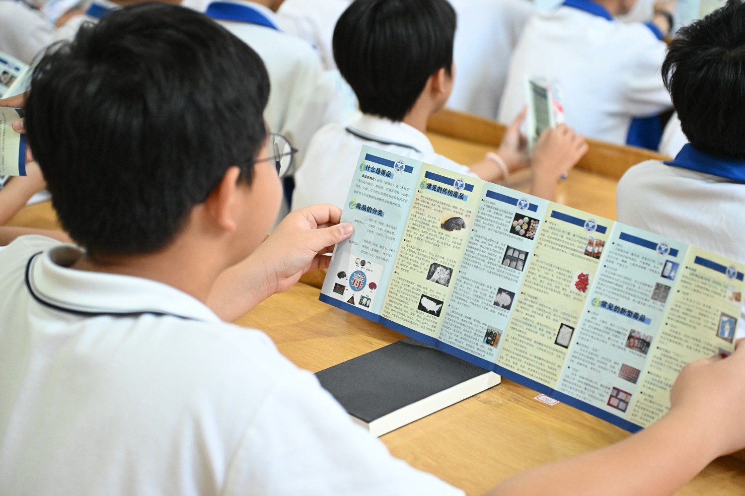 学生排队观看毒品样品