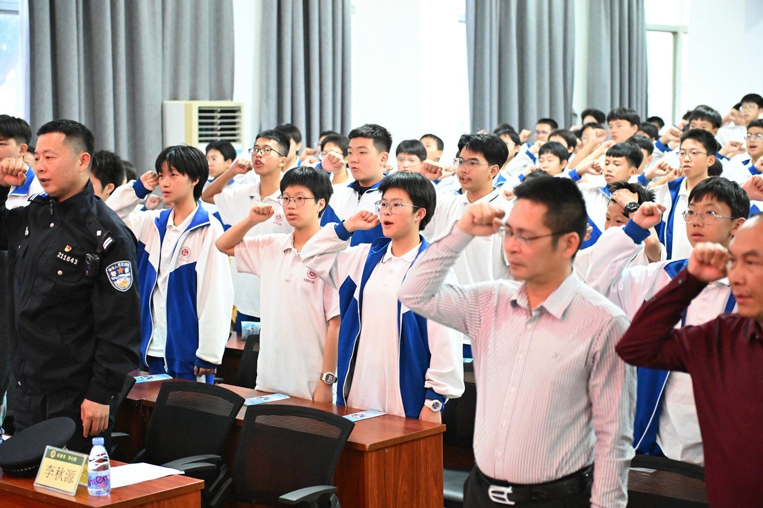 紧接着,现场进入到庄严时刻,在赤坎区禁毒办副主任、禁毒大队副大队长李秋源的带领下,全体师生肃立,举起右手,用铿锵有力的声音共同宣读“禁毒誓词”,坚定的誓言回荡在会场,彰显了师生们坚决抵制毒品的决心。