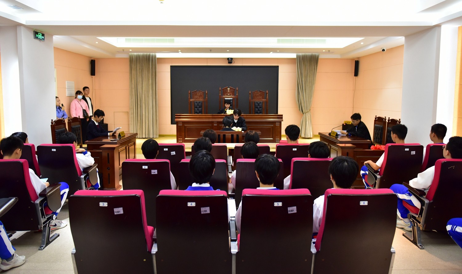 在此次活动中,初二年级的十五位同学分别扮演审判长、审判员、书记员、公诉人、被告人、辩护人、法警、被害人等角色,生动再现了一起寻衅滋事案件的庭审现场。