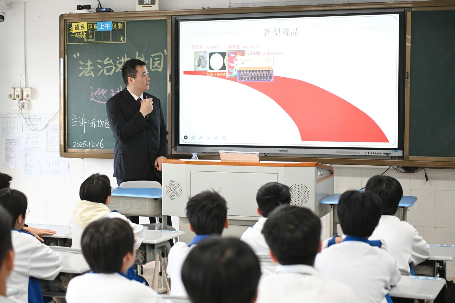 12月16日下午,我校联合湛江市赤坎区人民检察院共同开展了“法治进校园”活动,我校初一年级全体学生参加了活动。赤坎区人民检察院党组成员江丽兵、我校常务副校长洪小湖、德育处主任林振群、德育处副主任贾莉敏、初一年级级长何九林等领导共同出席了活动见面会。