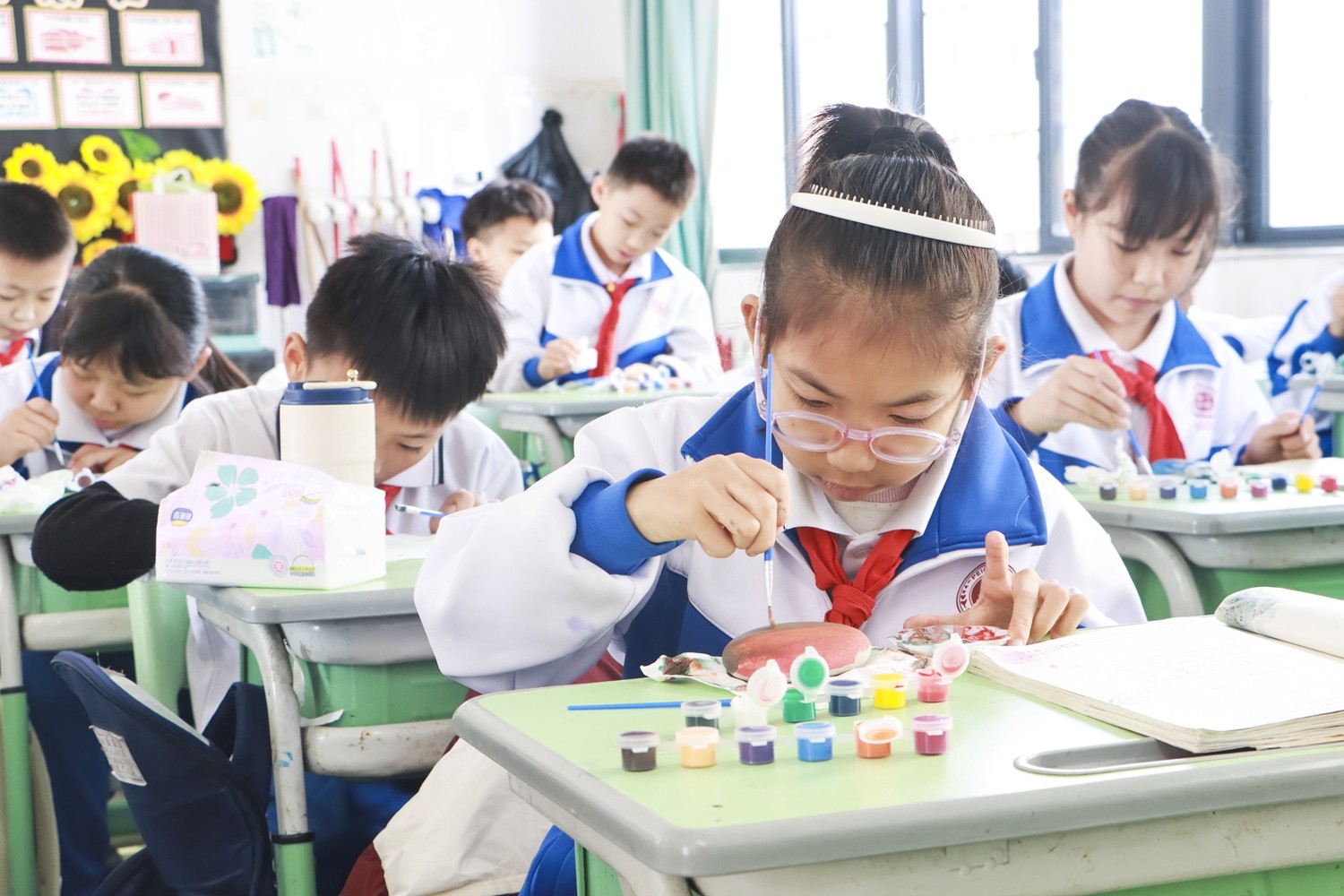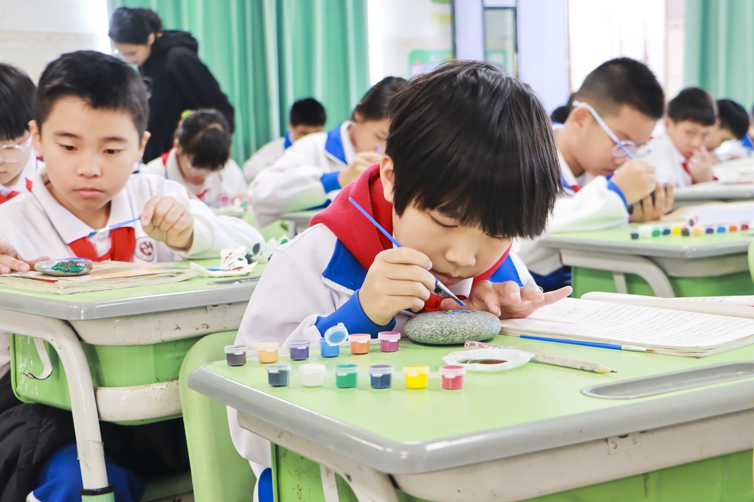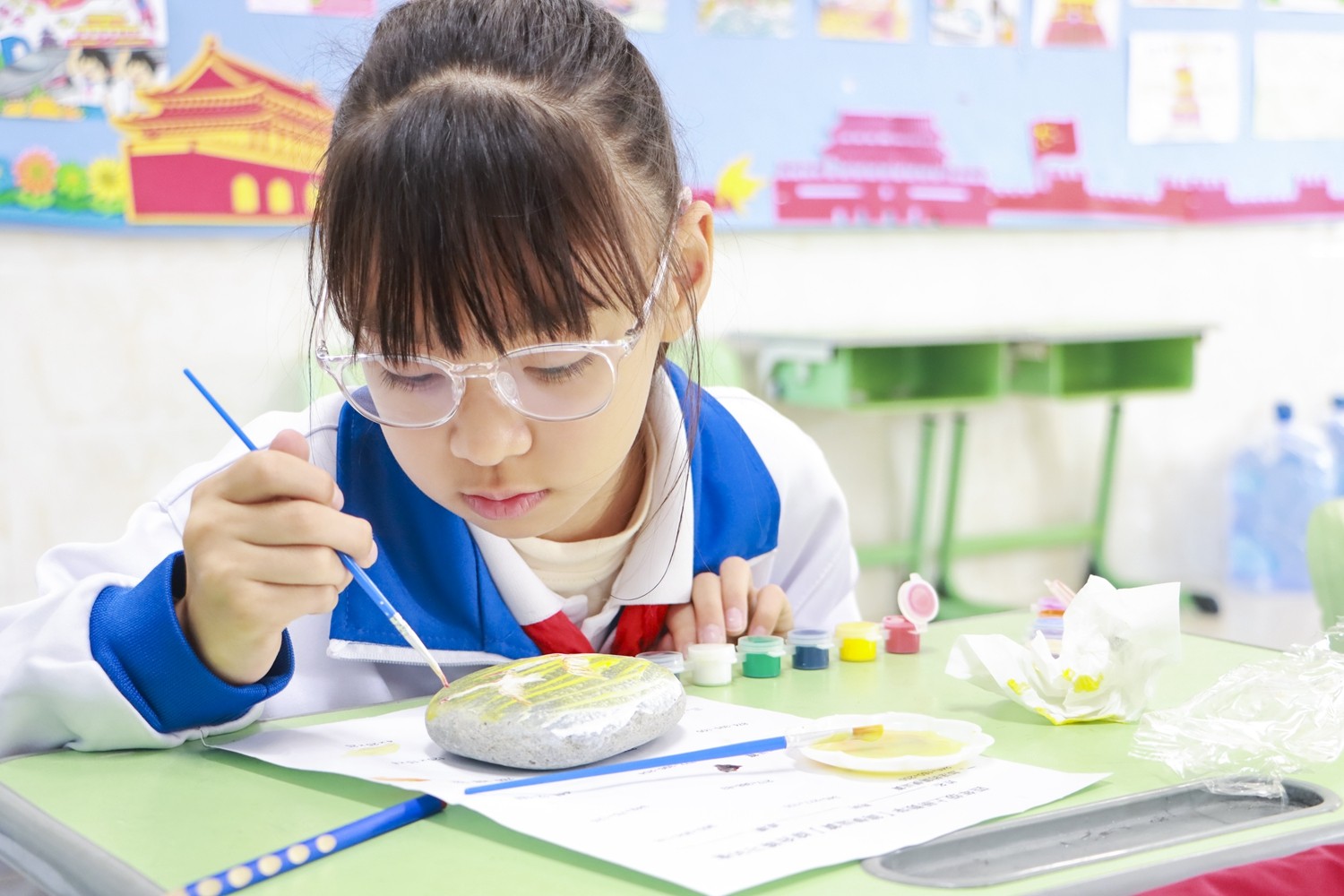 活动伊始,教室便化作静谧而热烈的创作天地。孩子们围坐桌前,手捧形状各异的石头,眼中闪烁着跃跃欲试的光芒。选定本学期最心仪的课文后,调色、勾勒、点染……一方方石头上,课文的灵魂被色彩悄然唤醒。