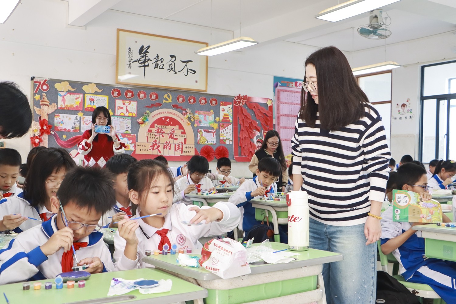 活动现场温情流淌。学校领导走进一个个专注的创作角落,俯身细看孩子们笔下的乾坤。他们为《精卫填海》中传递的毅力点头称赞,被《走月亮》的静谧诗意深深吸引,更与孩子们亲切交流画作背后的思考。这份温暖的注视与真诚的鼓励,让创作的火花燃得更旺,也让教育的温度在无声中传递。