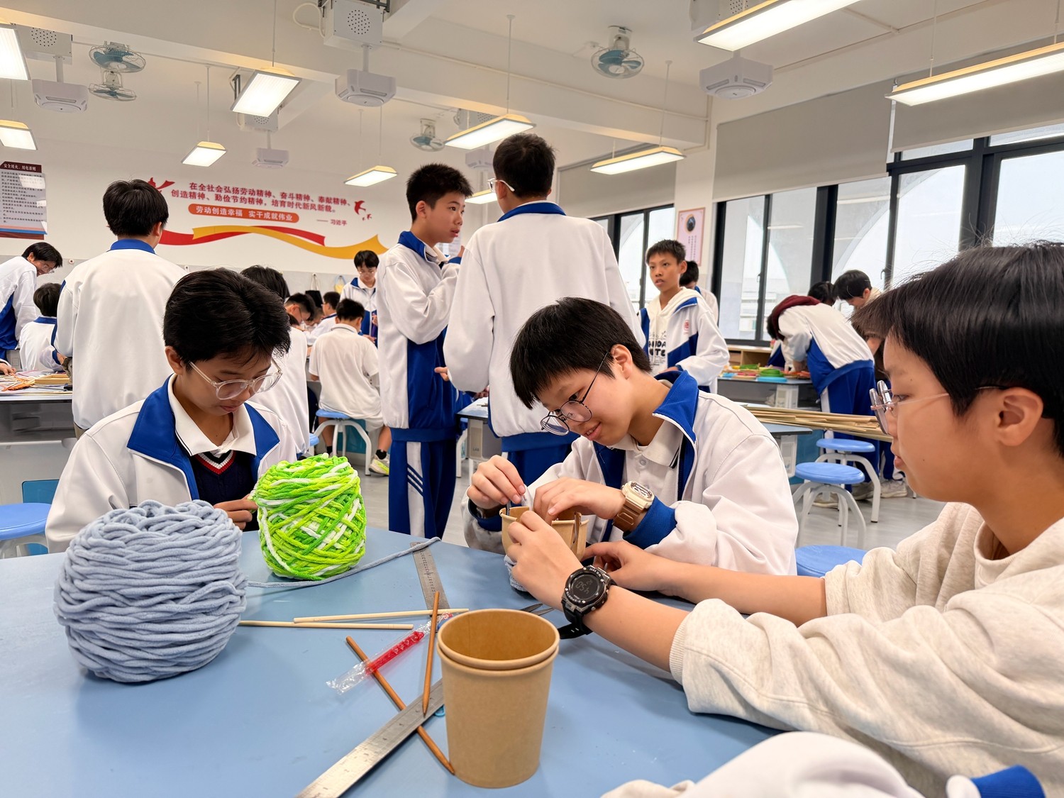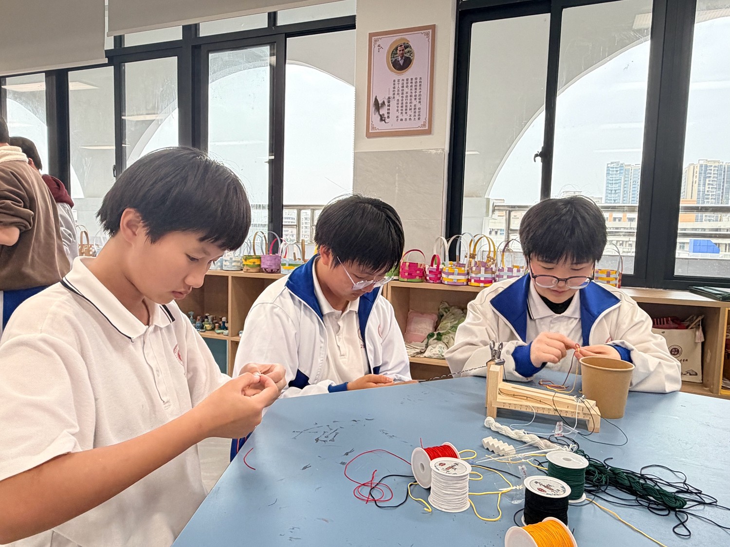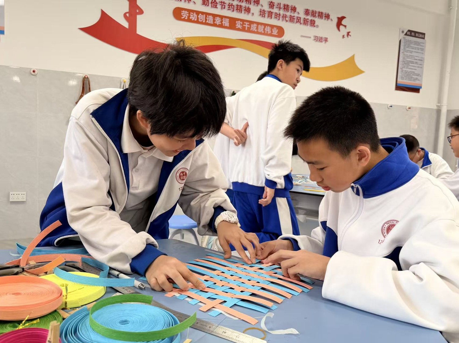 活动现场氛围热烈而有序。在初一 1至17班的编织赛场中,选手们手指灵活穿梭于彩绳和编织带之间,挑、编、绕、结等动作娴熟流畅。在规定创作时间里,同学们制作出各具特色的编织作品,既有精致的贴画,也有实用的小摆件等。创作过程中,大家耐心专注,互帮互助,在经纬交织中体悟手工技艺的魅力,感受劳动带来的成就感,充分展现了精益求精的工匠精神。