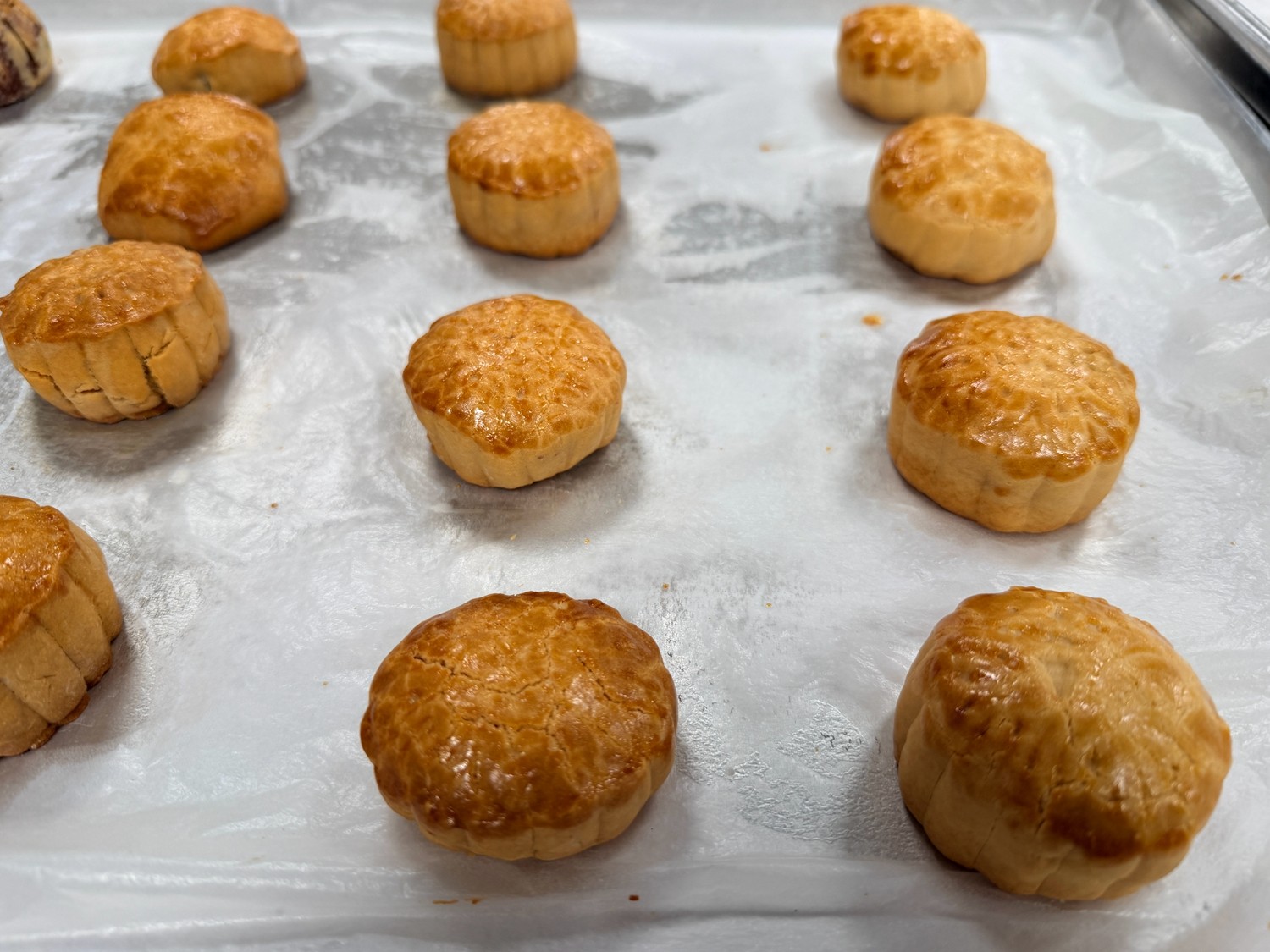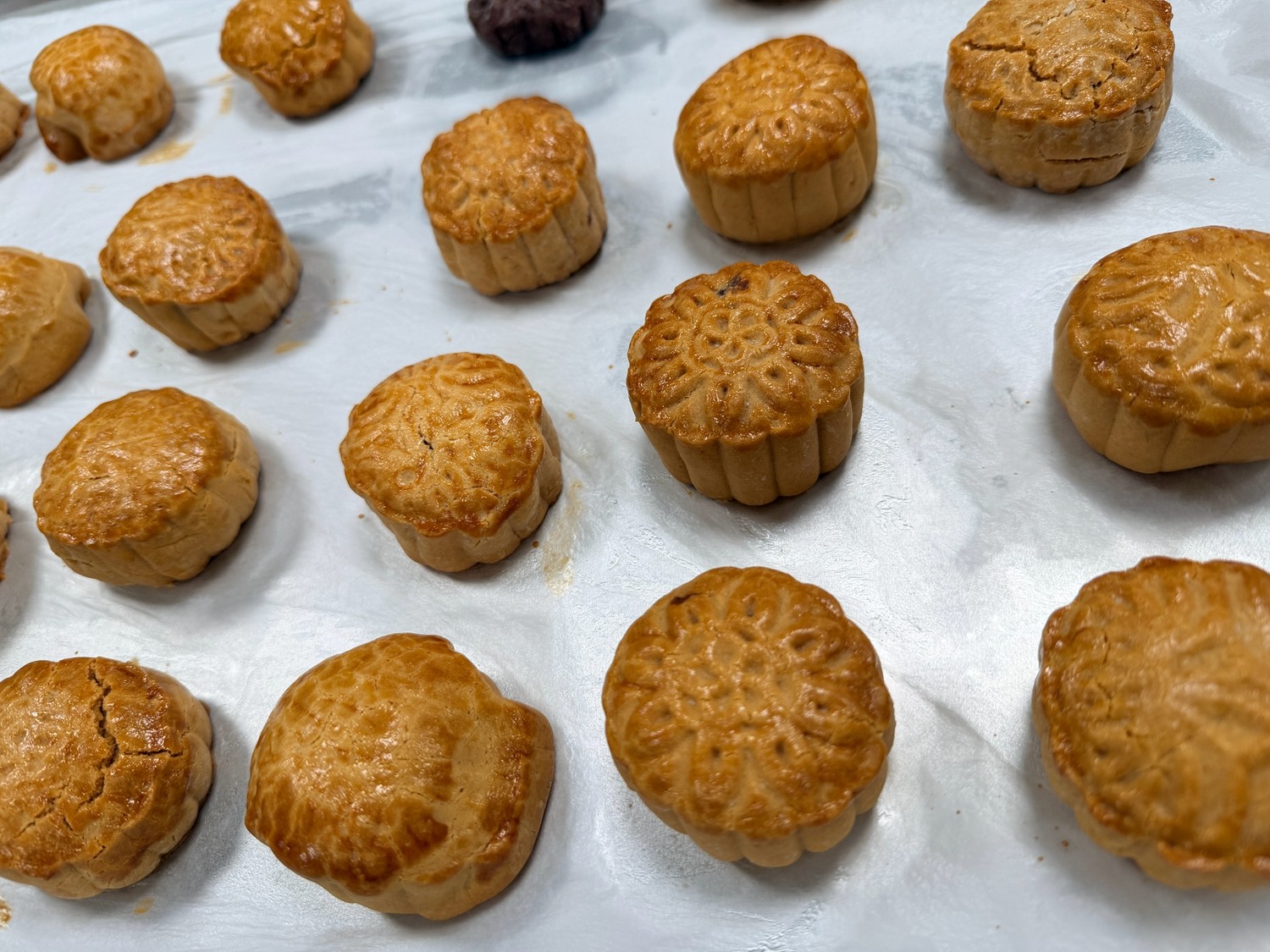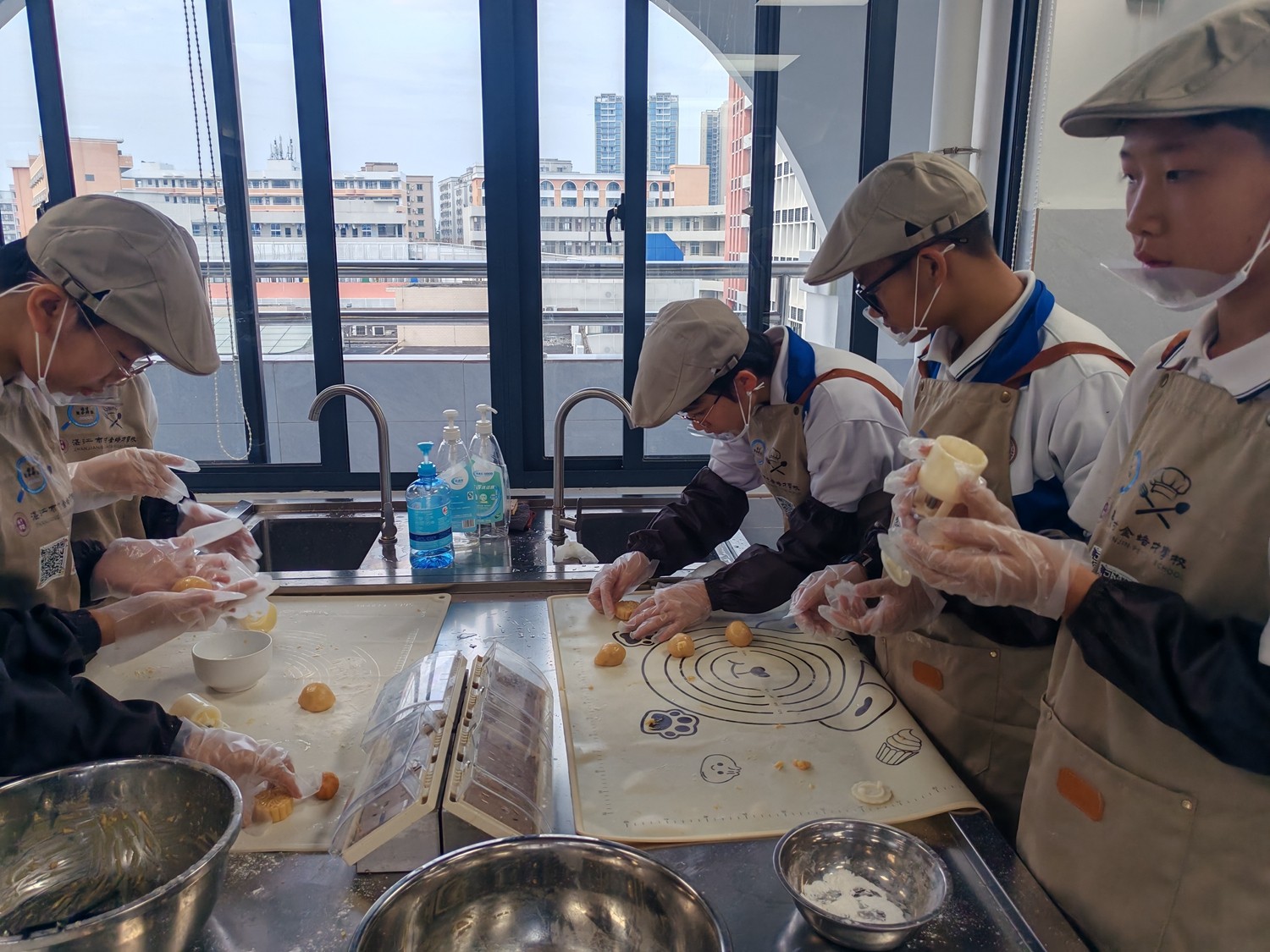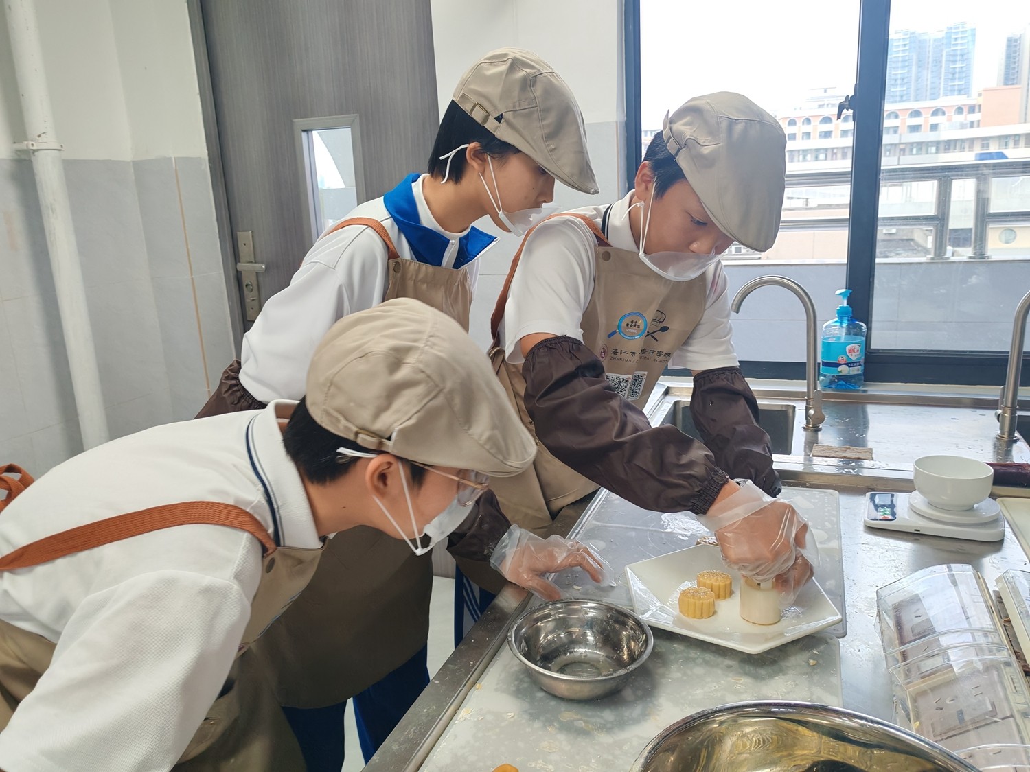 与此同时,初一18至34班的月饼制作赛场内,各班 3 人小组分工明确、默契配合。称量食材、揉制饼皮、包入馅料、按压塑形,同学们专注投入每一个环节,将面团塑造成规整的圆形,通过模具压出清晰精美的花纹。从食材搭配到手工塑形,大家在实践中掌握基础烹饪技巧,制作出一个个香气十足的广式月饼,操作台的洁净整洁、工具材料的有序摆放,也体现出良好的劳动习惯。