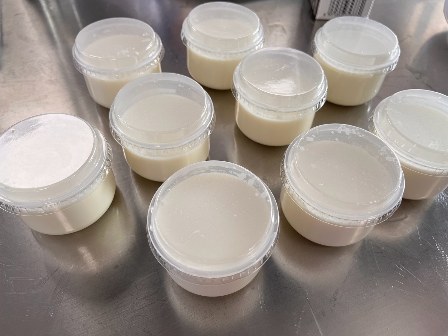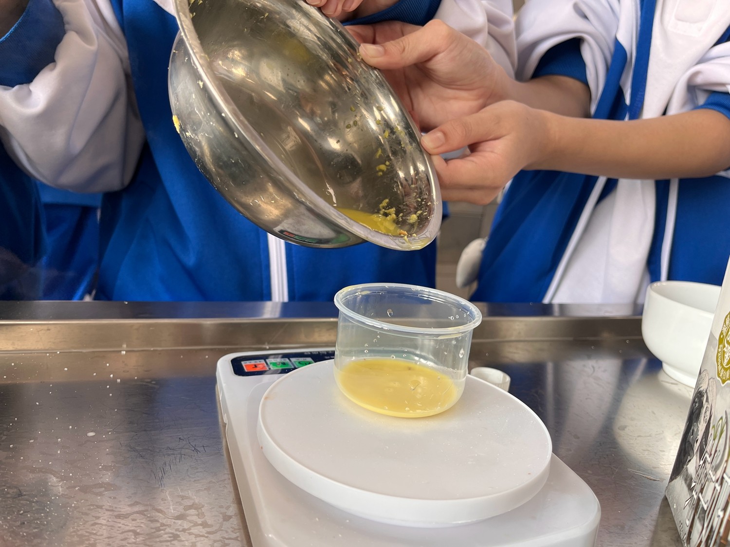 课程第一阶段,同学们课余时间搜集资料并分享,老师结合岭南饮食文化,讲述了姜撞奶从明末清初民间巧思到成为省级非遗项目的传奇故事,介绍了这道甜品驱寒滋补的养生功效与 "姜辣素遇乳蛋白凝结" 的科学原理。在实践阶段,同学们分组有序开展操作:精选表皮粗糙的老黄姜,用纱布细细过滤出纯净姜汁;将水牛奶与细砂糖一同慢煮,精准把控 70-75℃的 "黄金温度";从高处快速冲撞倒入姜汁,盖上盖子静静等待凝结,整个过程既考验耐心又充满趣味。