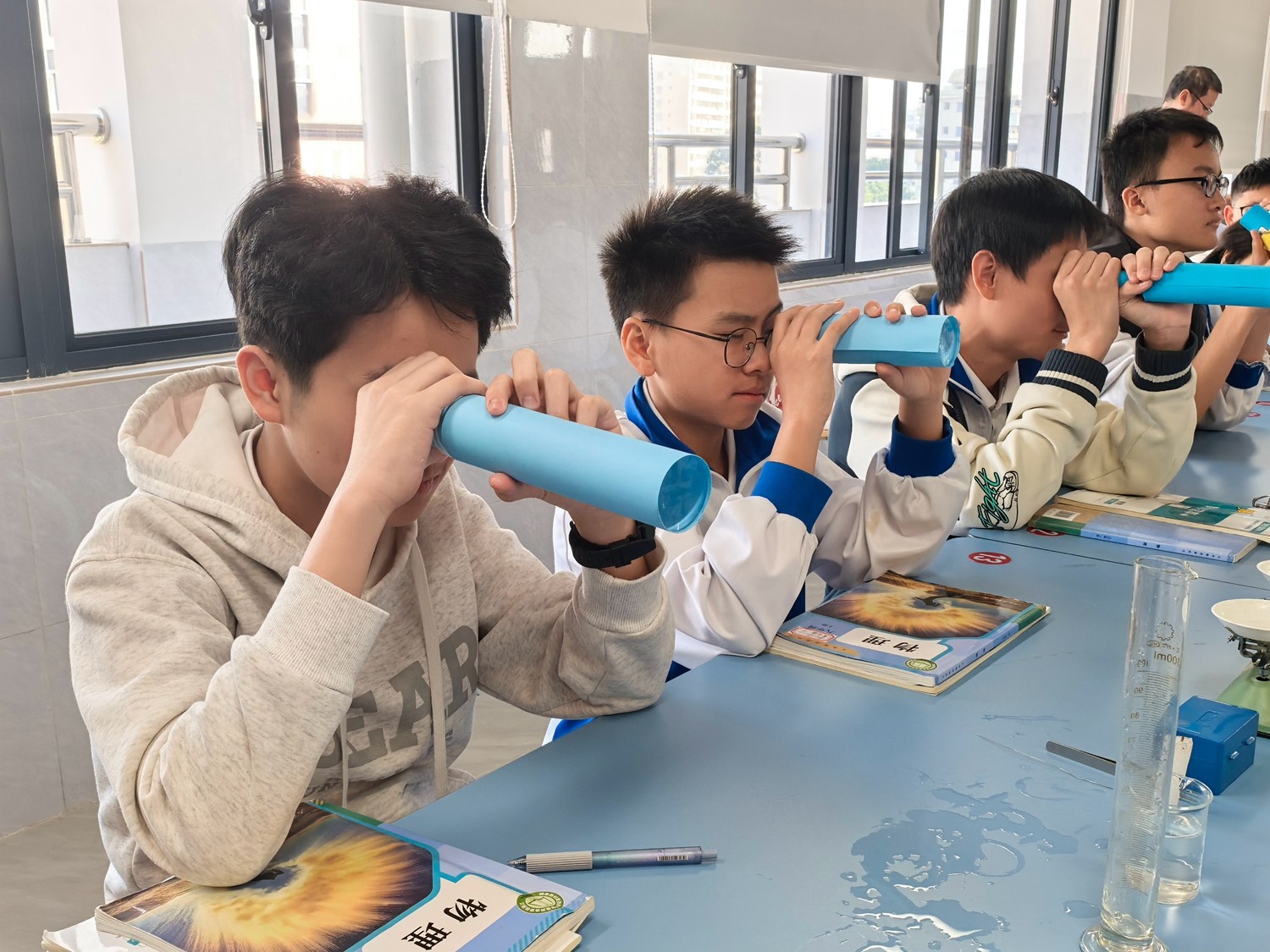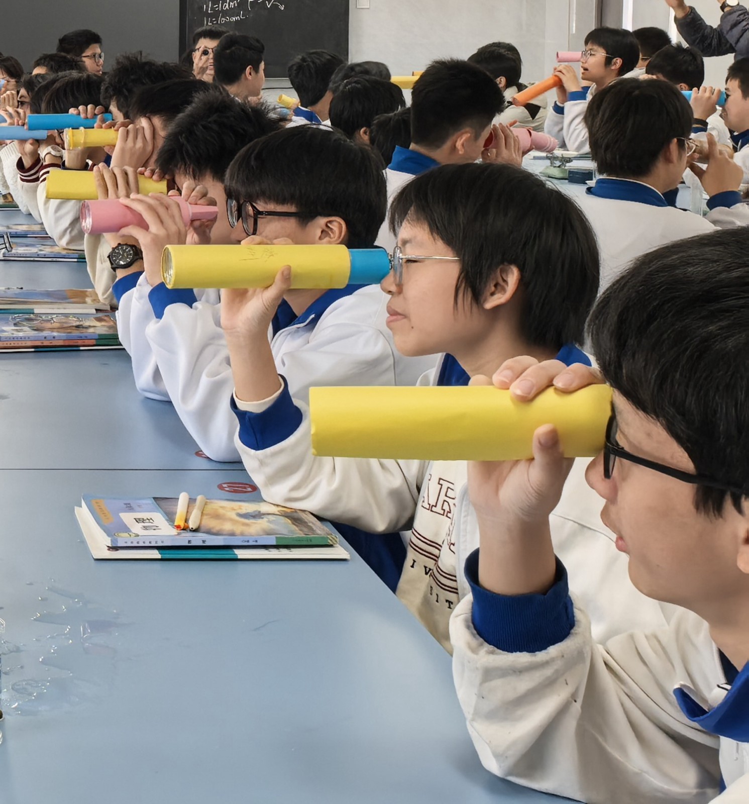 近日,我校八年级物理课堂上热闹非凡。同学们手持亲手制作的望远镜,在教学楼间测试成像效果——远处楼体的棱角清晰可见,操场旗杆上的国旗纹路分明。这场以“透镜及其应用”为主题的跨学科实践活动,让抽象的物理知识变成了可触摸的“科学玩具”,更点燃了学生对科学探索的熊熊热情。