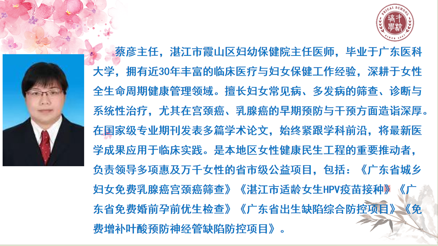 紧接着,湛江市霞山区妇幼保健院蔡彦主任带来题为《主动健康,‘更’健康‘更’美丽》的女性健康知识讲座。蔡主任结合女教职工的职业特点与生理特点,从“健康意义、身体认知、疾病预防”三个维度展开了细致讲解。针对职场女性常见的健康困扰,蔡主任普及了生殖系统基础常识,涵盖乳腺保健、HPV疫苗接种知识、“两癌”免费筛查政策及各年龄段体检重点,为女性提供全周期健康指引。她还结合临床案例,提醒大家警惕虚假宣传陷阱,引导大家树立科学就医观念,遇到健康问题及时前往正规医疗机构咨询。