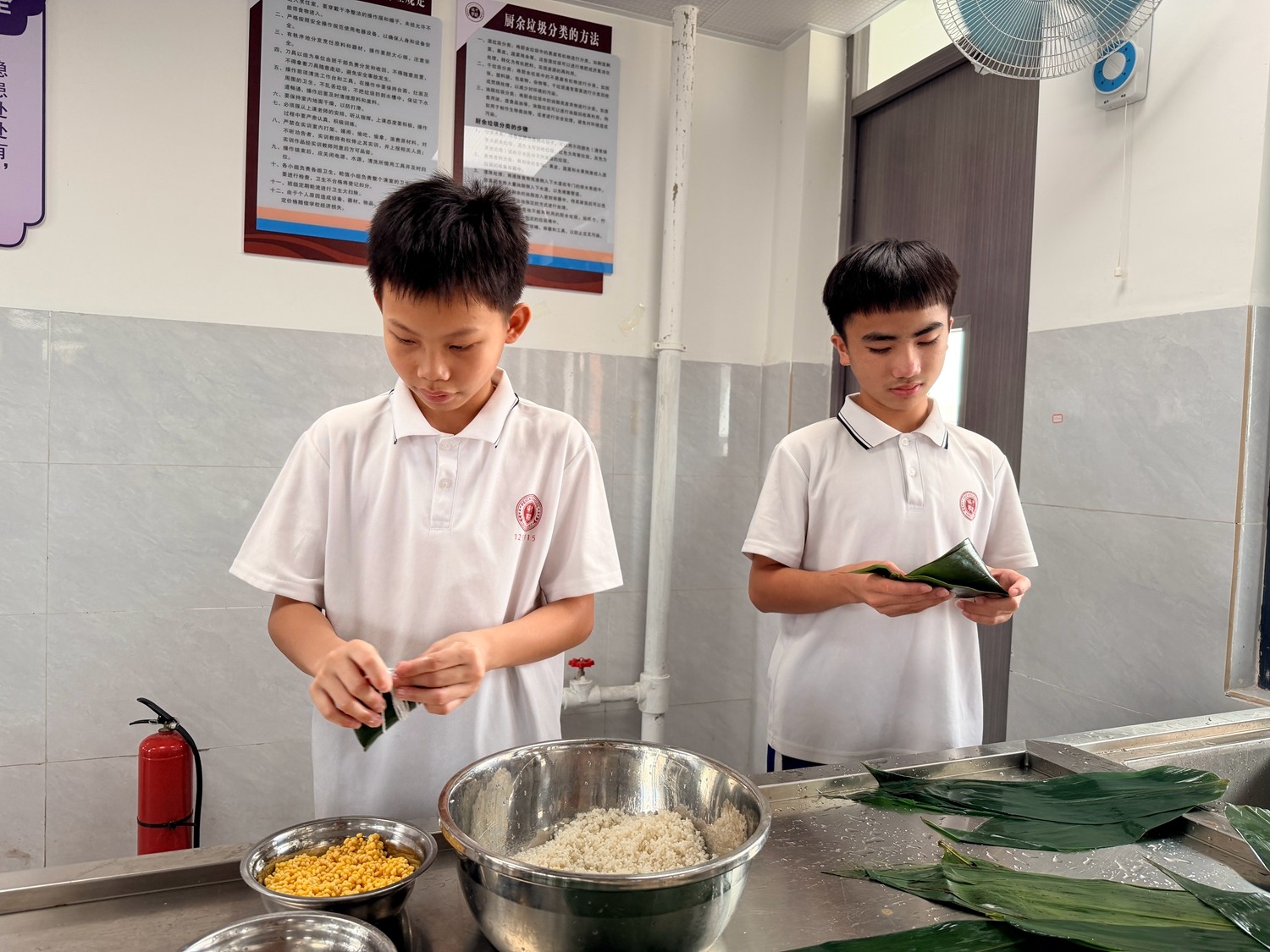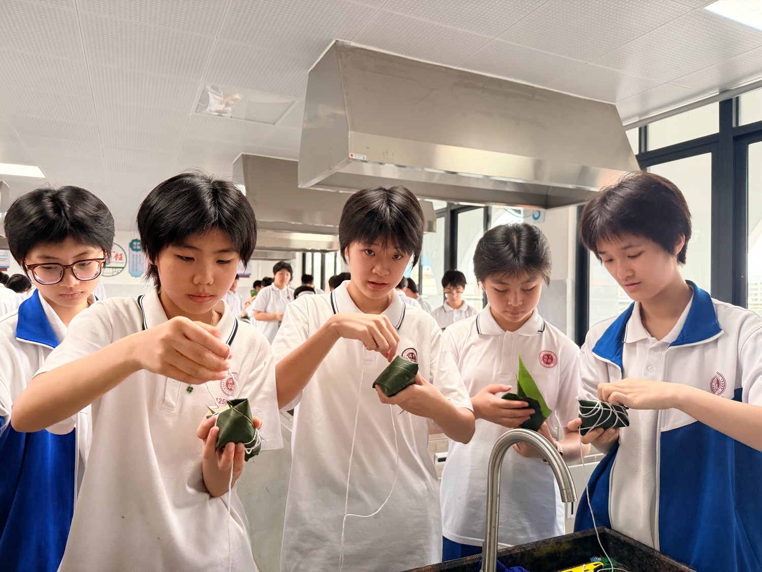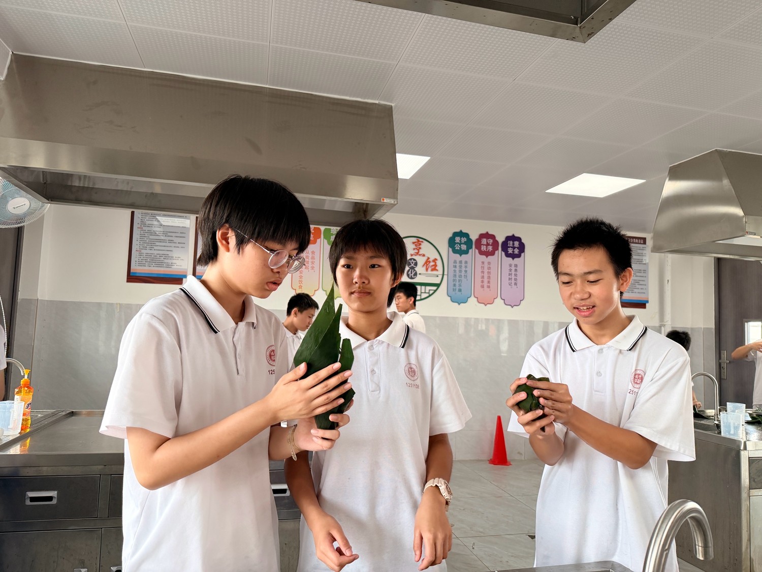第二阶段,热闹的实践环节正式开启。烹饪教室里,粽叶、糯米、五花肉、绿豆等食材整齐摆放,同学们分组协作、分工明确,在老师的指导下,有条不紊地投入到粽子制作中。铺粽叶、填糯米、放馅料、折粽叶、捆棉线,一系列动作从生疏笨拙到熟练流畅,大家互帮互助、相互请教,有的同学认真调整粽叶的角度,有的同学仔细把控馅料的用量,有的同学耐心学习捆扎技巧,生怕一个疏忽影响了粽子的造型。